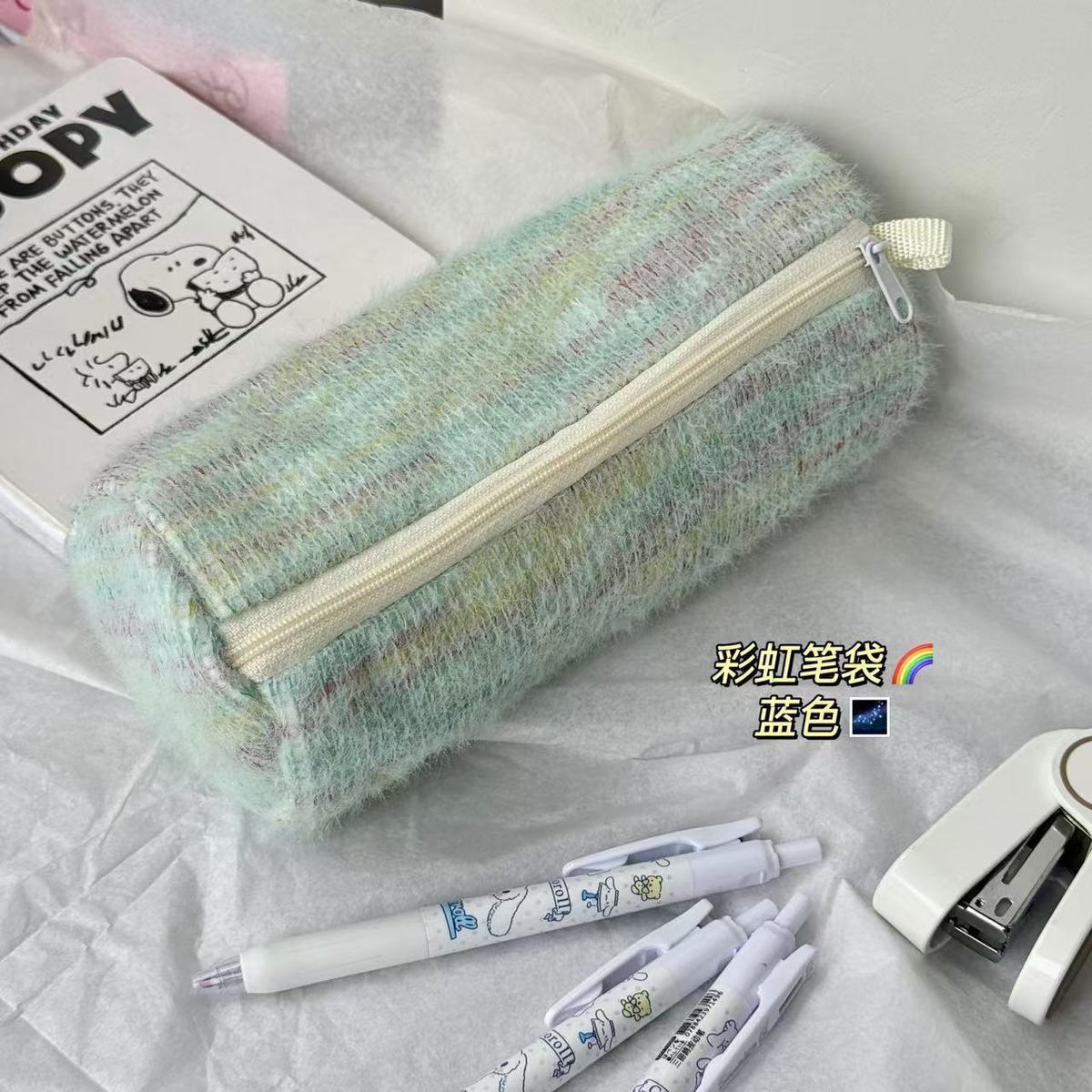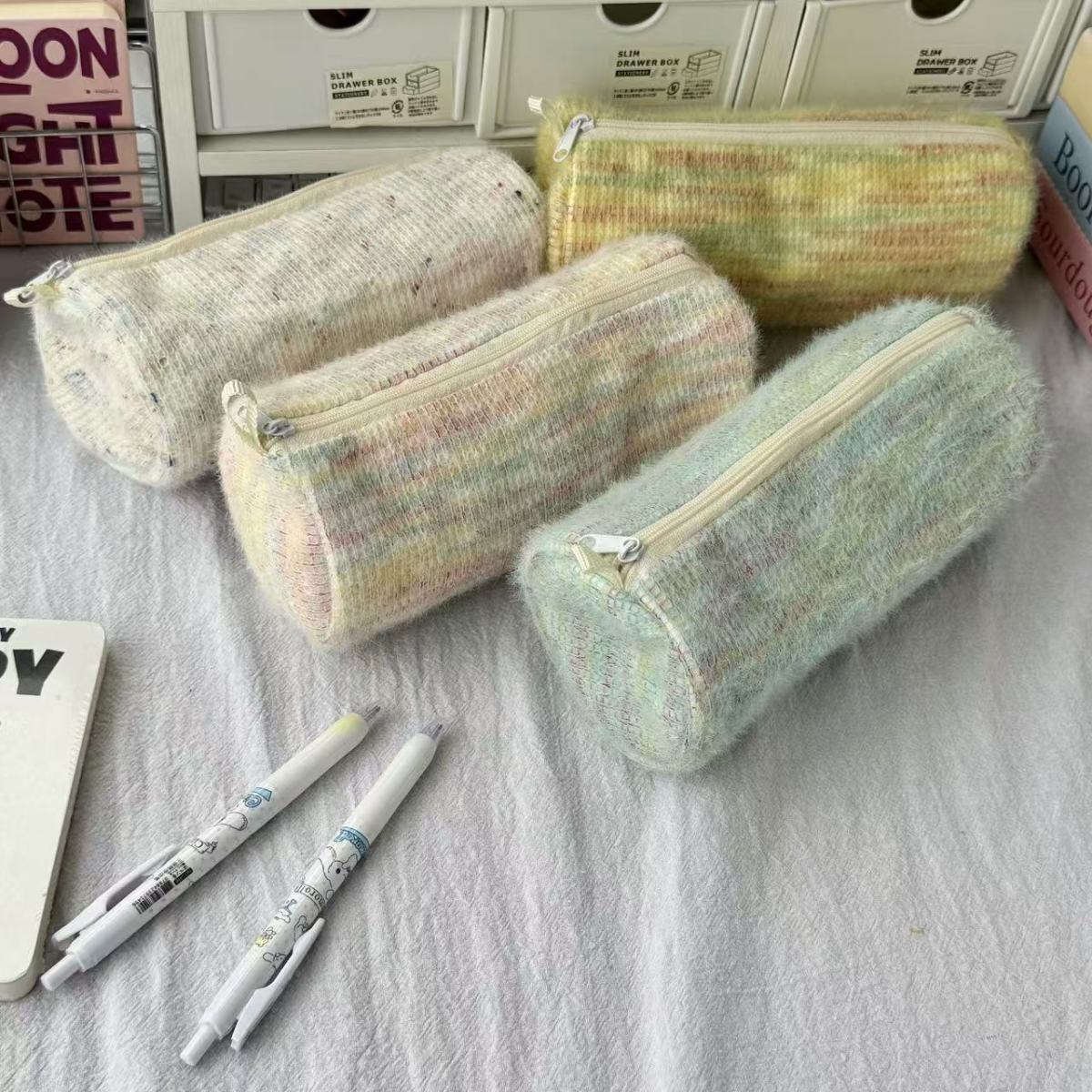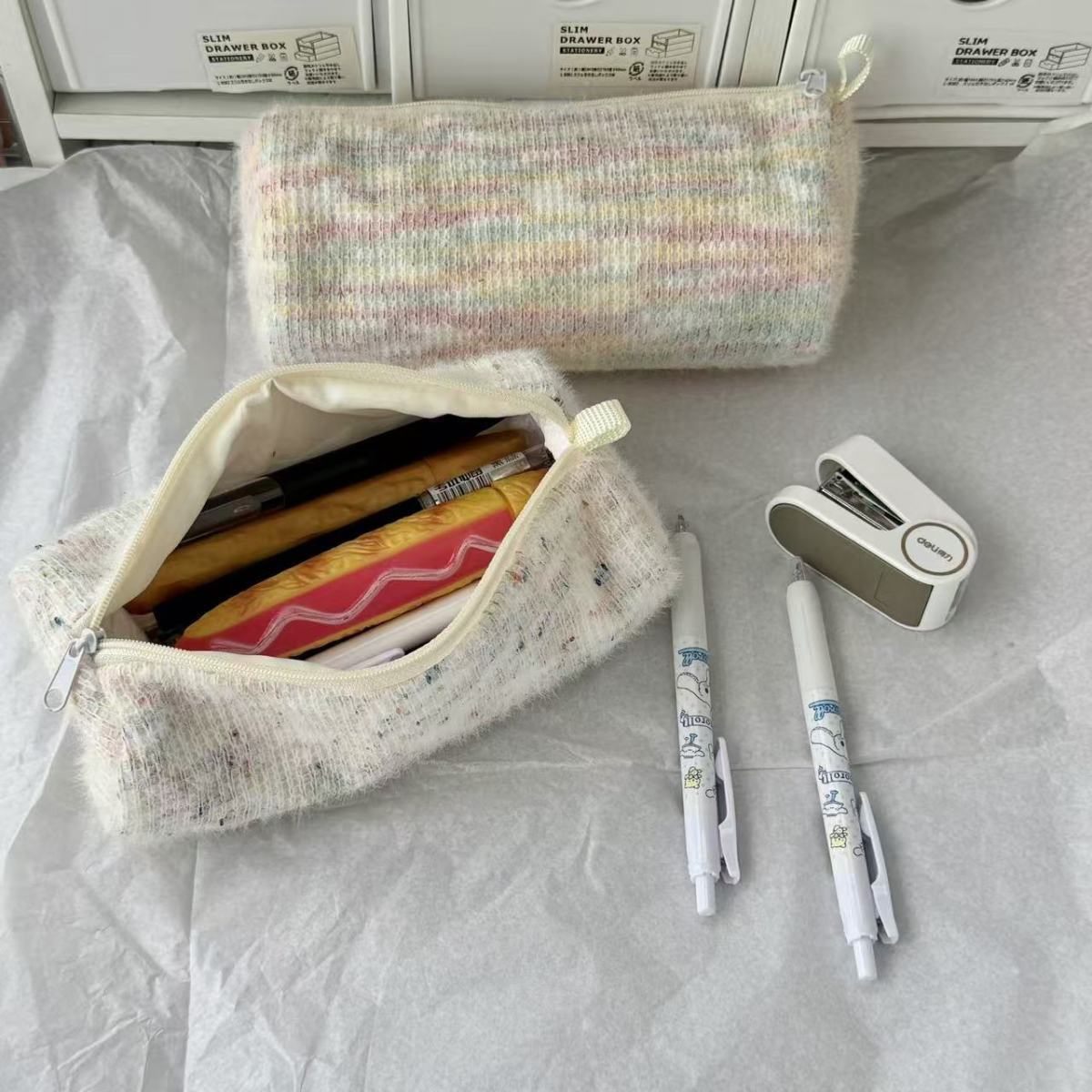 고급스러운 플러시 향기로운 펜 가방, 대용량, 원통형, 신선한 격자 무늬 줄무늬 짠 휴대용 문구 상자스토어 가기