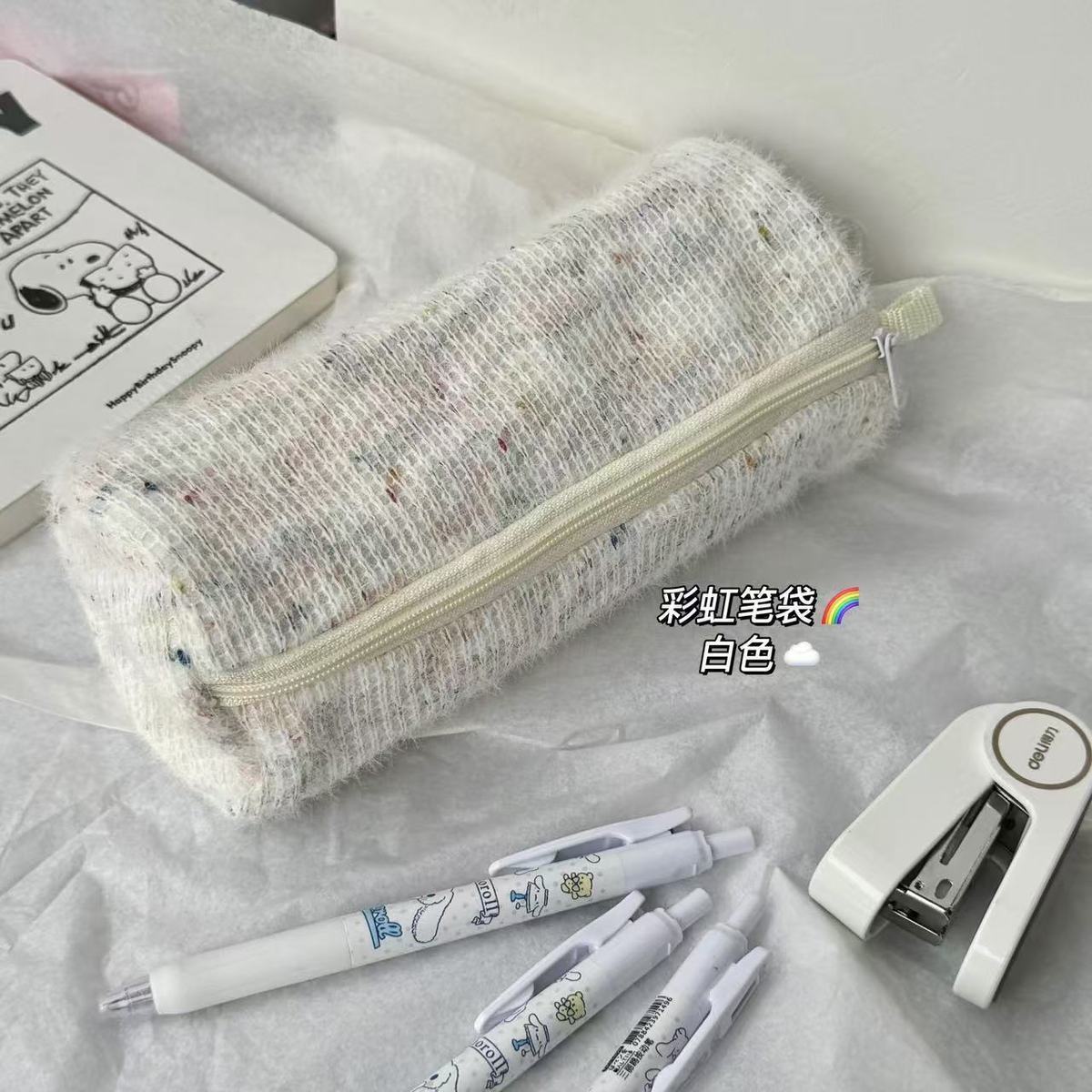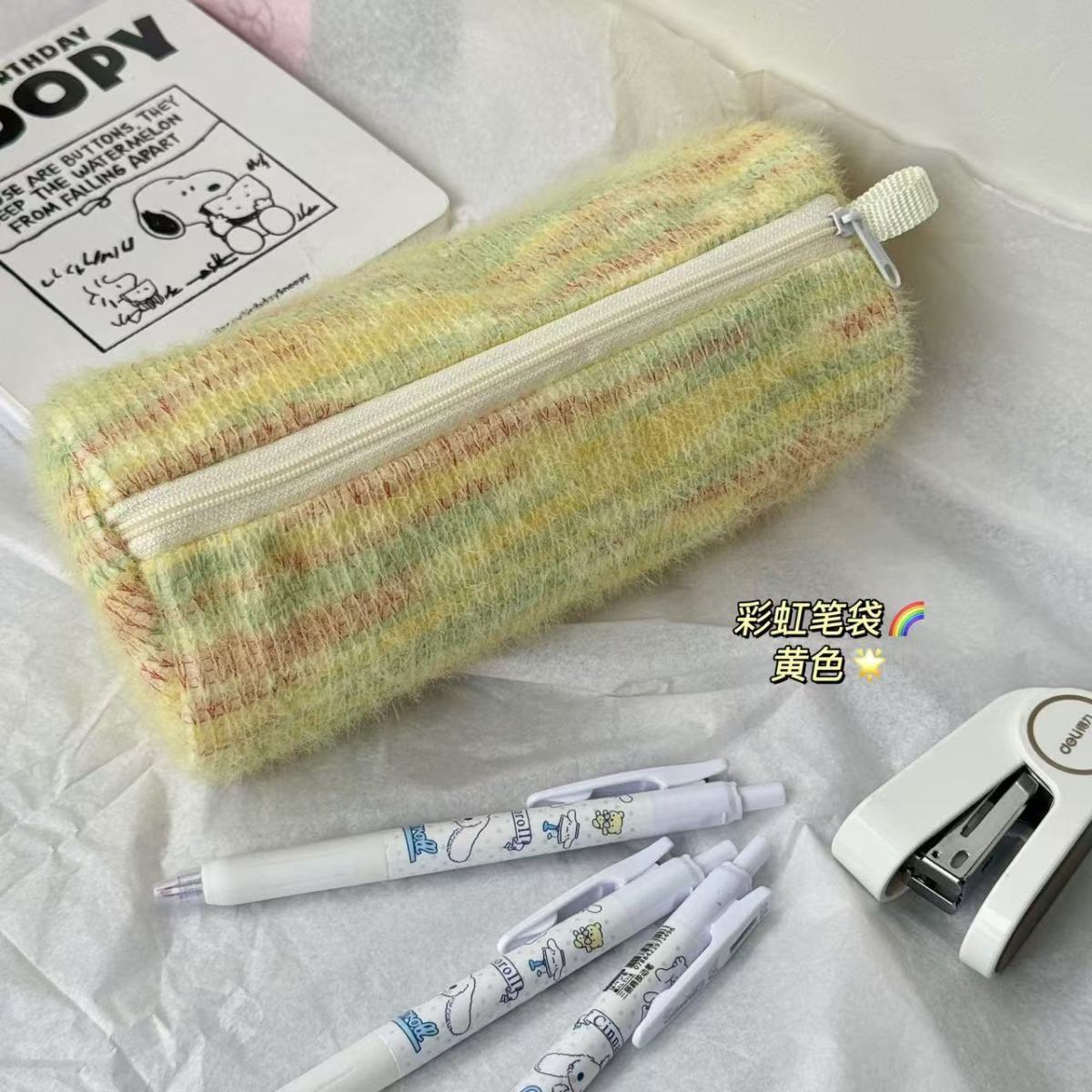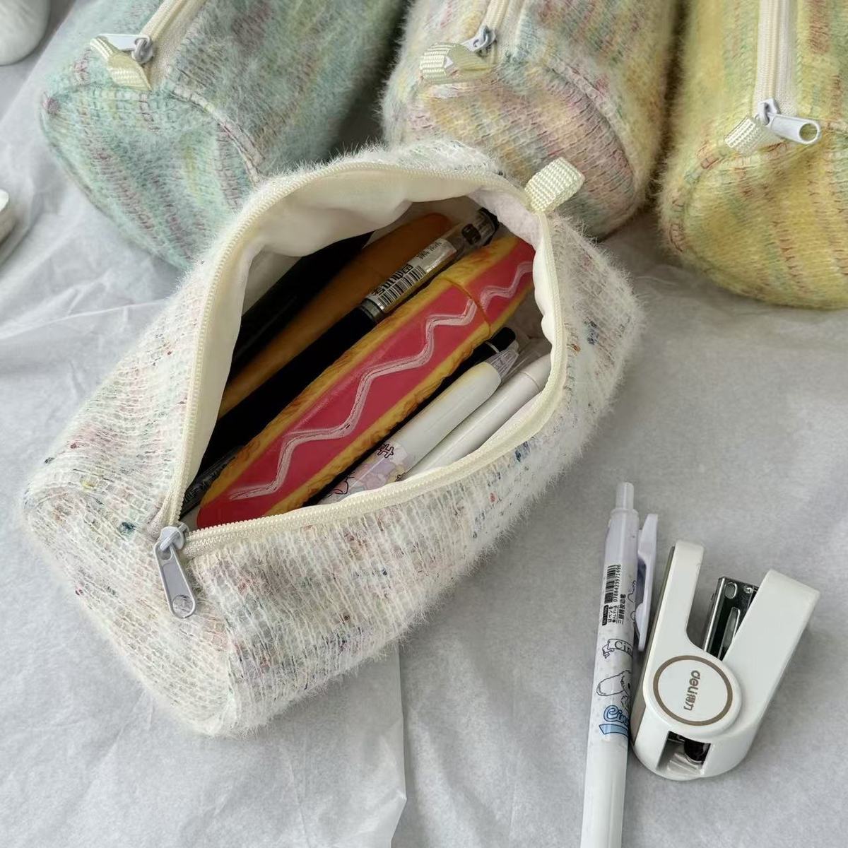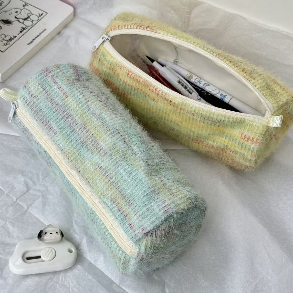 고급스러운 플러시 향기로운 펜 가방, 대용량, 원통형, 신선한 격자 무늬 줄무늬 짠 휴대용 문구 상자스토어 가기