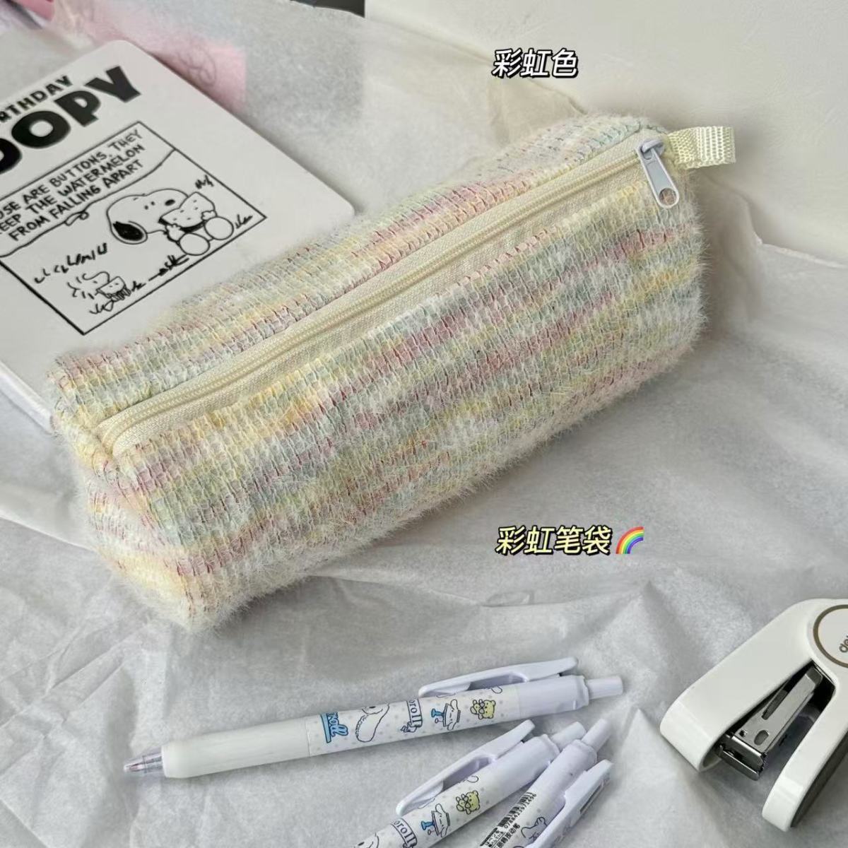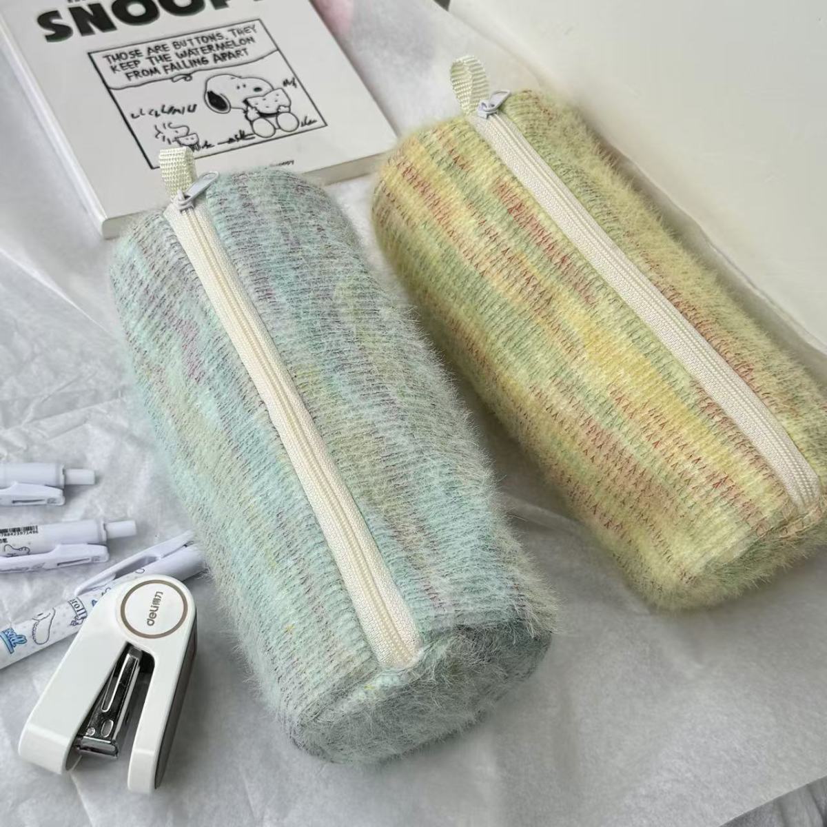 고급스러운 플러시 향기로운 펜 가방, 대용량, 원통형, 신선한 격자 무늬 줄무늬 짠 휴대용 문구 상자