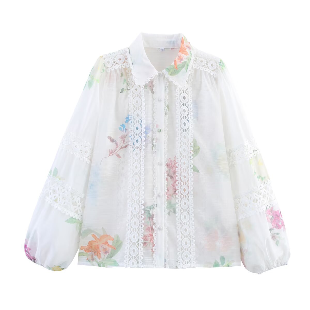 UC&ZA 크로스보더 유럽과 미국 스타일의 여성 의류 프렌치 우아한 기질 복고풍 프린트 중공 스플라이스 쉬폰 루즈 셔츠