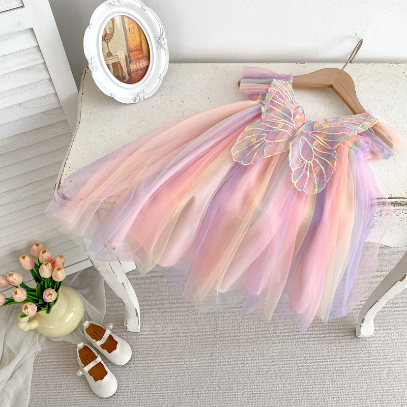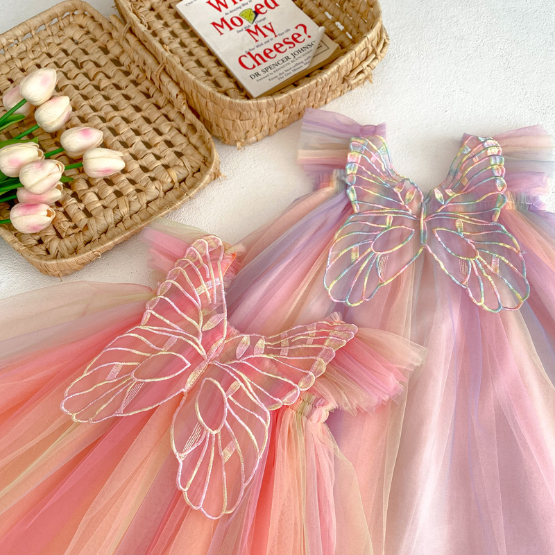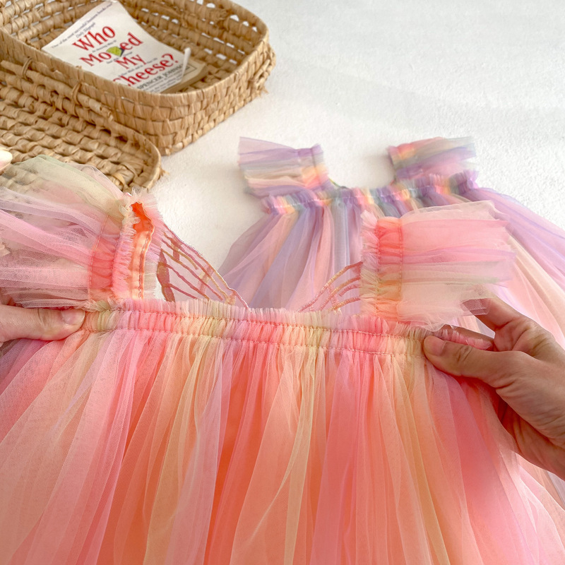 무지개 날개 메쉬 슈퍼 요정 소녀 드레스 2025 여름 스타일 플라잉 슬리브 아기 공주 드레스 투투 스커트스토어 가기