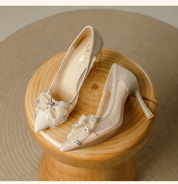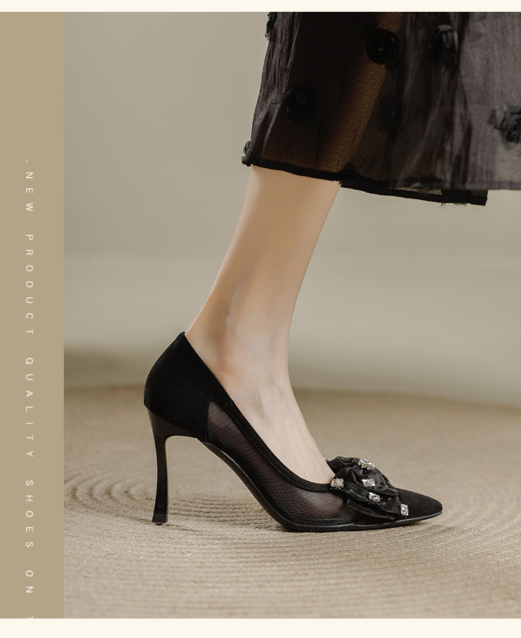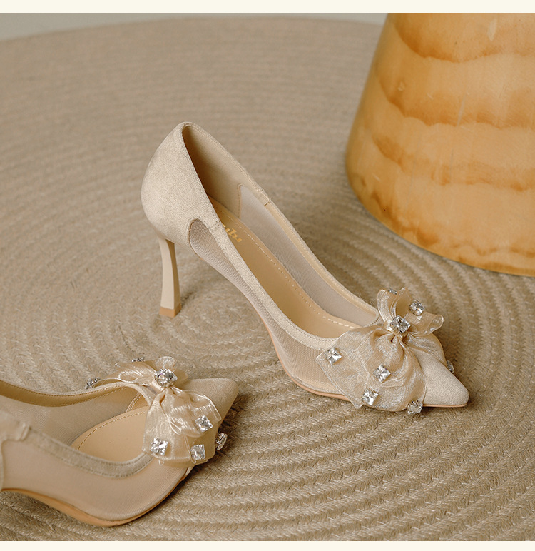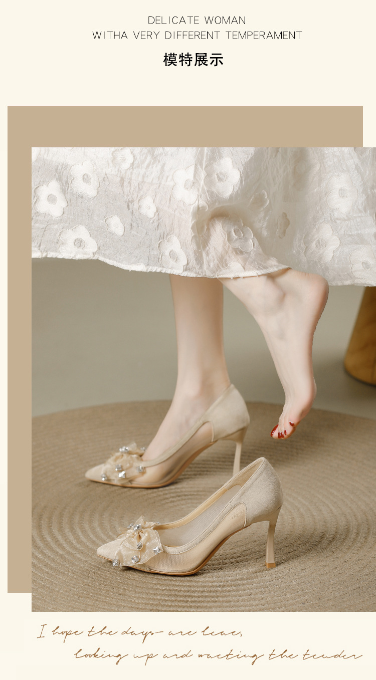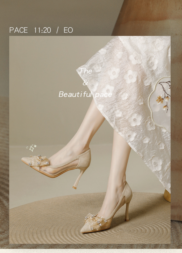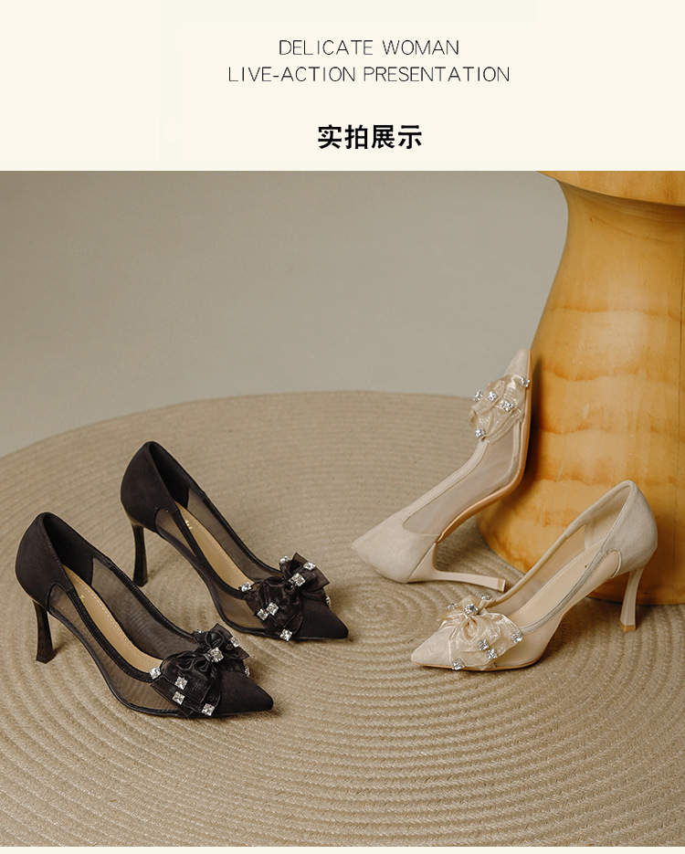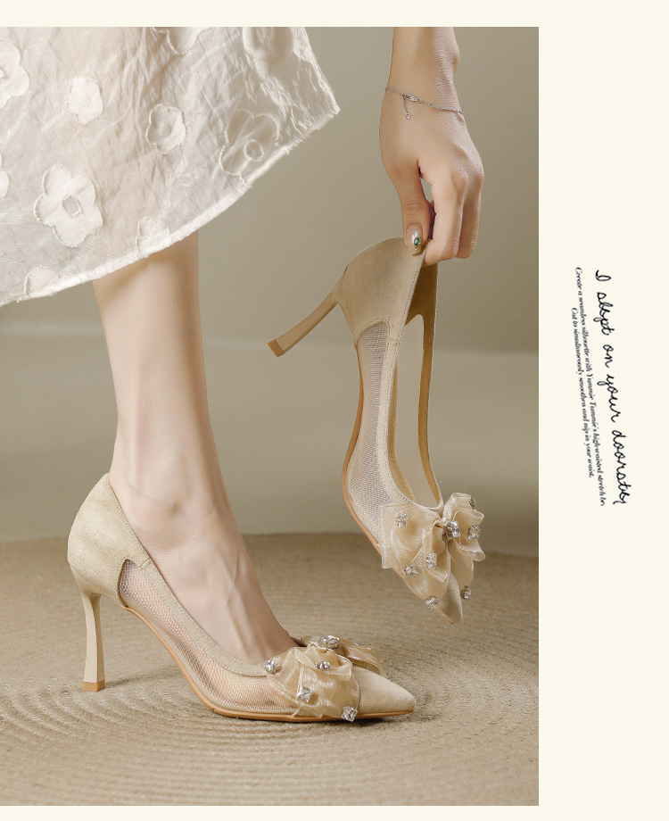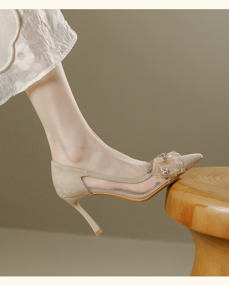 여성을위한 메쉬 스틸레토 힐 신발 2025 여름 새 스타일 스커트와 리본 매듭 부드러운 요정 스타일 펌프 하이힐스토어 가기