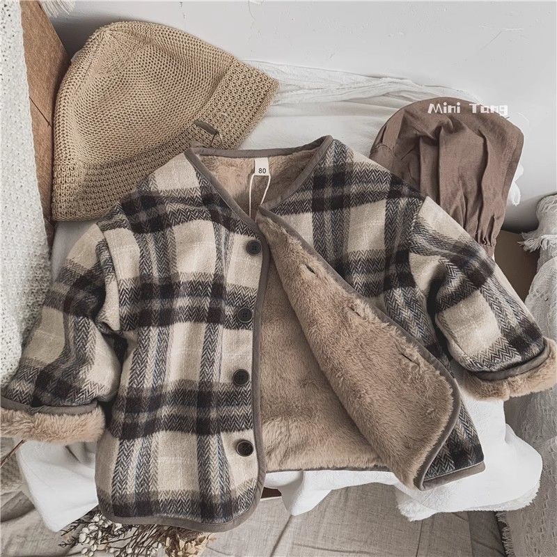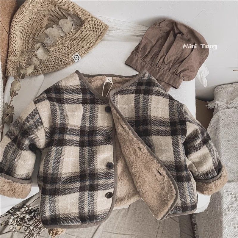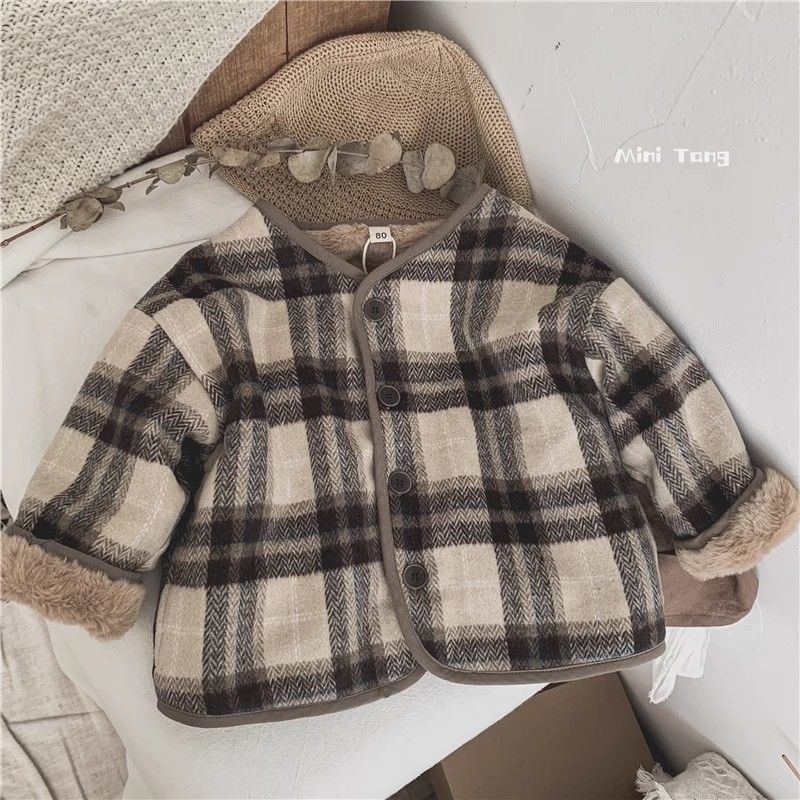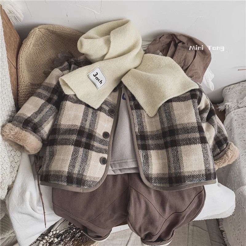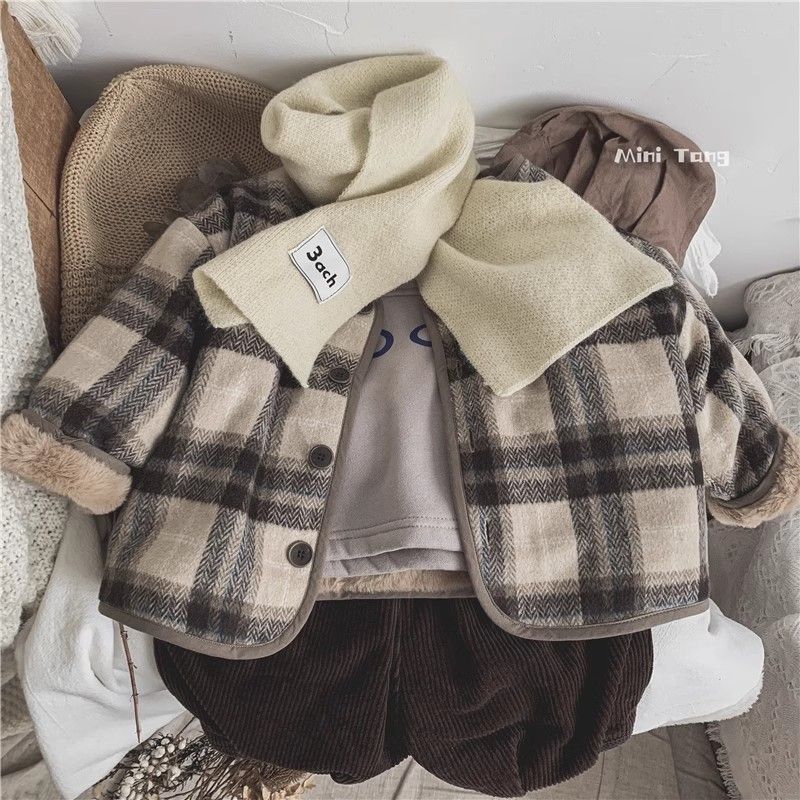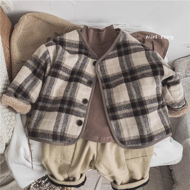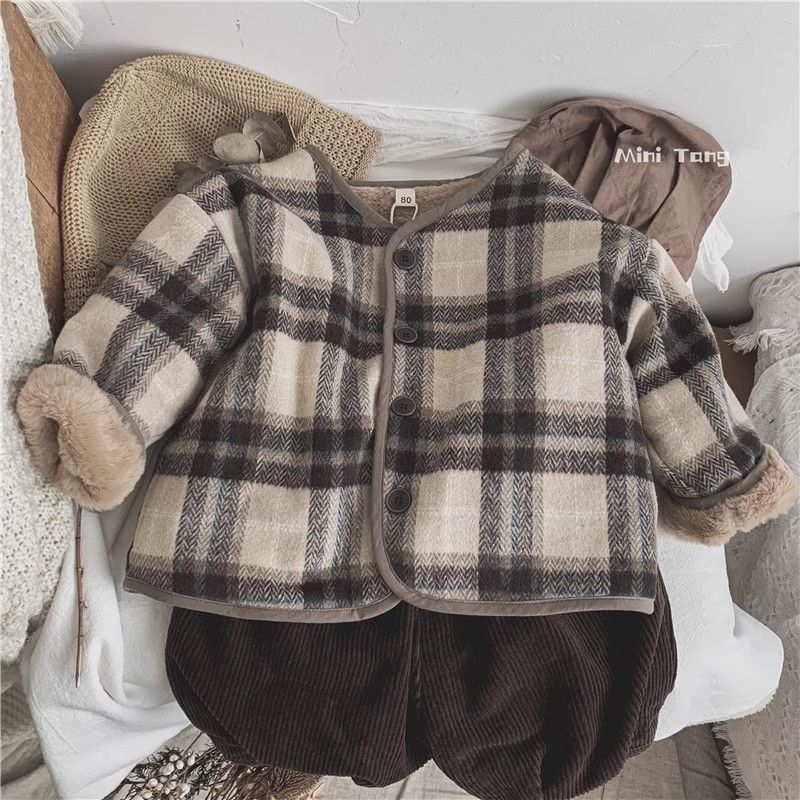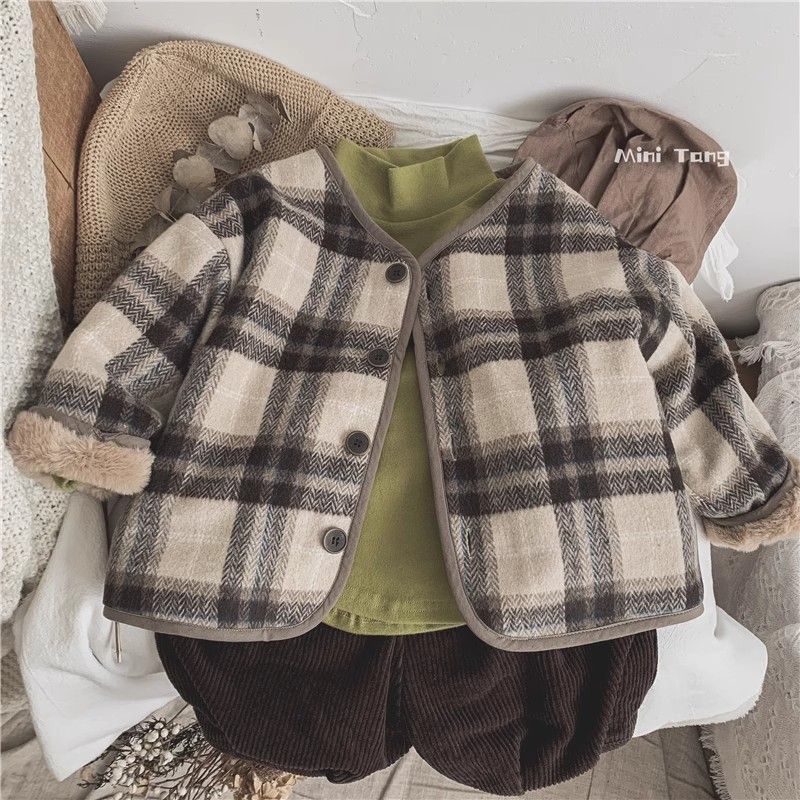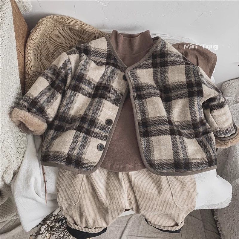 모직 격자 무늬 아동용 양털 재킷 한국 스타일 가을, 겨울 새 소년과 소녀 겉옷 느슨한 아기 면화 코트스토어 가기