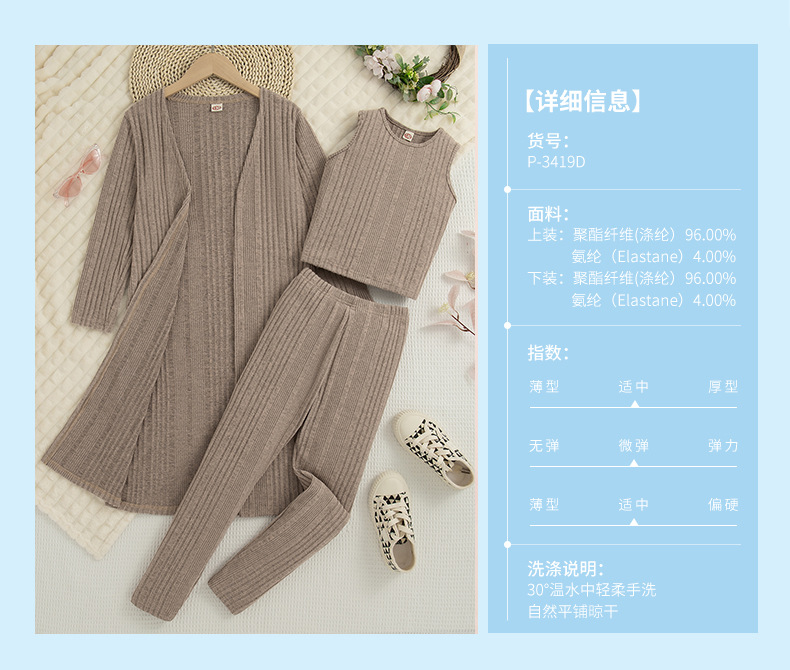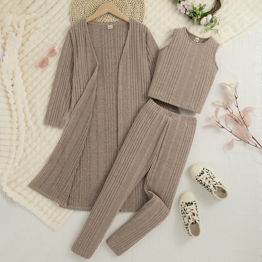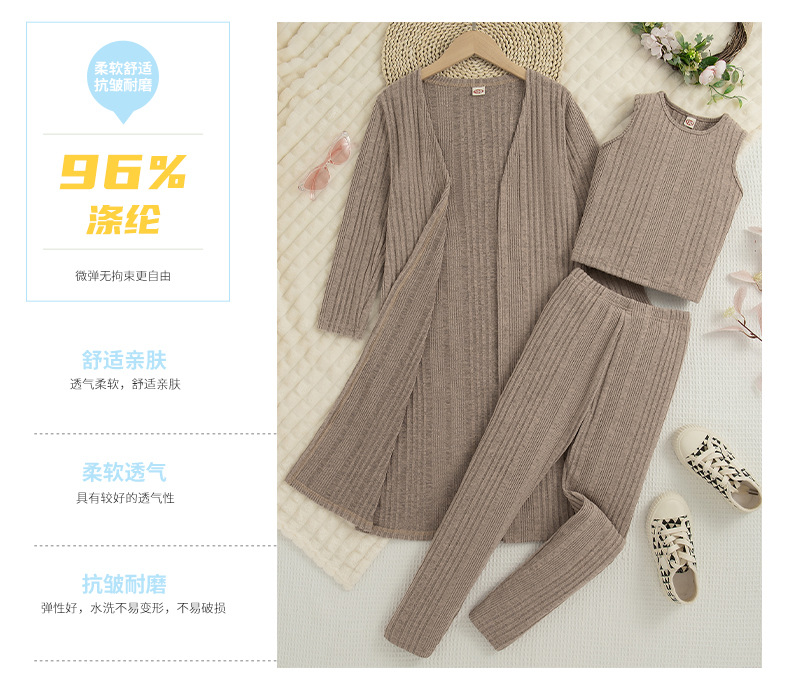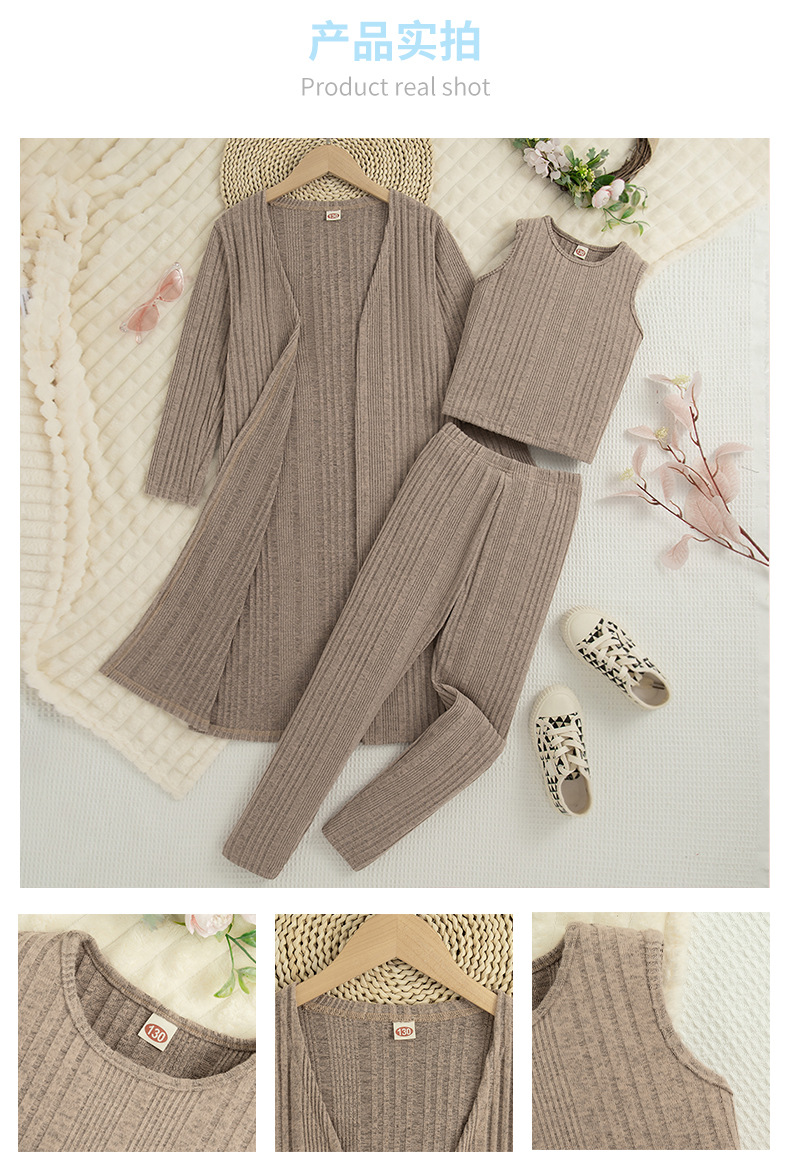 대외 무역 스타일 솔리드 컬러 캐주얼 정장 소녀 코트 라운드 넥 바닥 스웨터 바지 3 피스 세트 제조 업체 도매스토어 가기