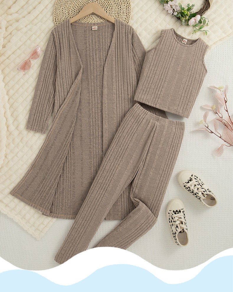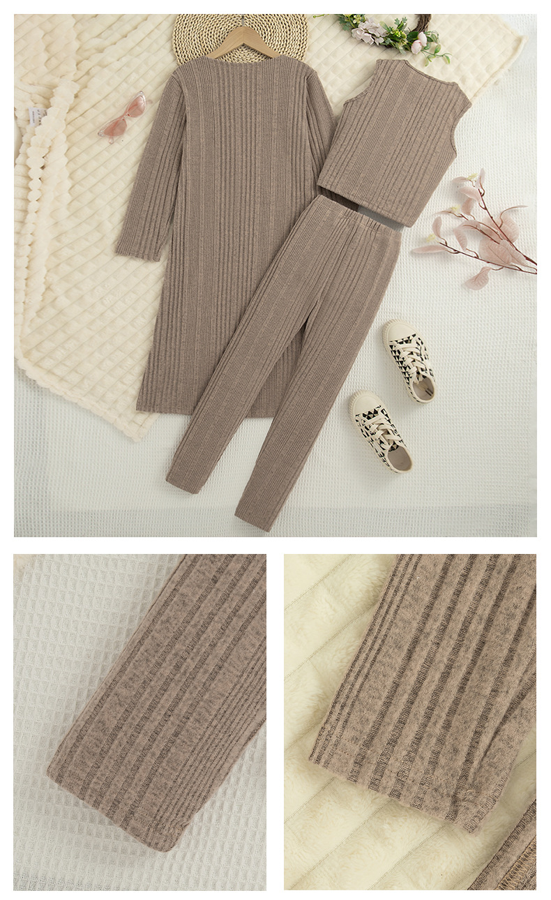 대외 무역 스타일 솔리드 컬러 캐주얼 정장 소녀 코트 라운드 넥 바닥 스웨터 바지 3 피스 세트 제조 업체 도매