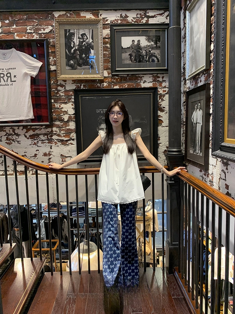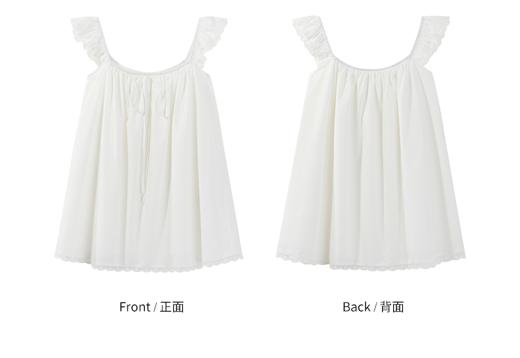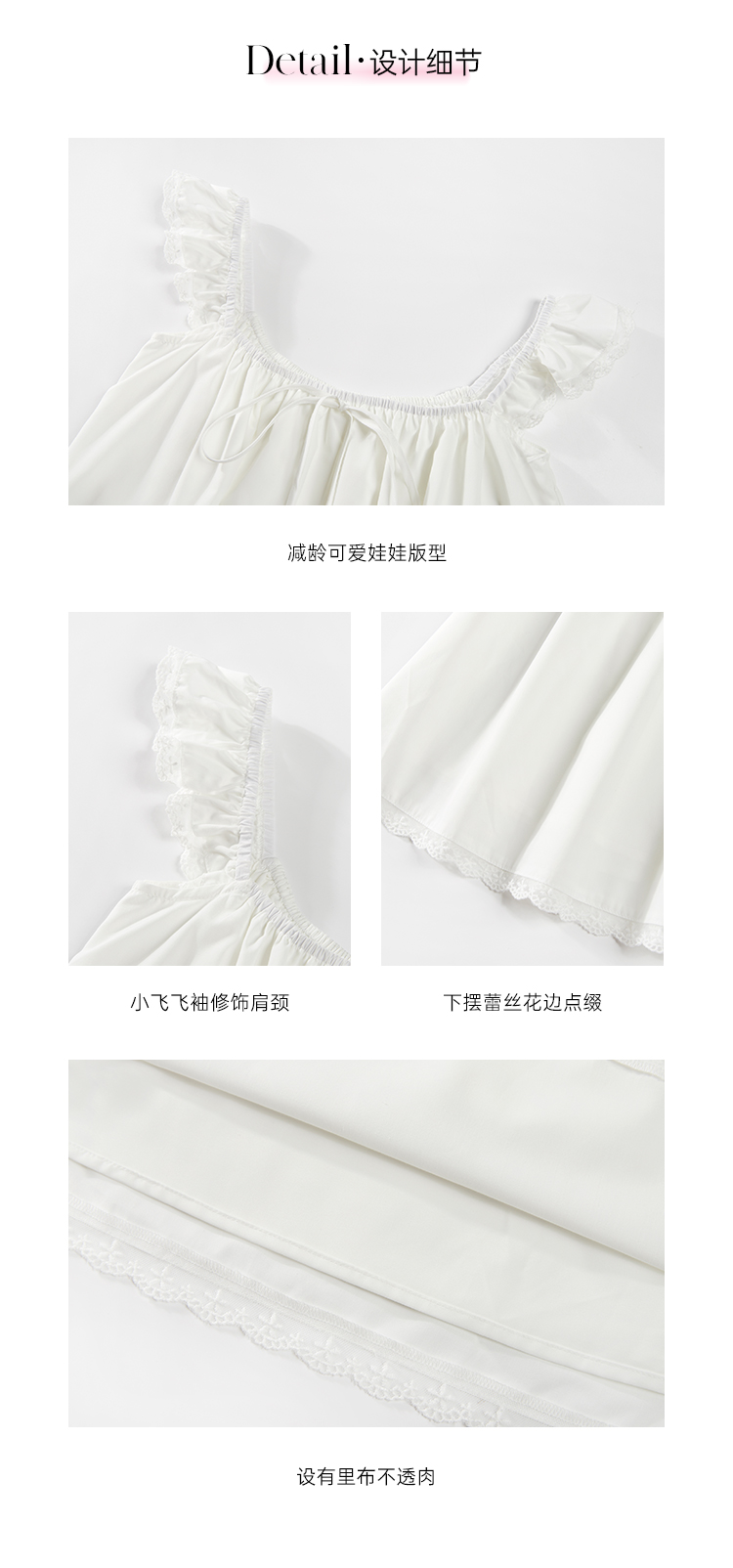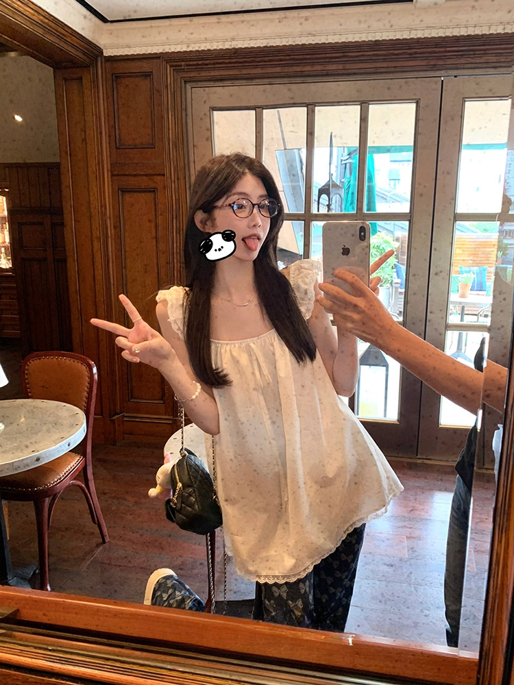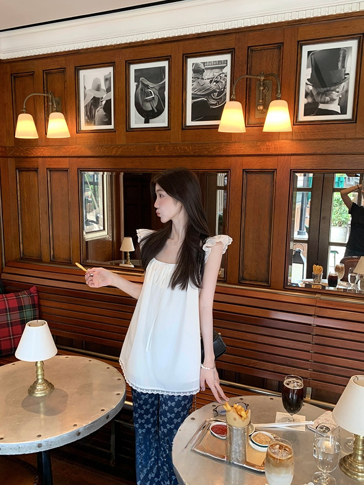 [Guai Guai Brand~] 레이스 트림이 돋보이는 여성용 작은 플라잉 슬리브 쉬폰 셔츠, 고급스럽고 우아한 화이트 탑