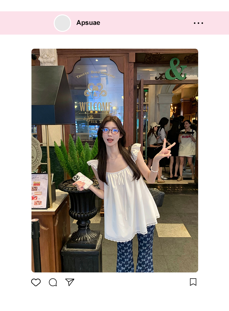 [Guai Guai Brand~] 레이스 트림이 돋보이는 여성용 작은 플라잉 슬리브 쉬폰 셔츠, 고급스럽고 우아한 화이트 탑스토어 가기