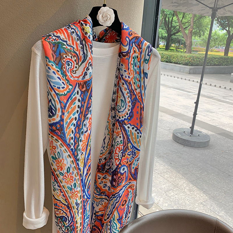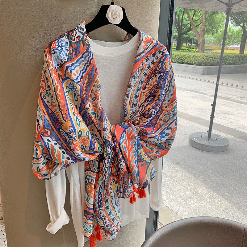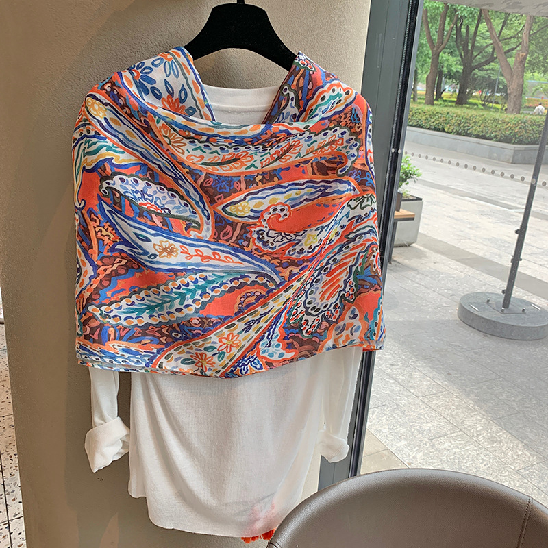 여름 민족 스타일 실크 스카프, 자외선 차단 및 이중 목적 오렌지 캐슈넛 다용도 프린트 면 및 린넨 거즈 스카프, 비치 타월 숄