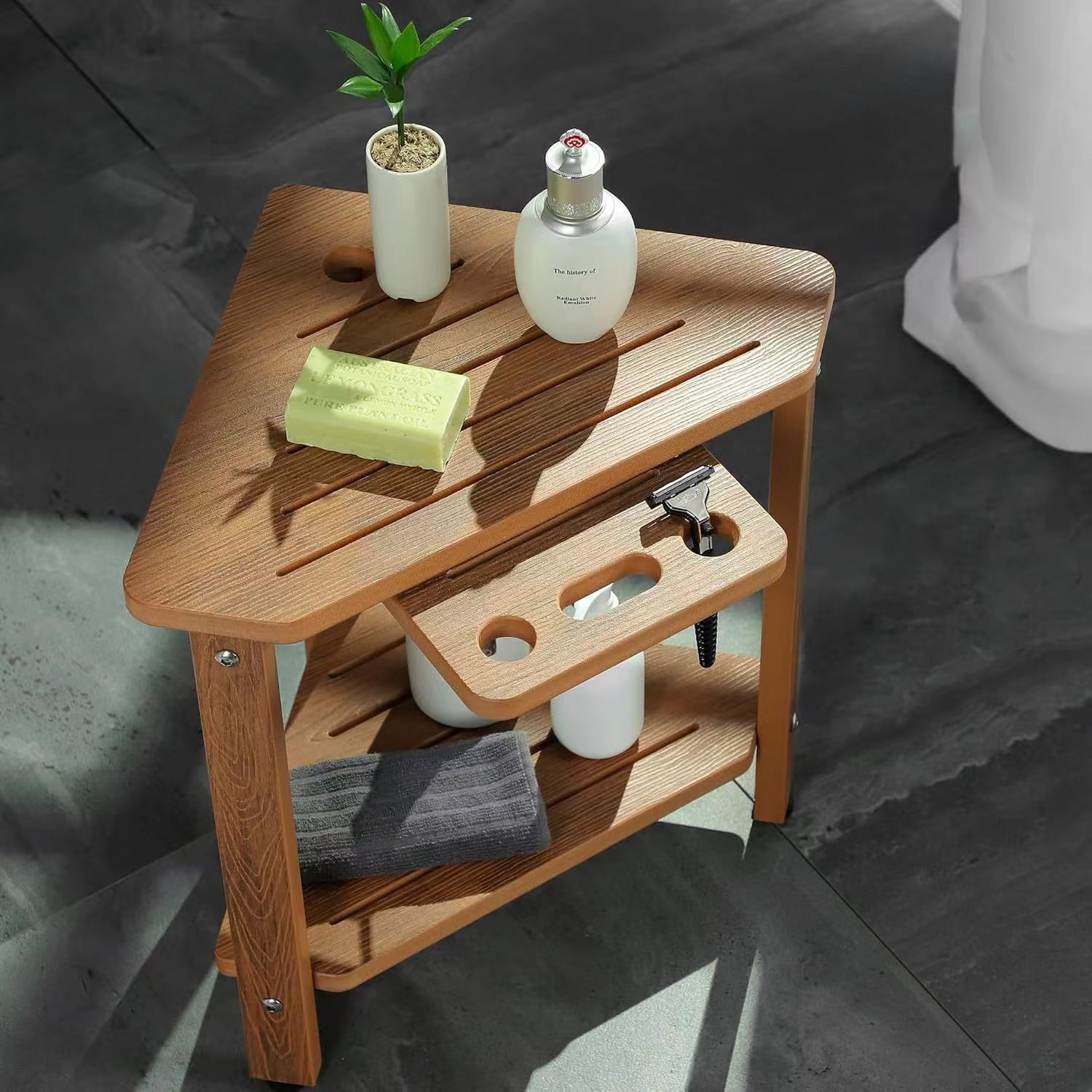 목재 욕실 발판, 가정용 목욕 의자, 코너 이중 수납 선반, 원목 꽃 선반, 수납 브래킷, 정리 랙