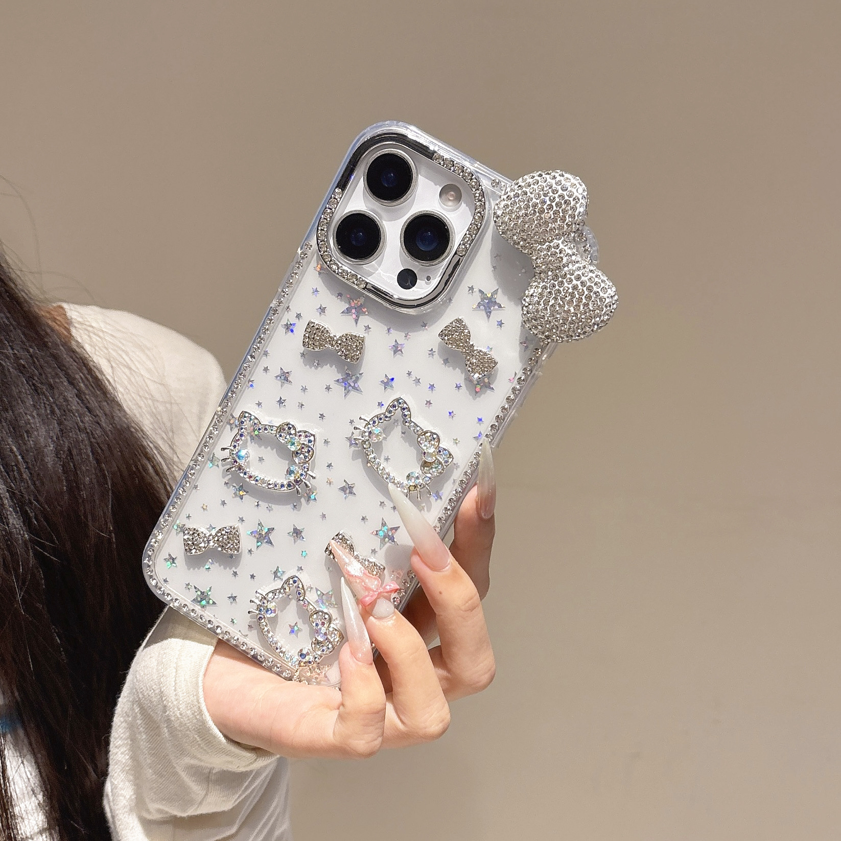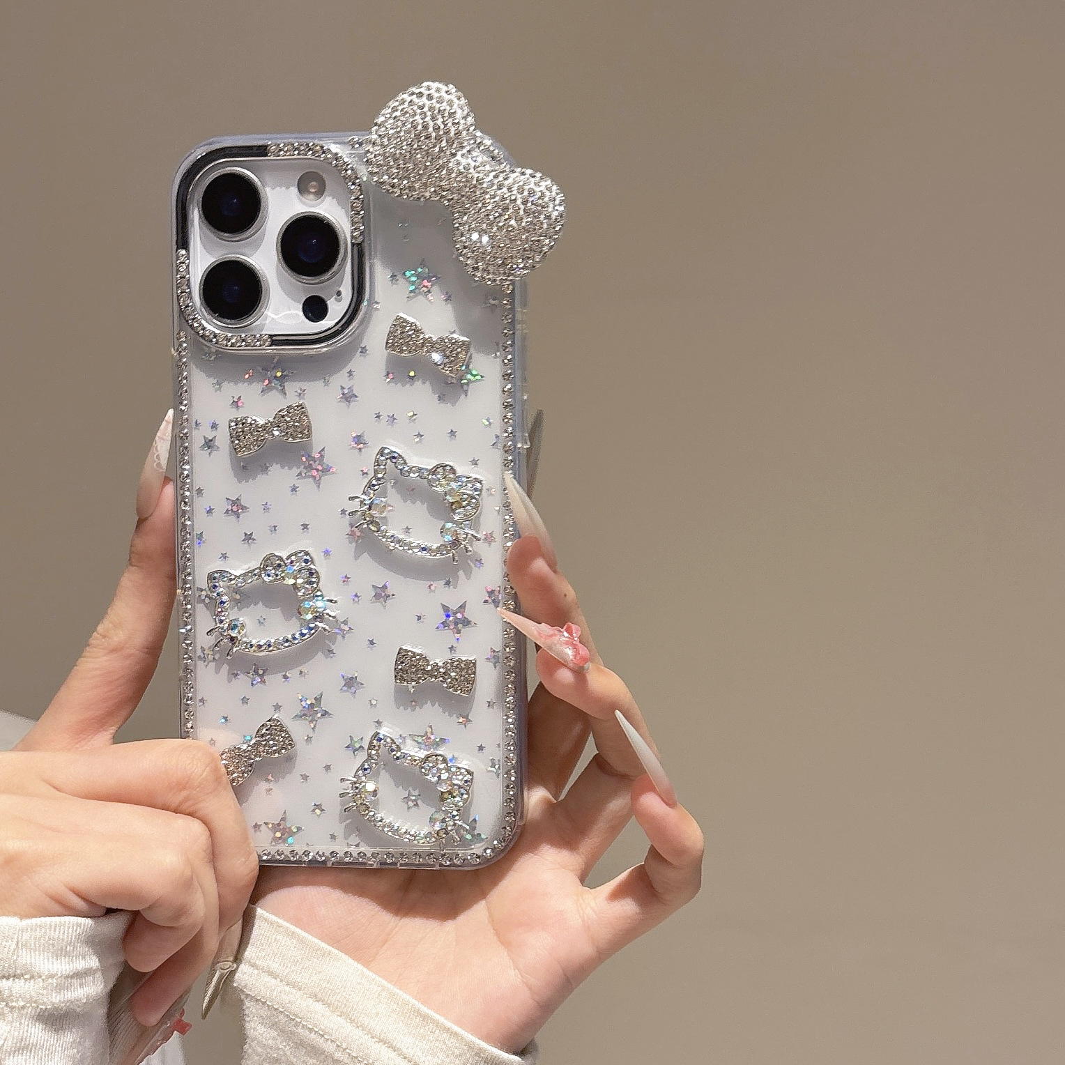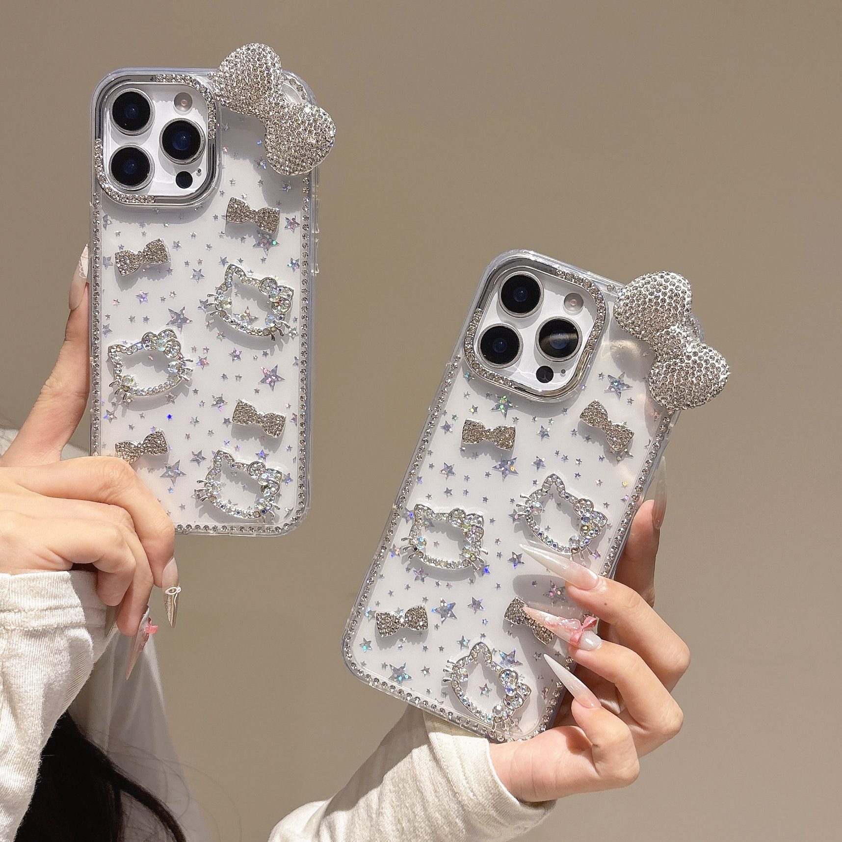 iPhone16promax 글리터 스타 휴대폰 케이스에 적합한 라인스톤 KT 고양이 다이아몬드 입체 Apple 15 케이스