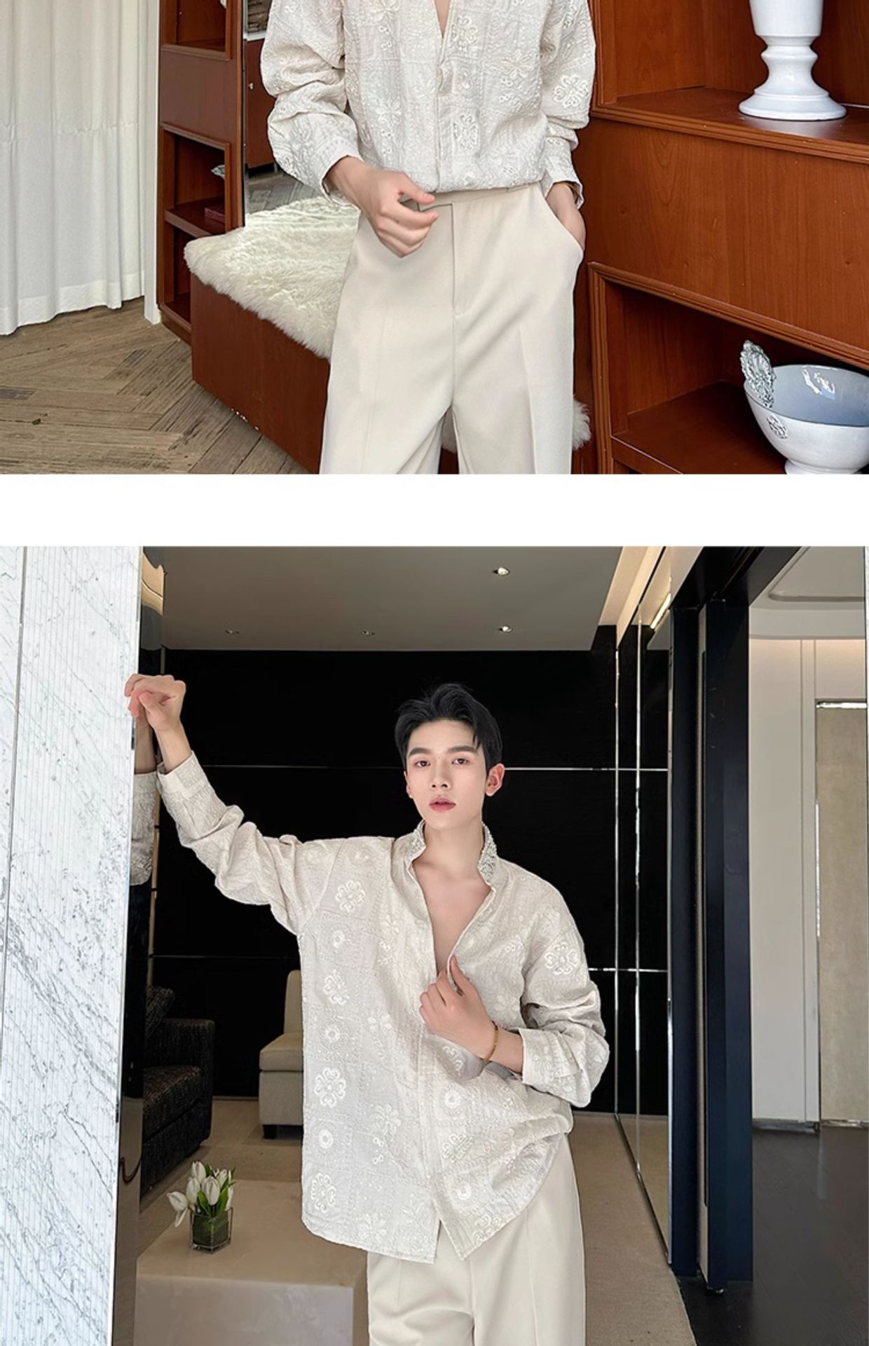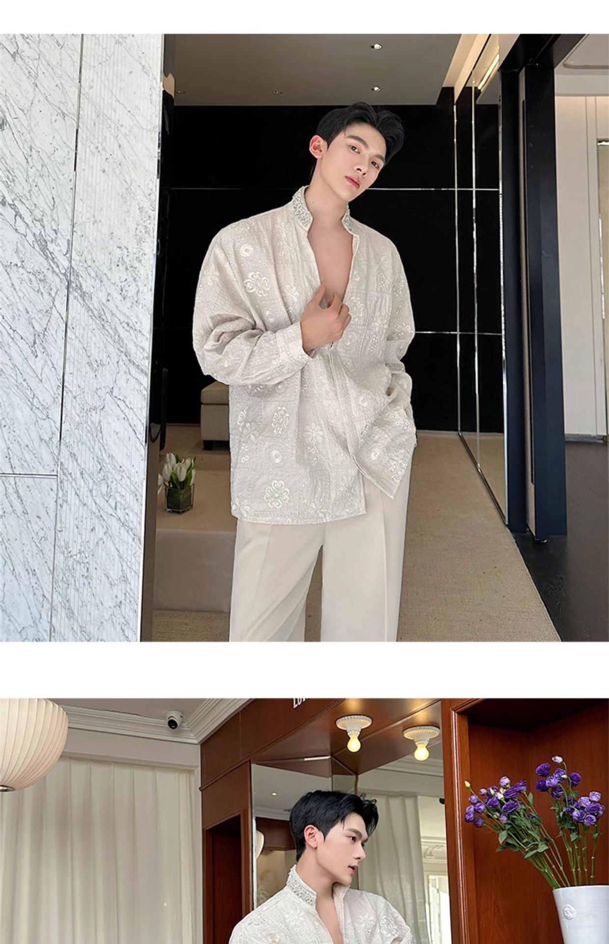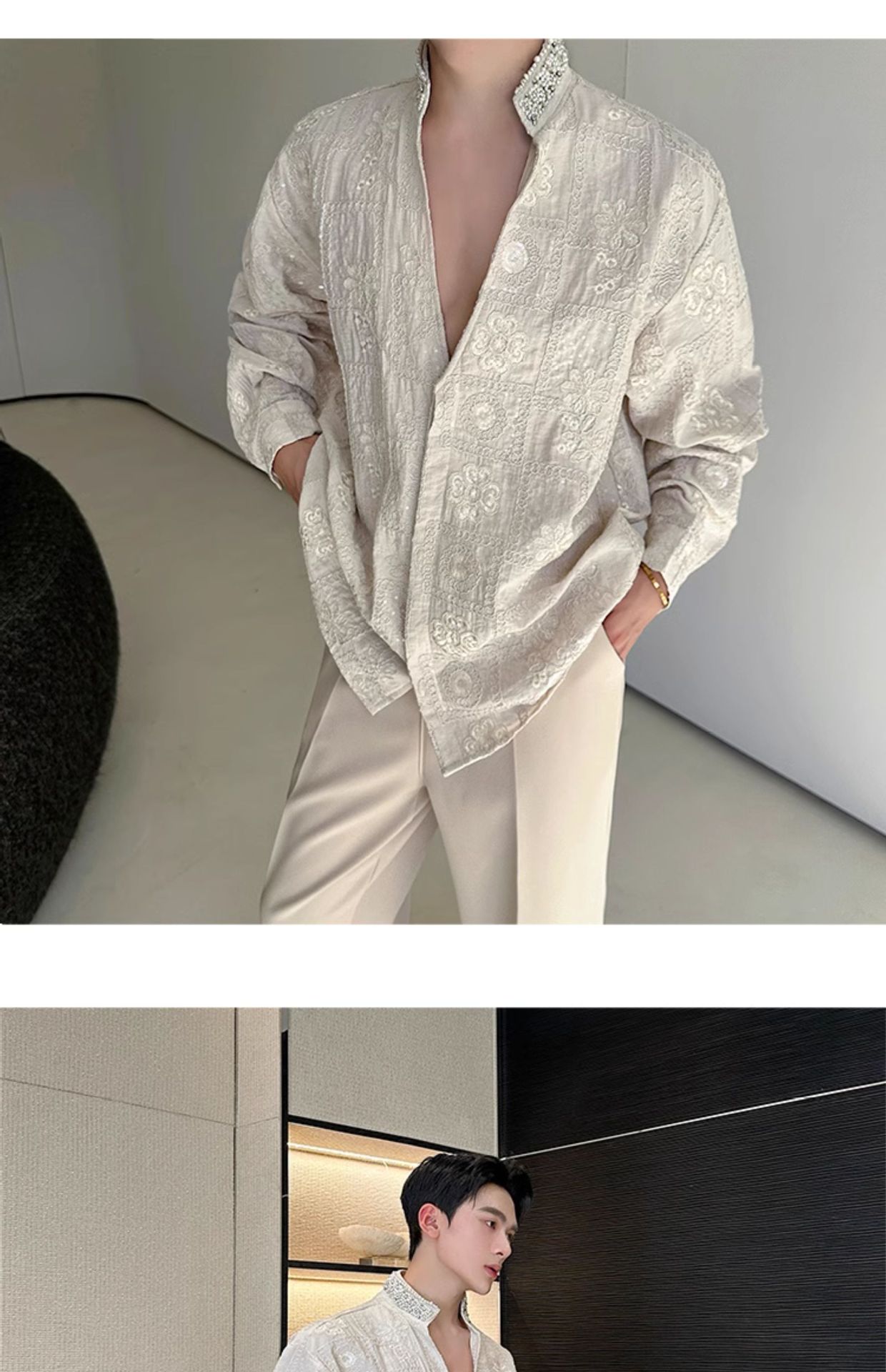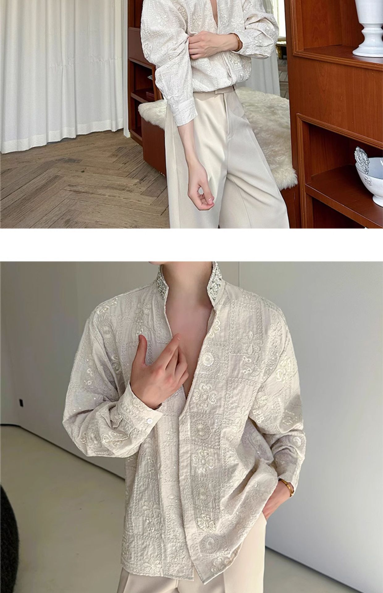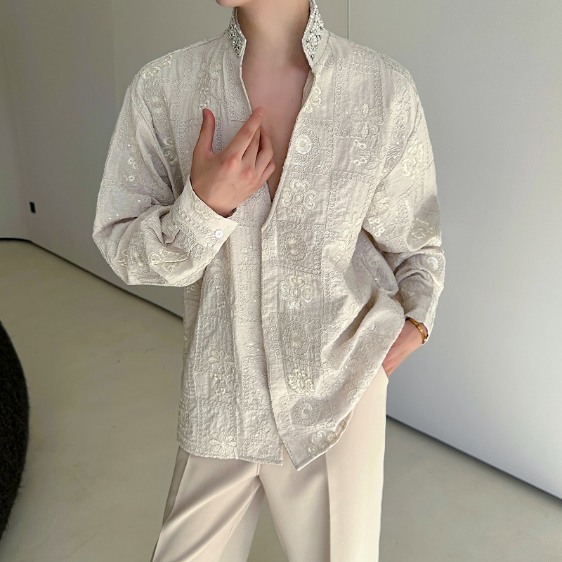 남성용 가벼운 럭셔리 헤비듀티 진주 라인스톤 스탠드 칼라 긴팔 셔츠, 편안한 질감, 브로케이드 자카드 자수 틈새 셔츠스토어 가기
