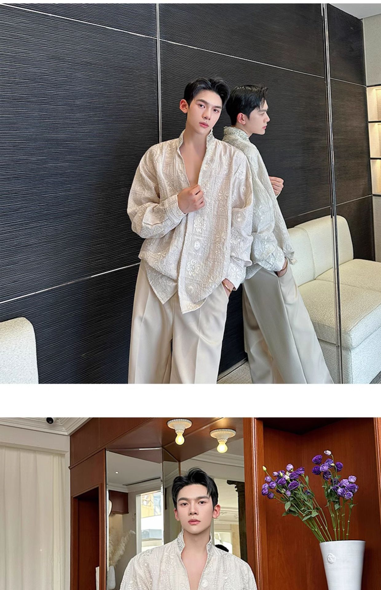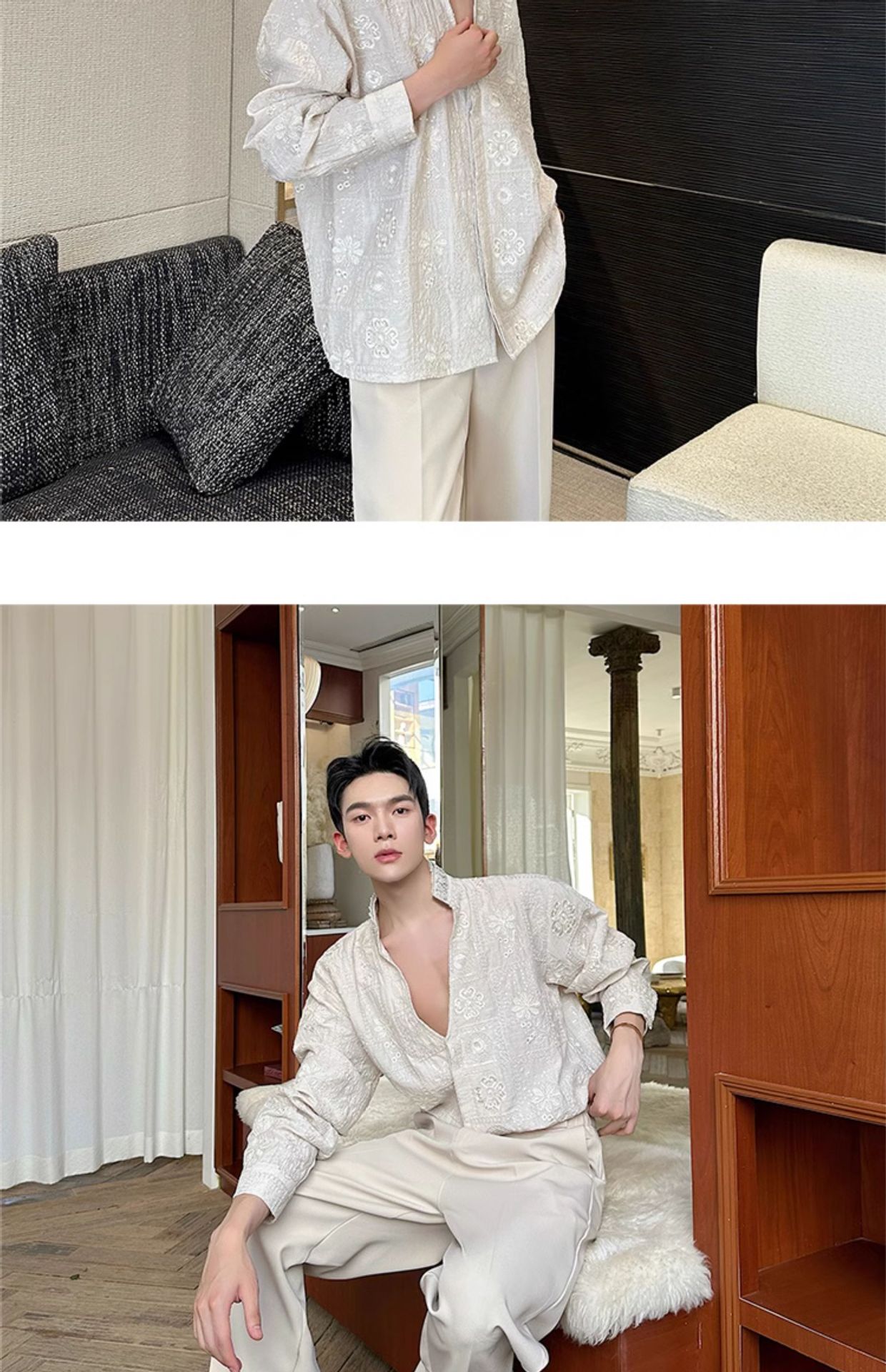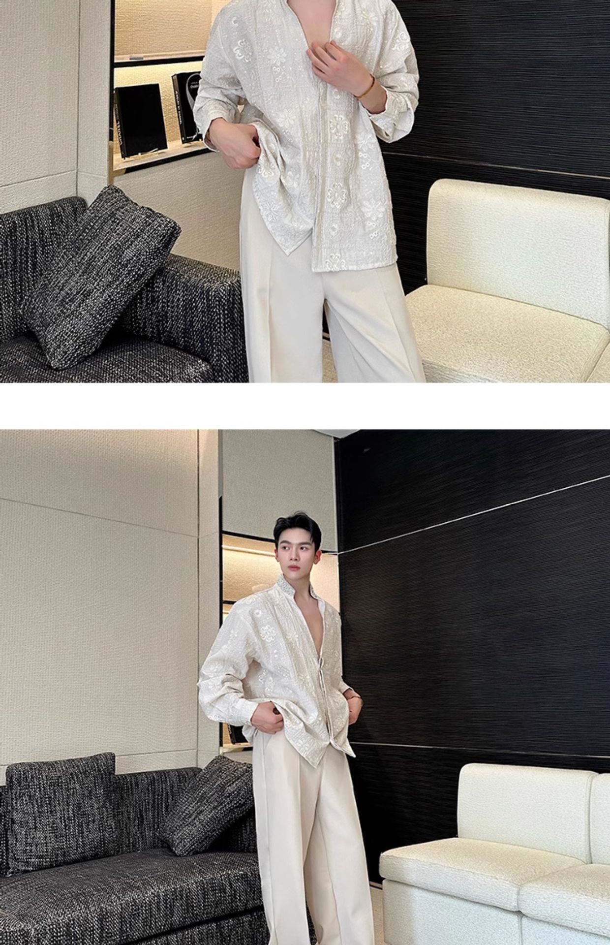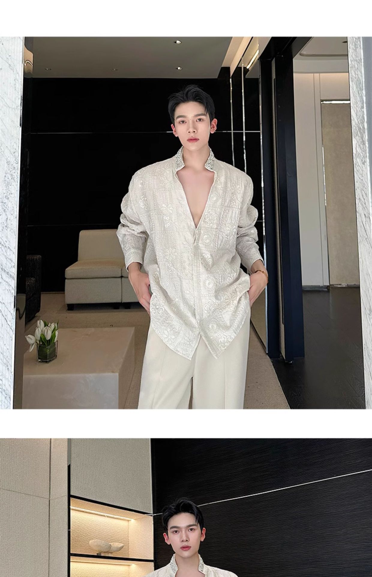 남성용 가벼운 럭셔리 헤비듀티 진주 라인스톤 스탠드 칼라 긴팔 셔츠, 편안한 질감, 브로케이드 자카드 자수 틈새 셔츠스토어 가기