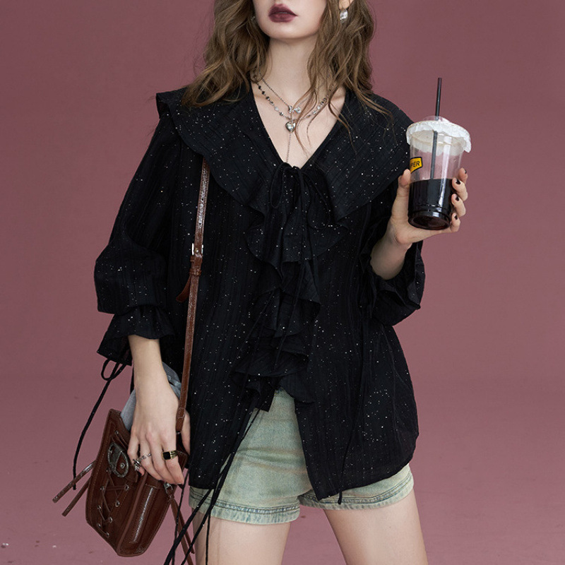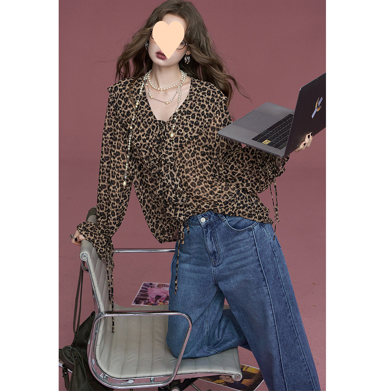 여성을위한 러플 칼라 레오파드 프린트 쉬폰 셔츠 2025 가을 새로운 미국 복고풍 스타일 패션 탑