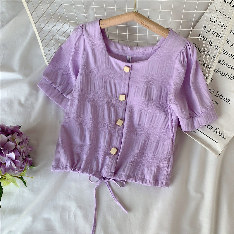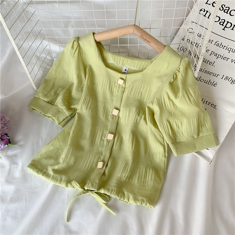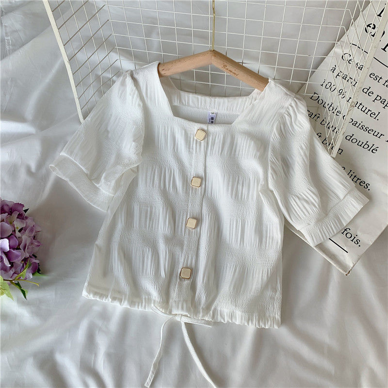 여름 반팔 여성의 달콤한 셔츠, 새로운 스타일, 패셔너블하고 요정 같은 짧은 탑, 배를 덮는 요정 쉬폰 셔츠스토어 가기