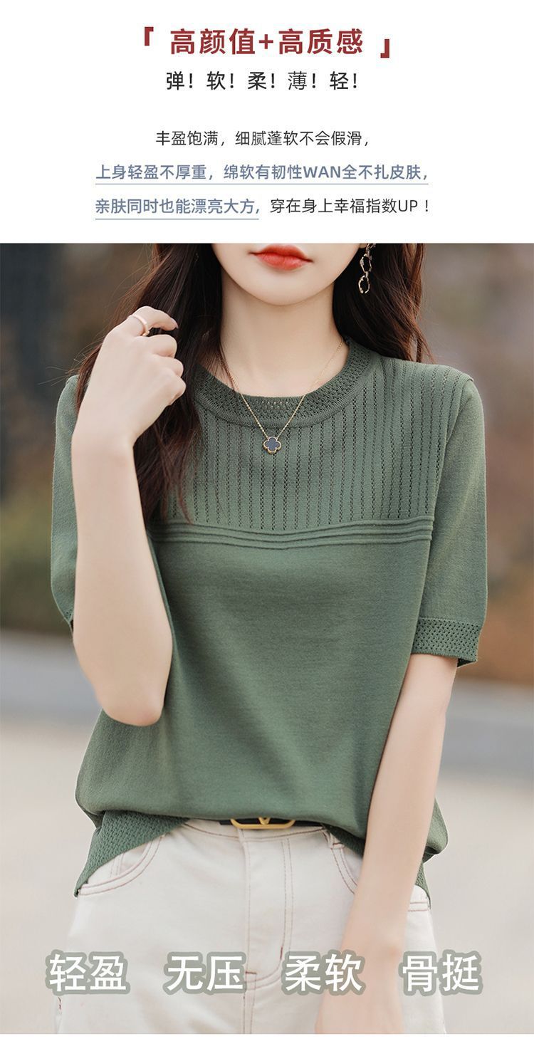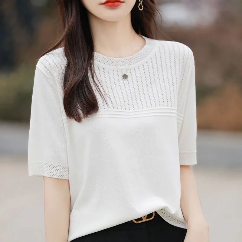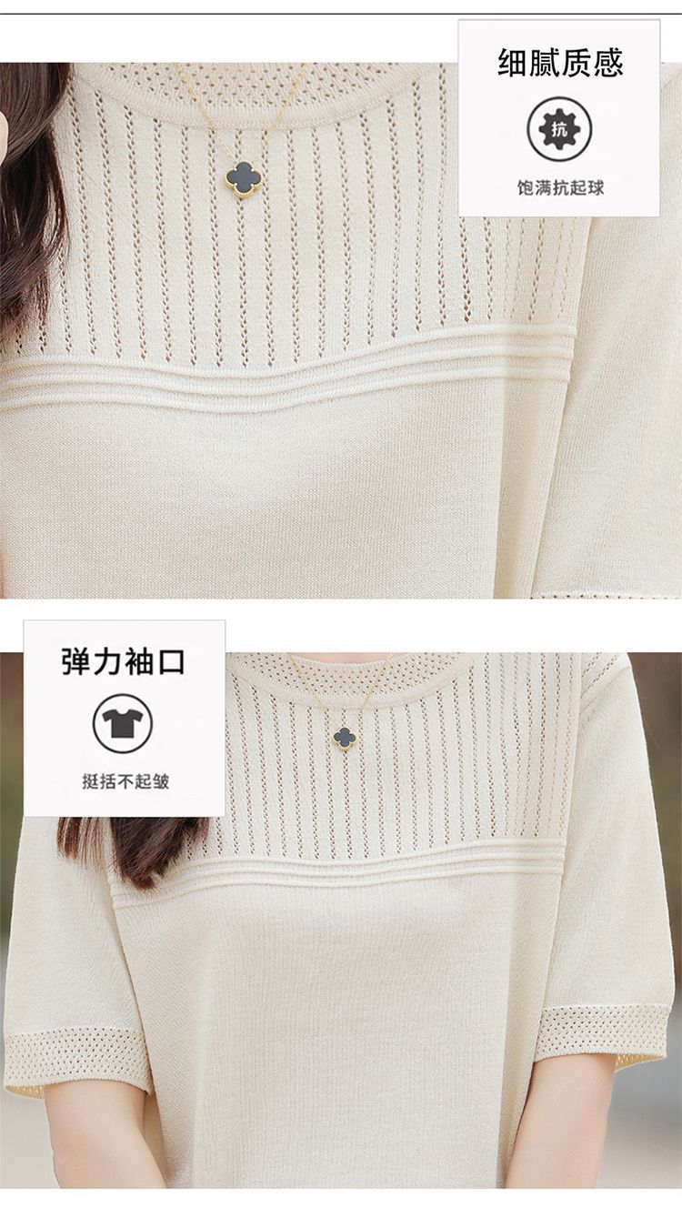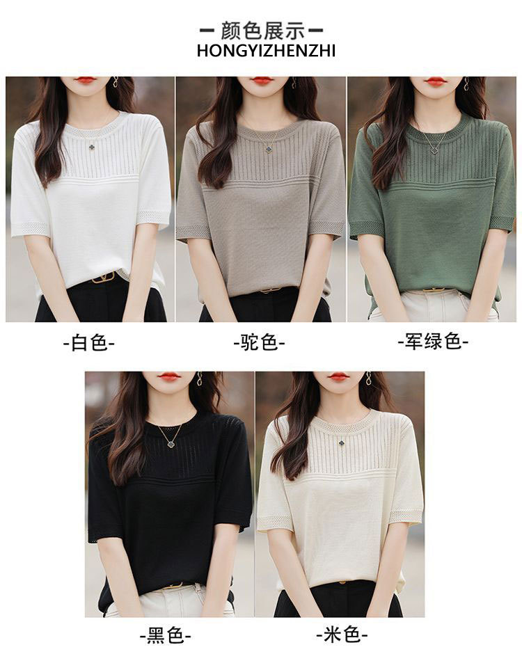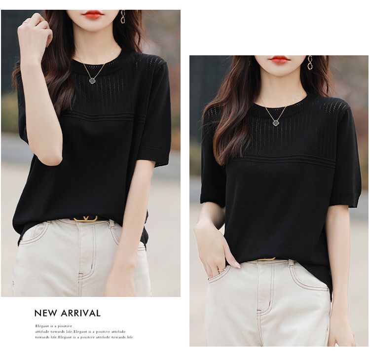 Hong 6575 여름 얇은 드레이프 아이스 실크 반팔 티셔츠 여성 캐주얼 대형 루즈 니트 셔츠 라운드 넥 중공 탑스토어 가기