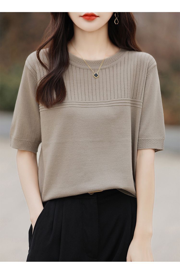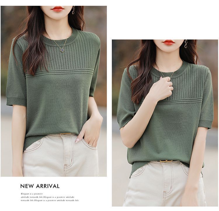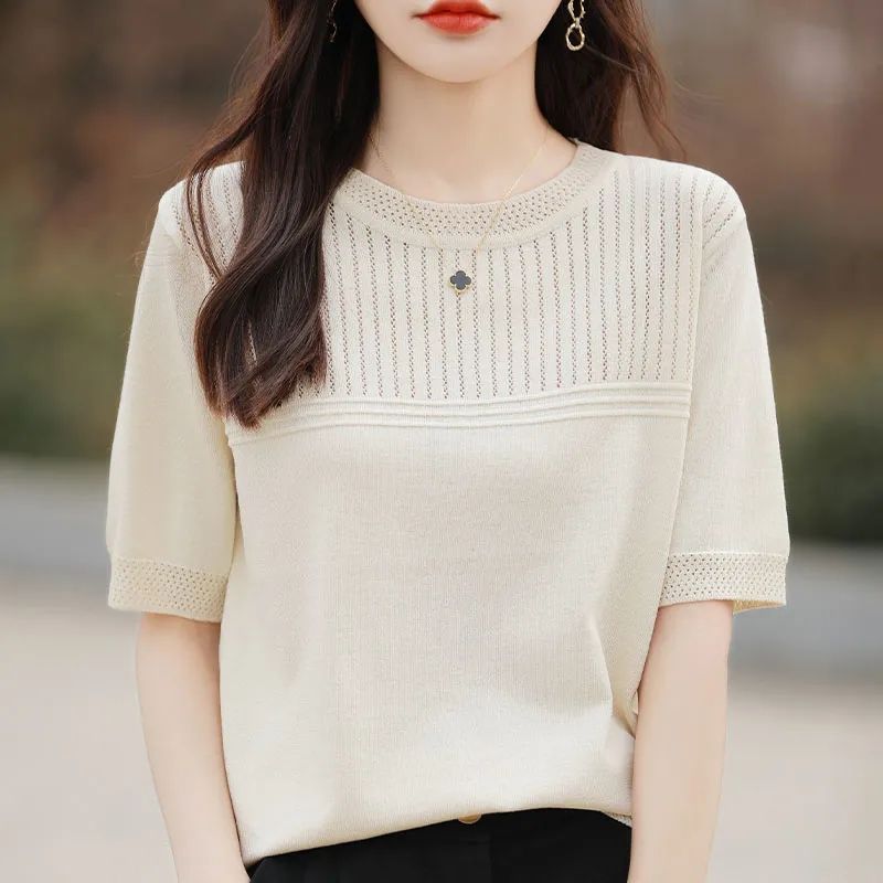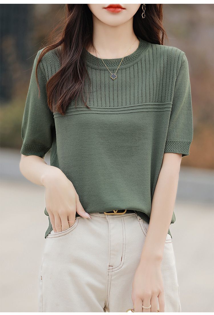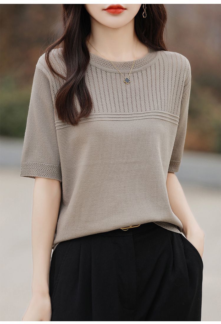 Hong 6575 여름 얇은 드레이프 아이스 실크 반팔 티셔츠 여성 캐주얼 대형 루즈 니트 셔츠 라운드 넥 중공 탑스토어 가기