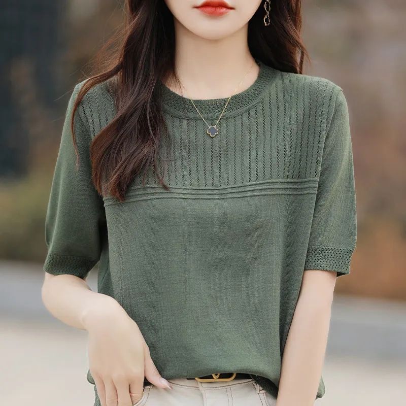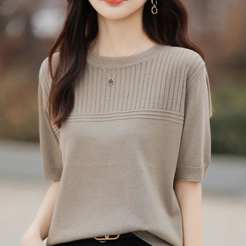 Hong 6575 여름 얇은 드레이프 아이스 실크 반팔 티셔츠 여성 캐주얼 대형 루즈 니트 셔츠 라운드 넥 중공 탑