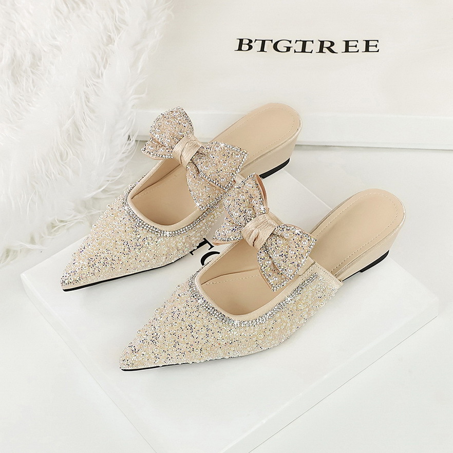 599-1 여성용 프렌치 페어리 스타일 보우 진주 라인스톤 발가락 슬리퍼, 여성용 고급 기질 슬립온 슈즈