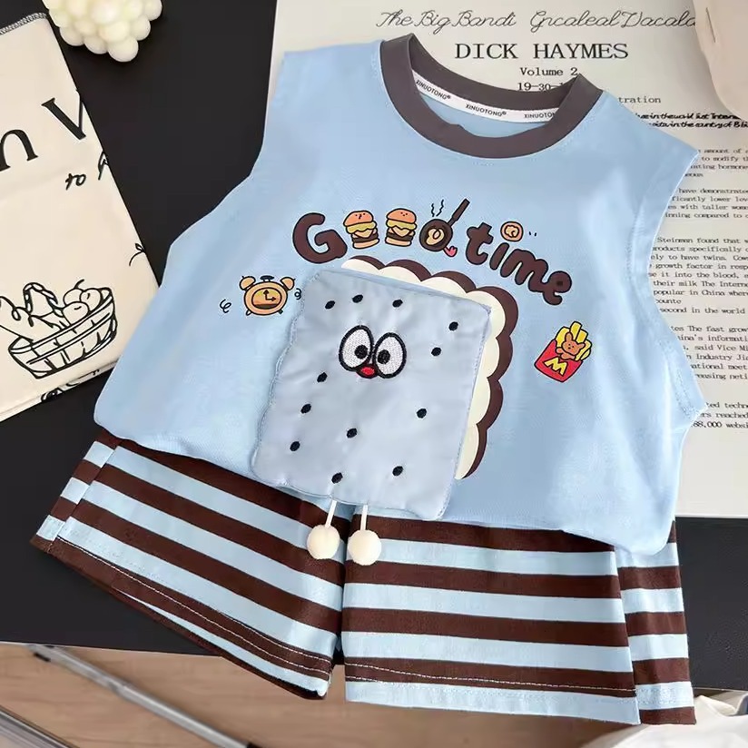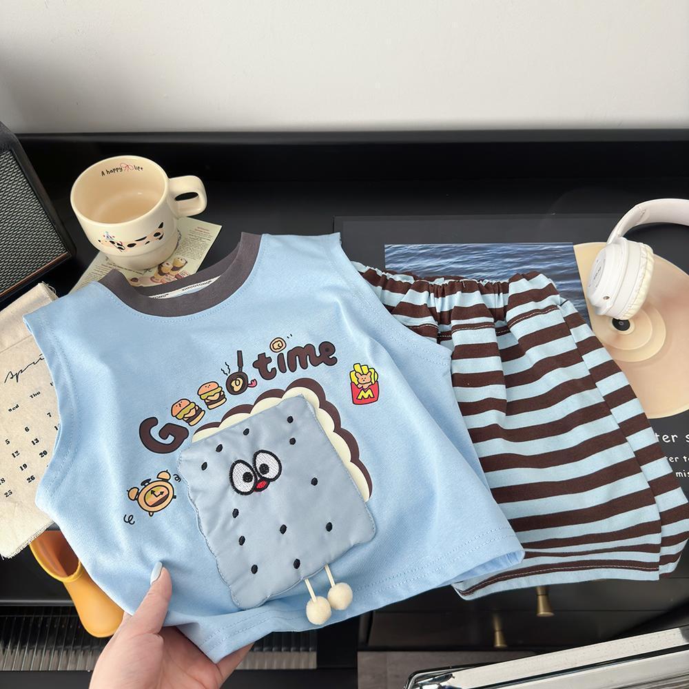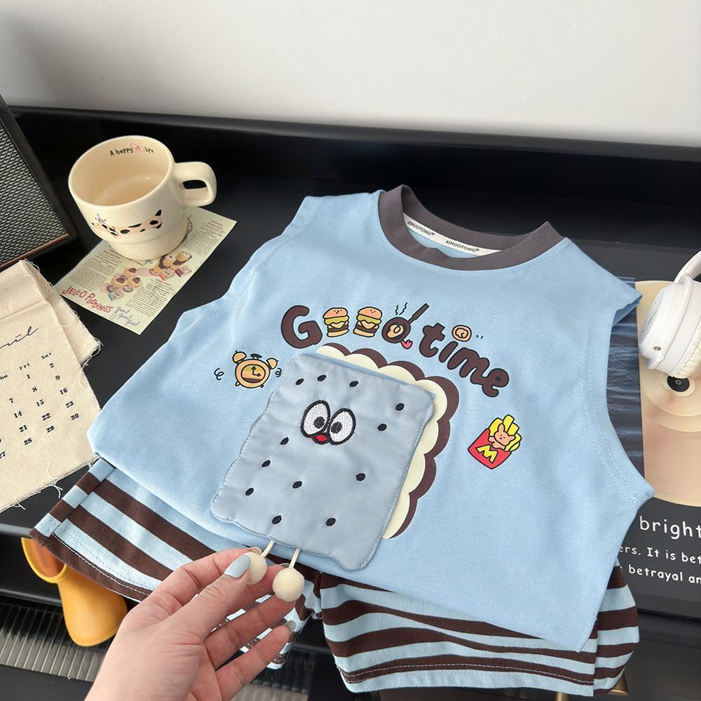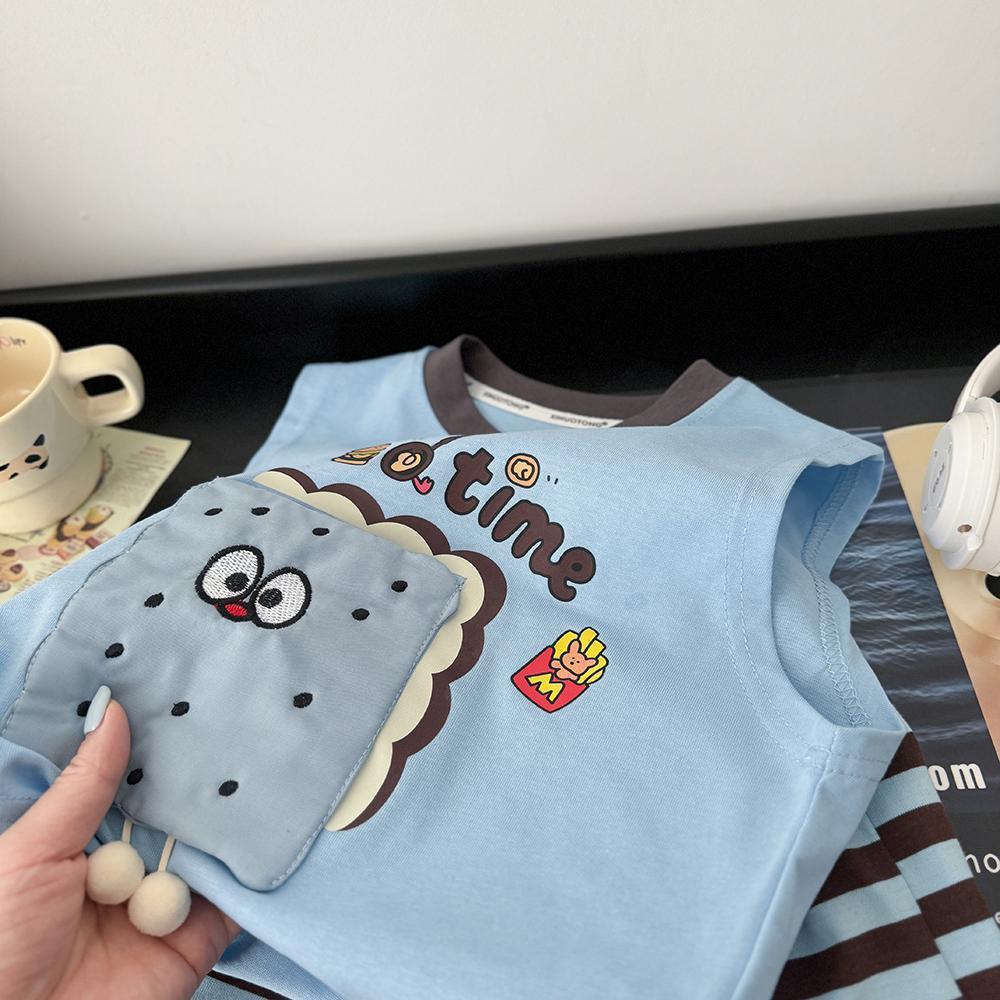 어린이 만화 프린트 조끼 민소매 티셔츠 세트 아기 여름 얇은 양복 조끼 탑 소년과 소녀를위한 투피스 세트
