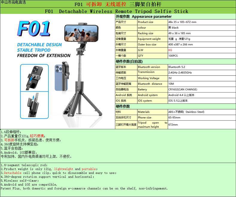 • F01 [블랙] 67CM 스테인레스 스틸 폴 + 블루투스 리모컨