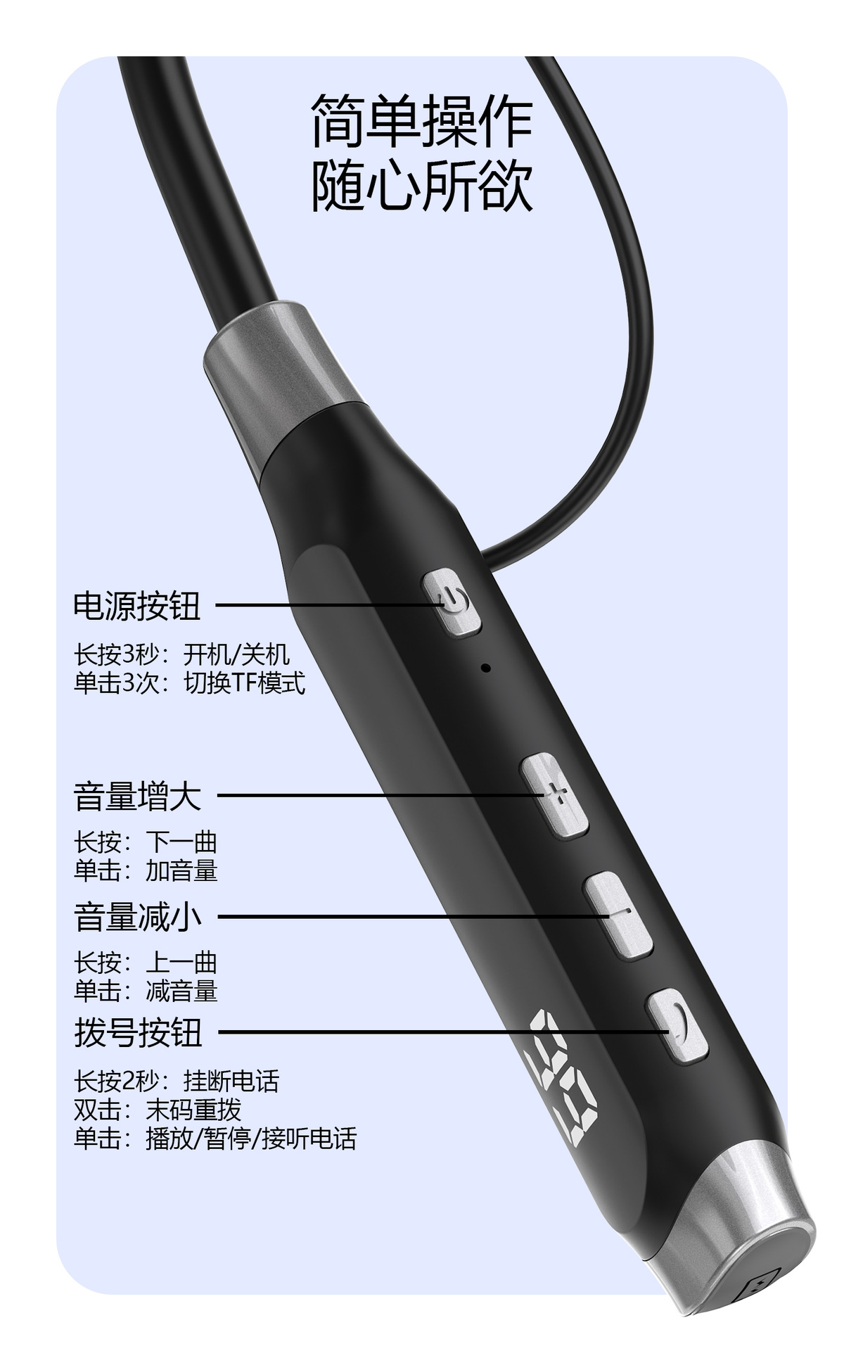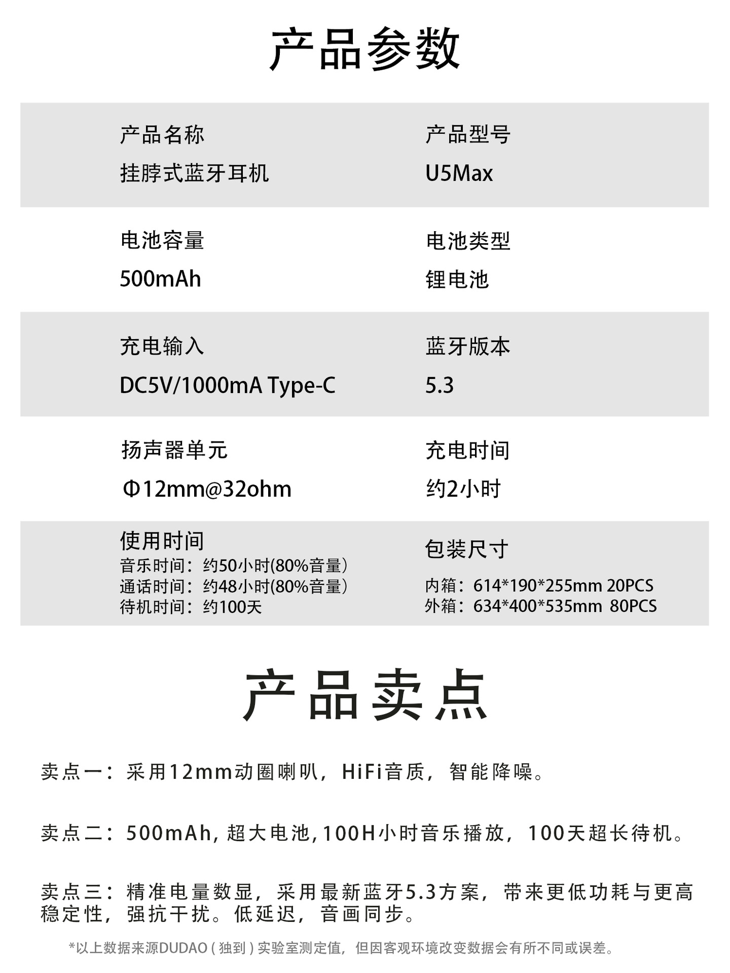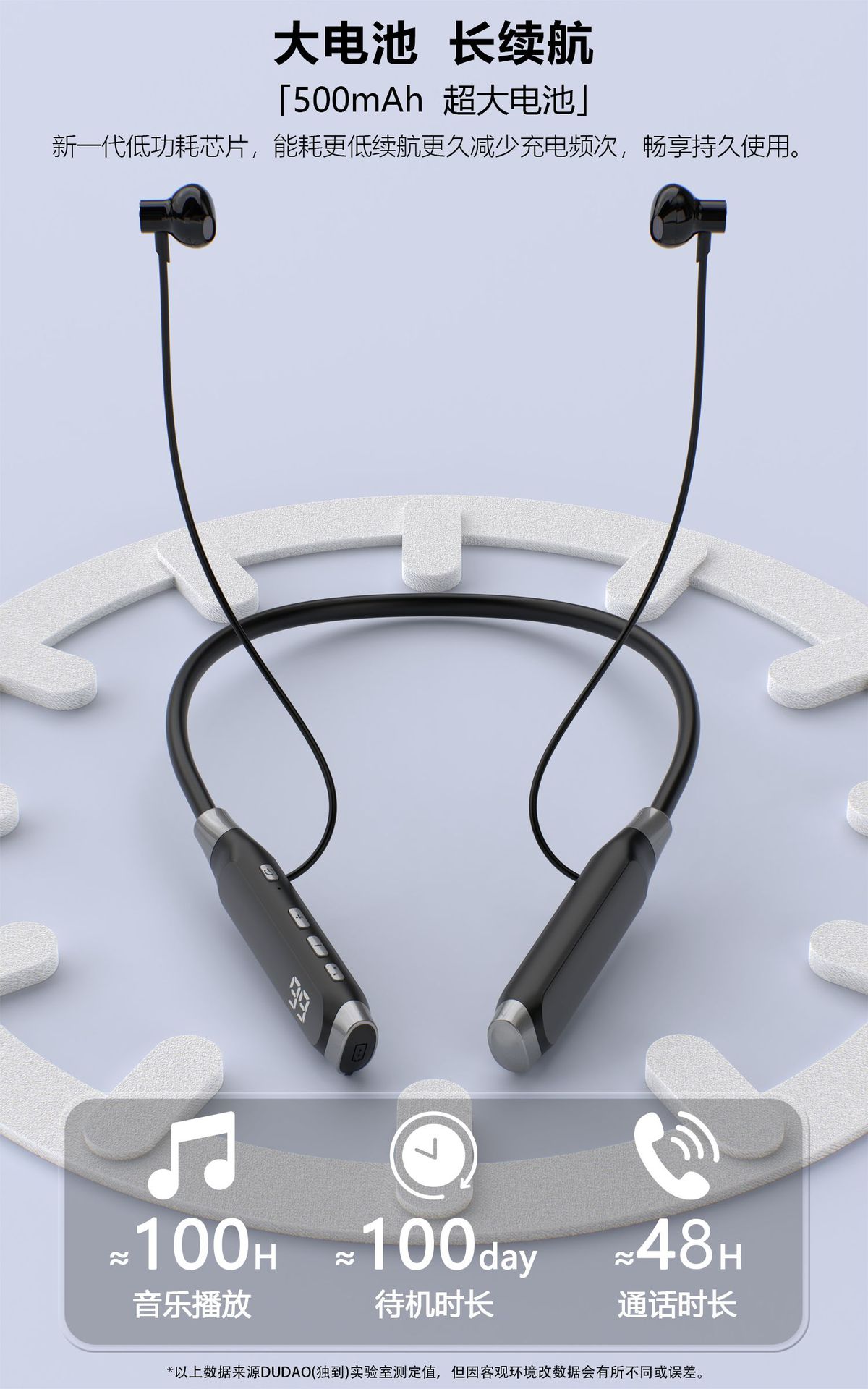 ·500mAh,超大电池,100H小时音乐播放,100天超长待机。