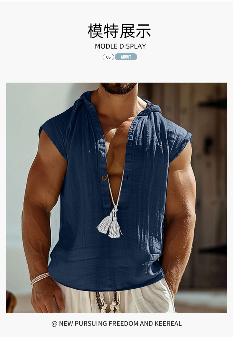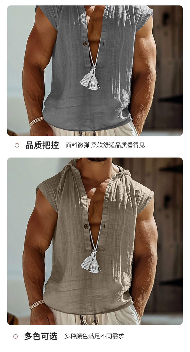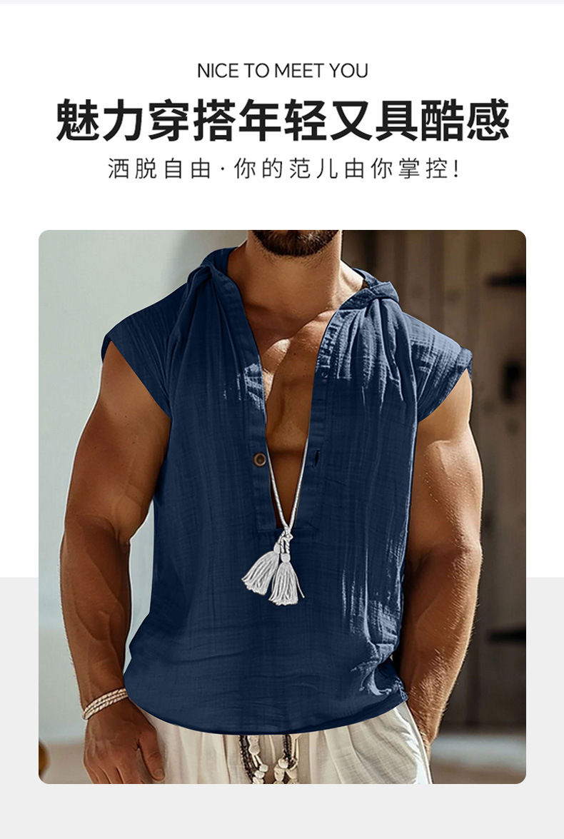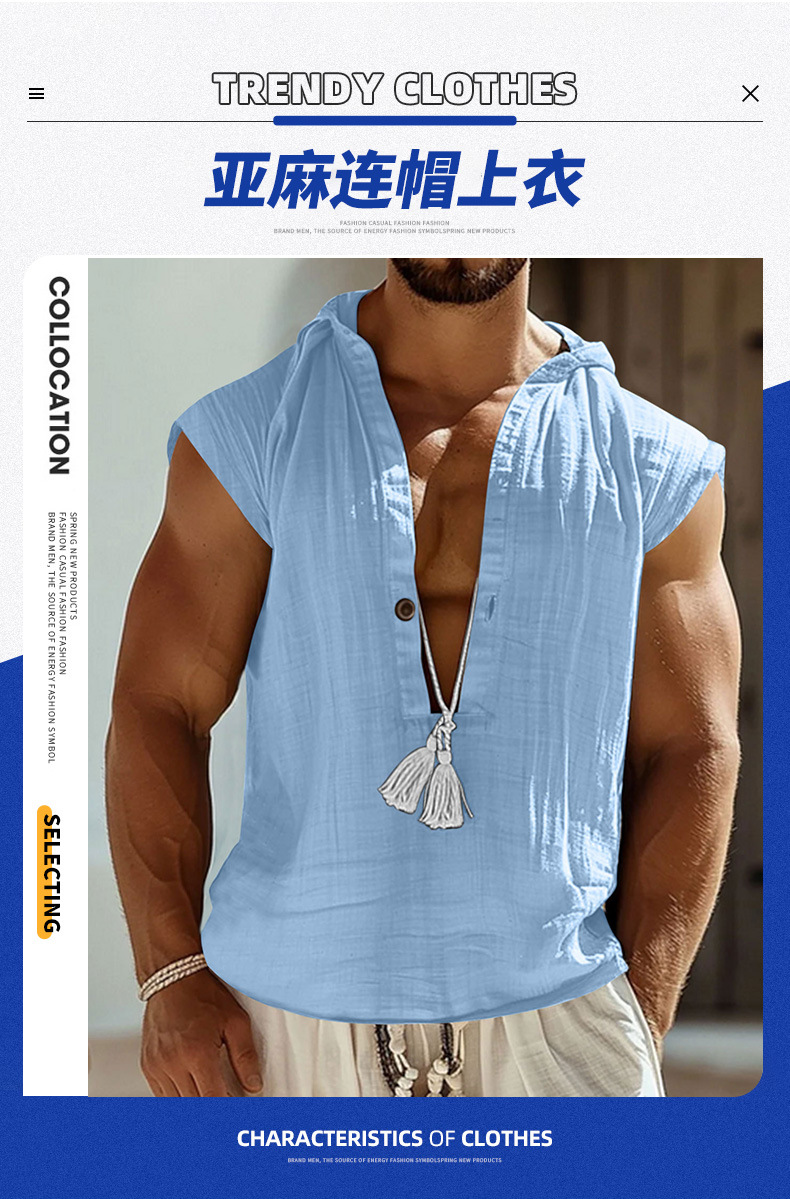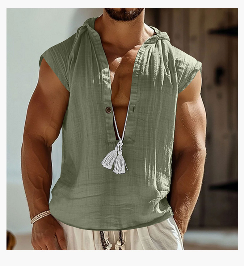 2025 국경 간 유럽과 미국 여름 남성 캐주얼 민소매 조끼 셔츠 린넨 후드 솔리드 컬러 통기성 루즈 탑
