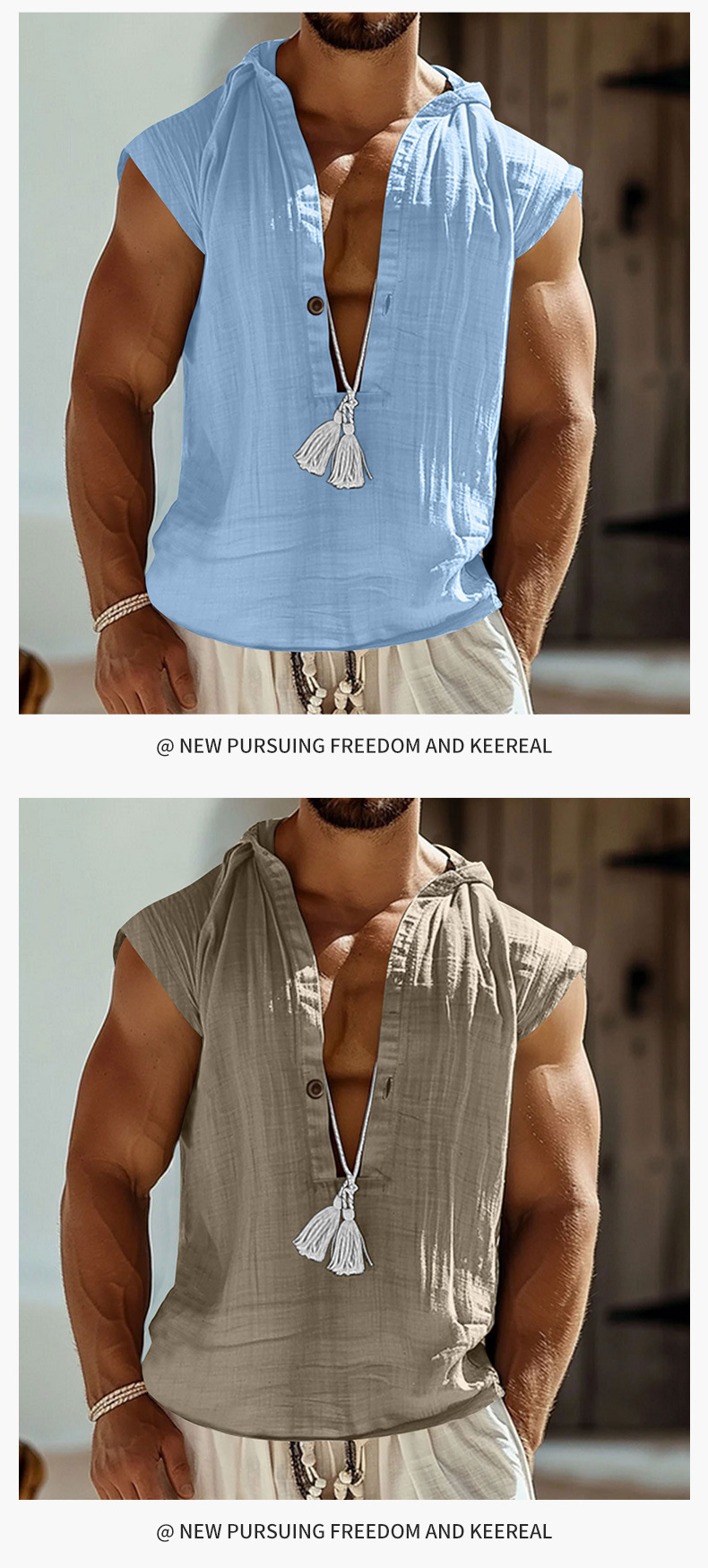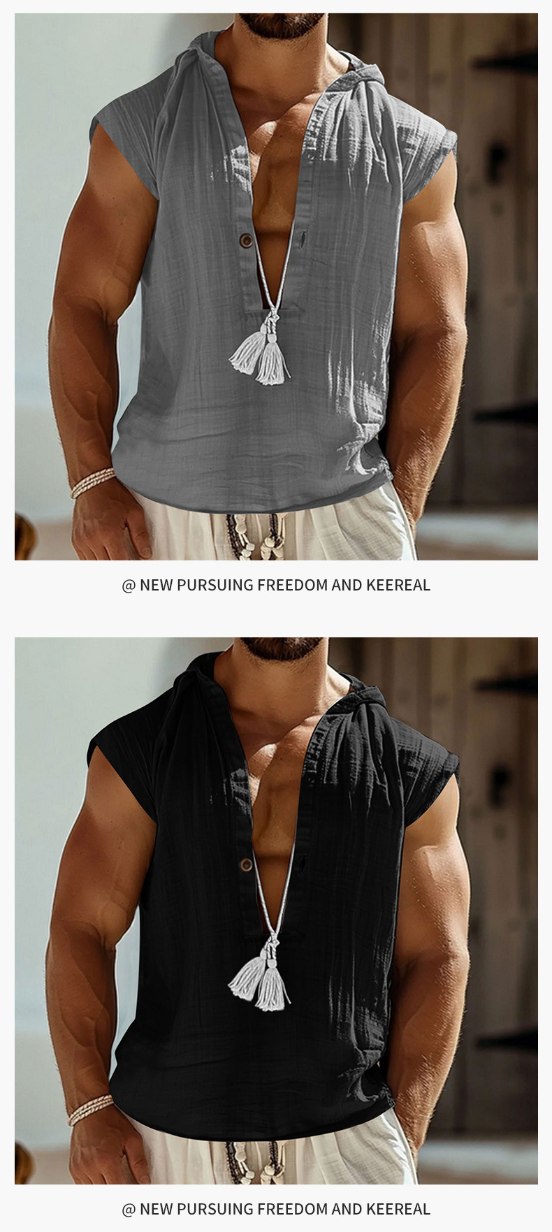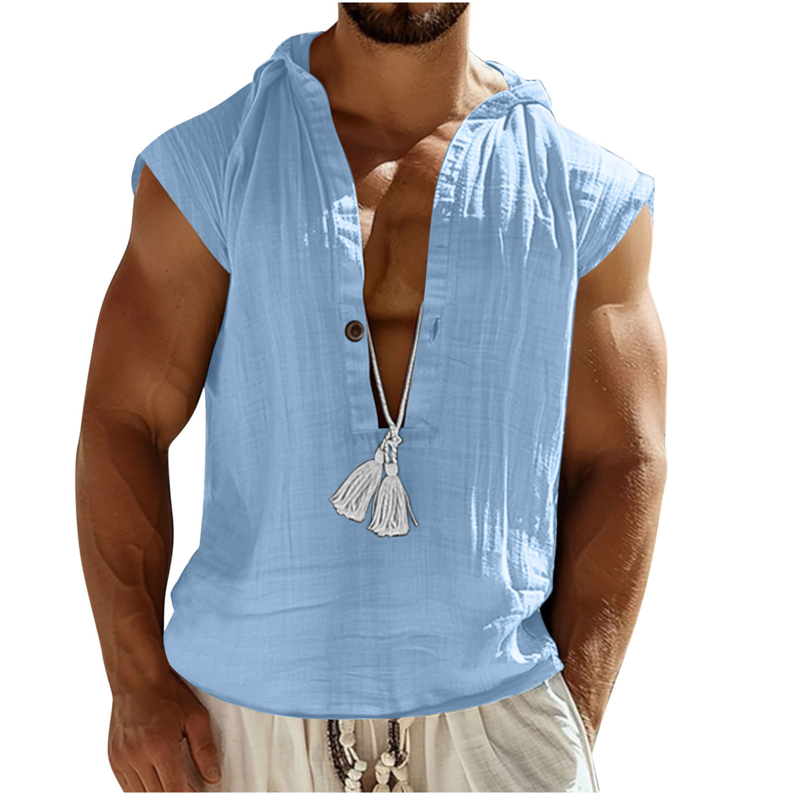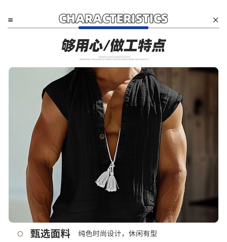 2025 국경 간 유럽과 미국 여름 남성 캐주얼 민소매 조끼 셔츠 린넨 후드 솔리드 컬러 통기성 루즈 탑