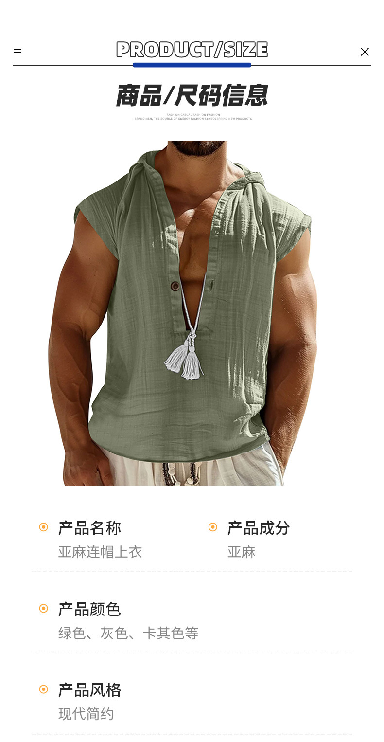 2025 국경 간 유럽과 미국 여름 남성 캐주얼 민소매 조끼 셔츠 린넨 후드 솔리드 컬러 통기성 루즈 탑스토어 가기
