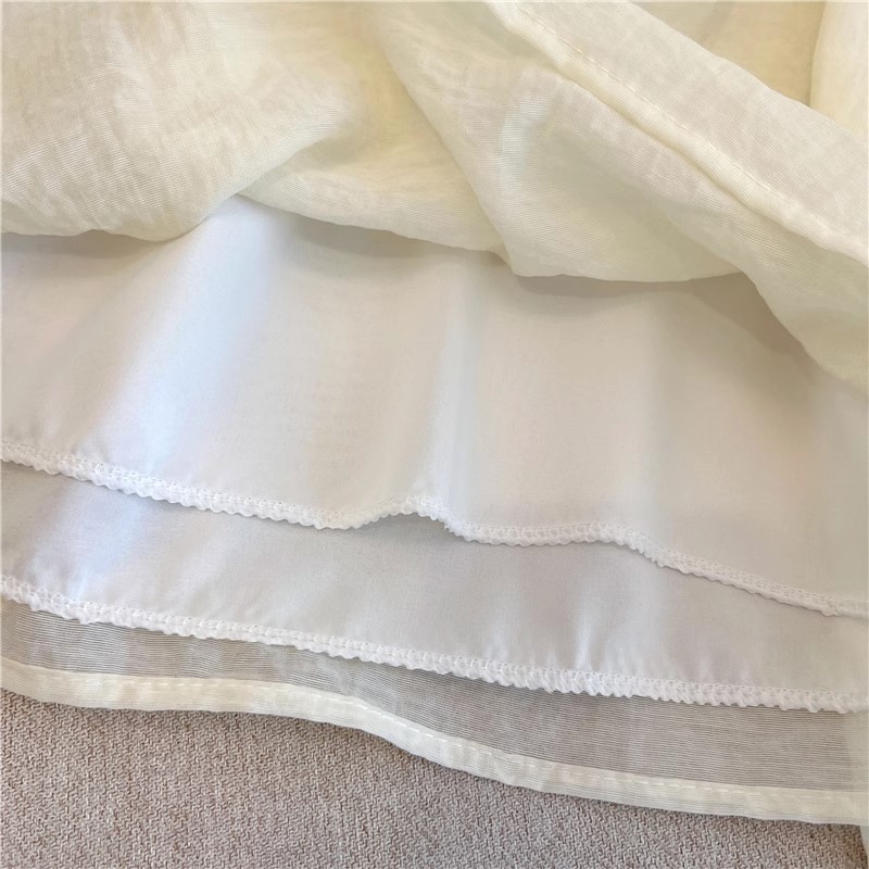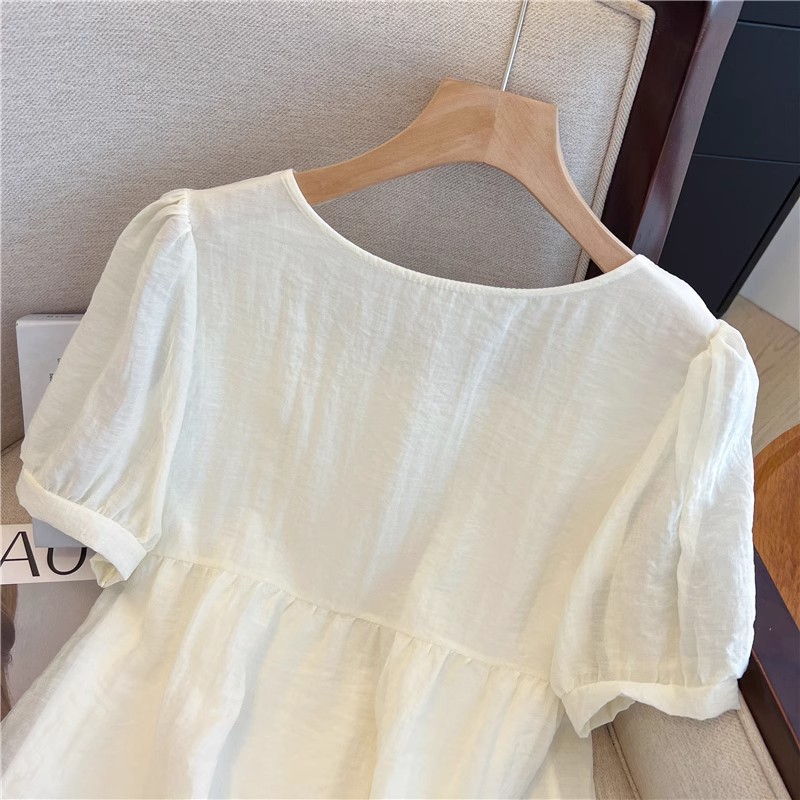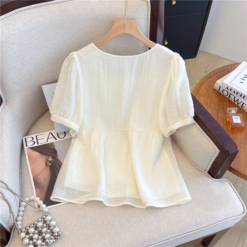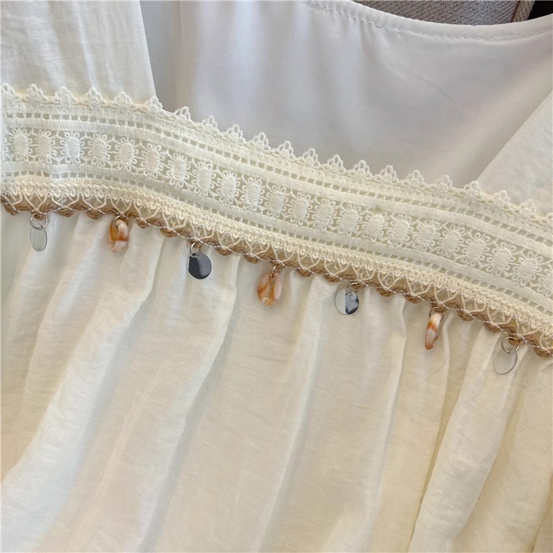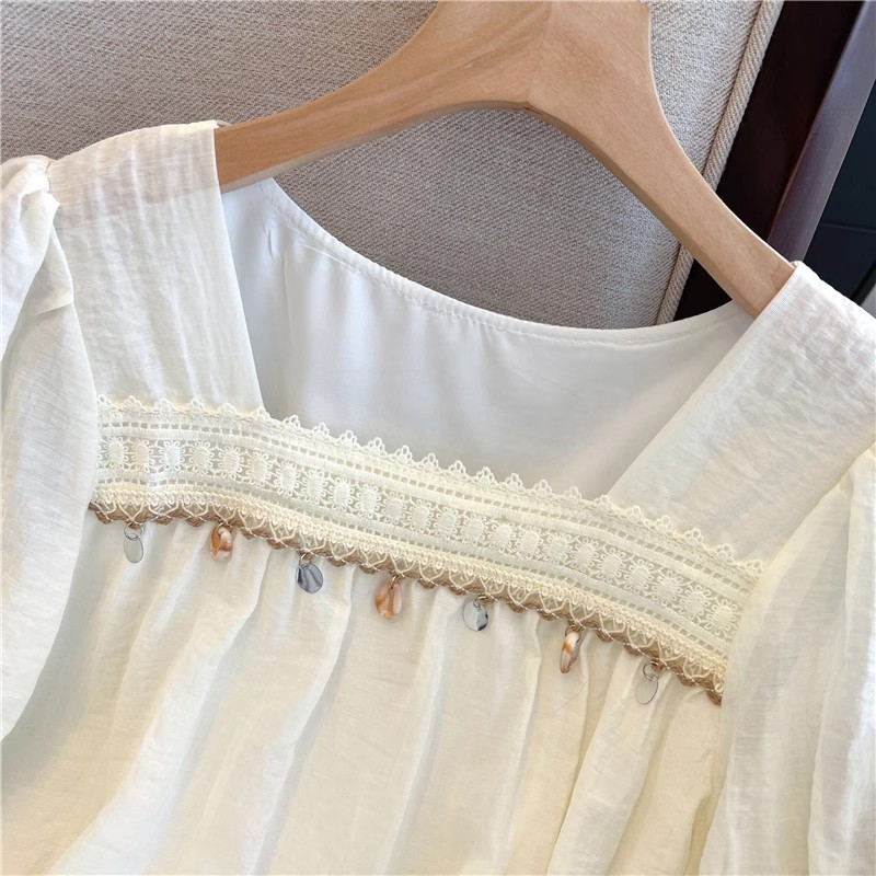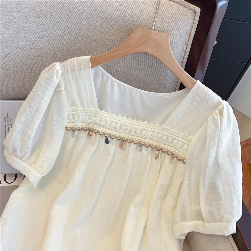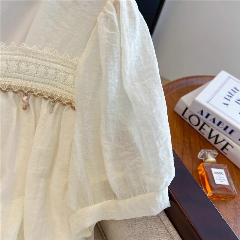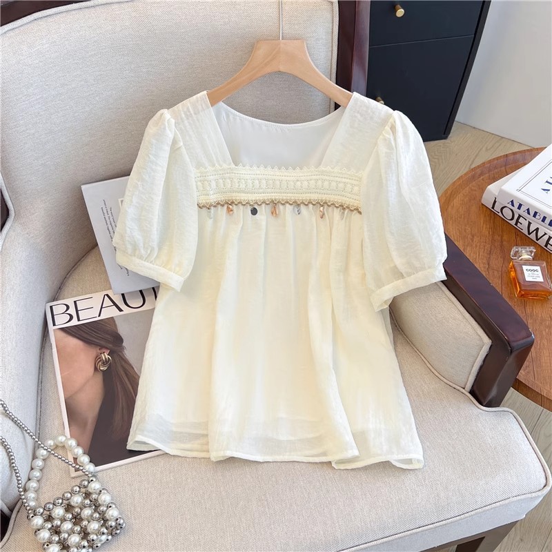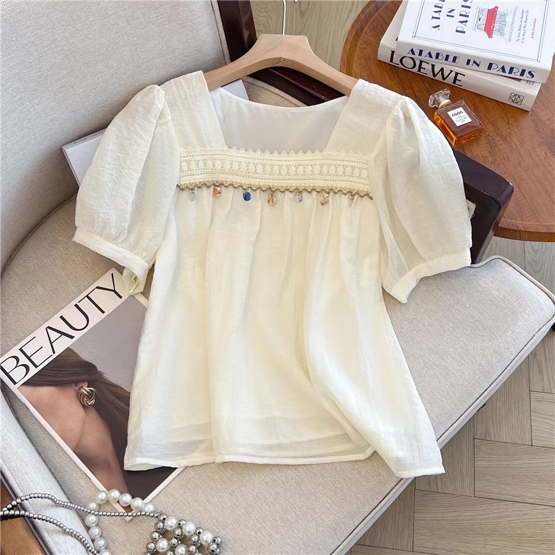 여름 여성용 프렌치 스퀘어 넥 퍼프 슬리브 쉬폰 셔츠, 루즈한 베이비돌 셔츠, 태슬 레이스 스플라이싱 탑스토어 가기