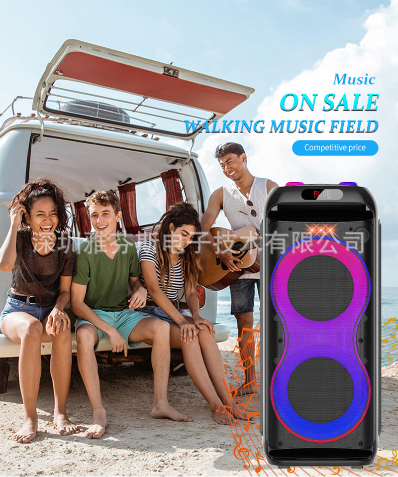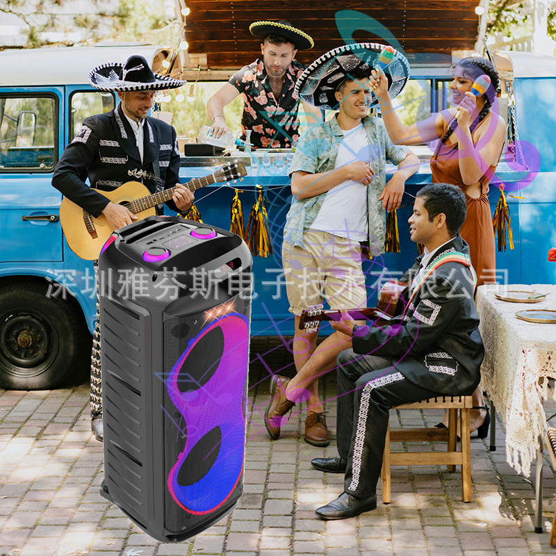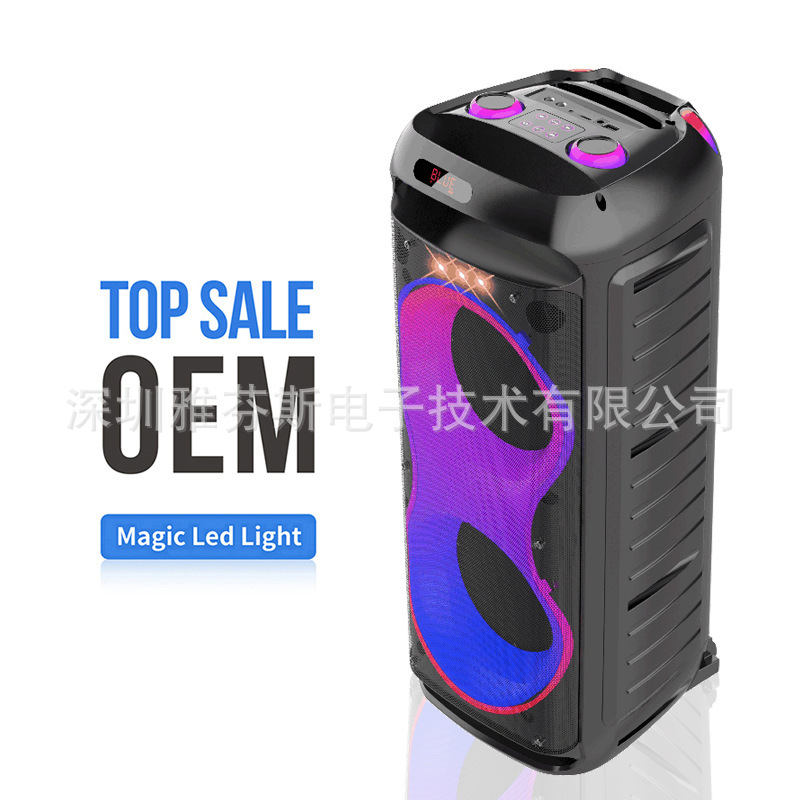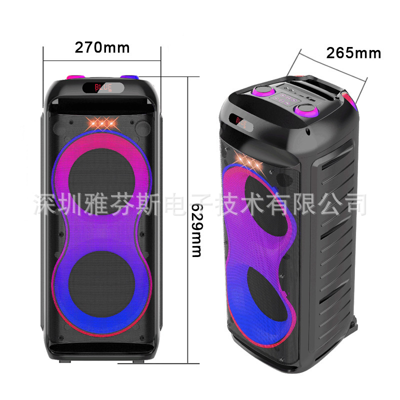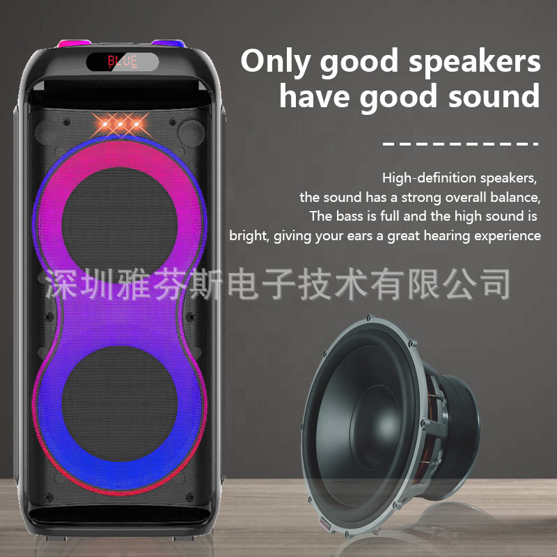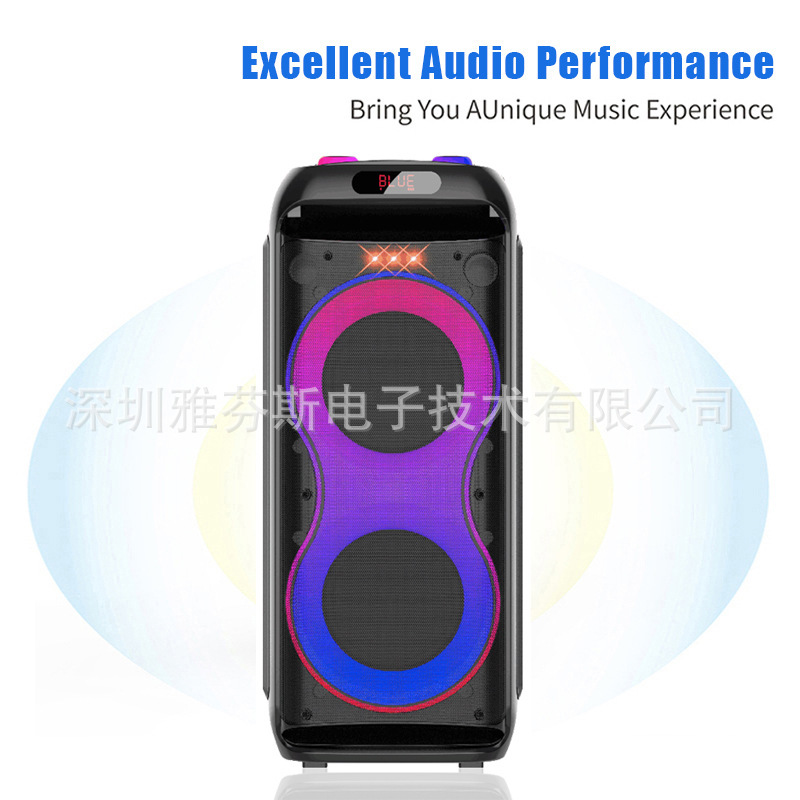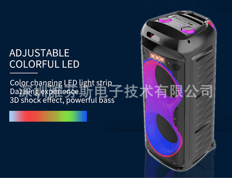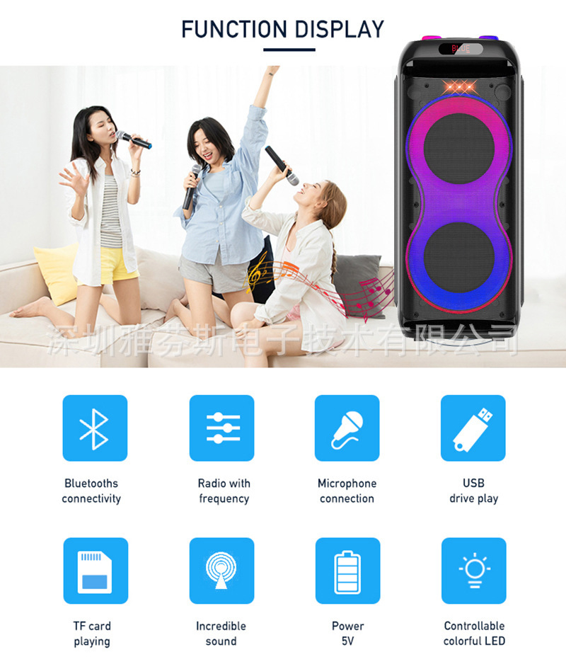 Function: USB, TF card, Bluetooth, AUX,FM, Remote control, TWS, LED display screen, wireless microphone, RGB lighting
