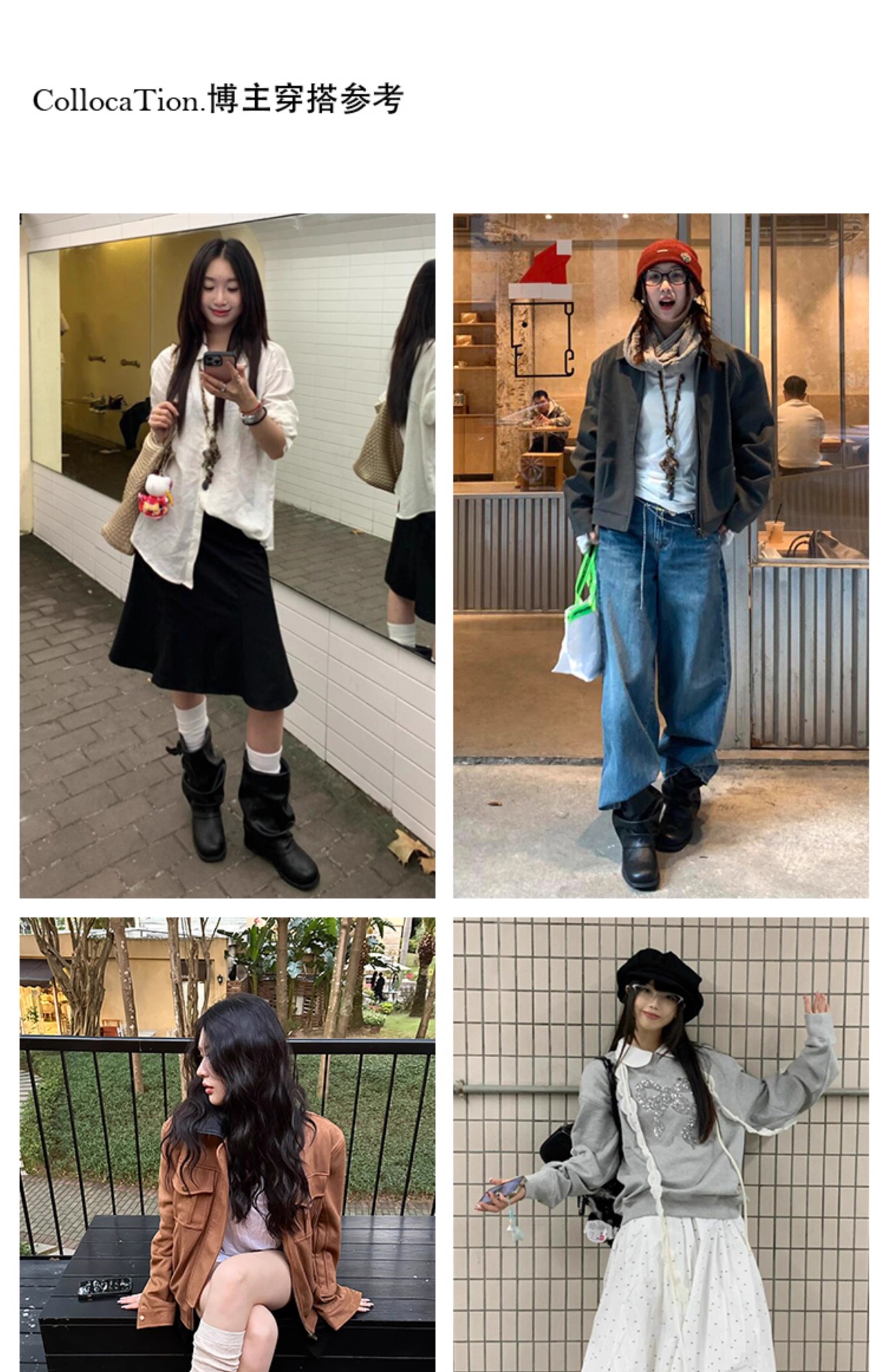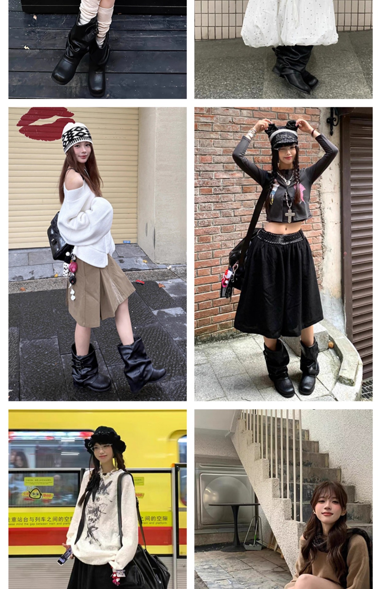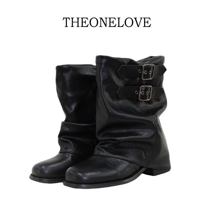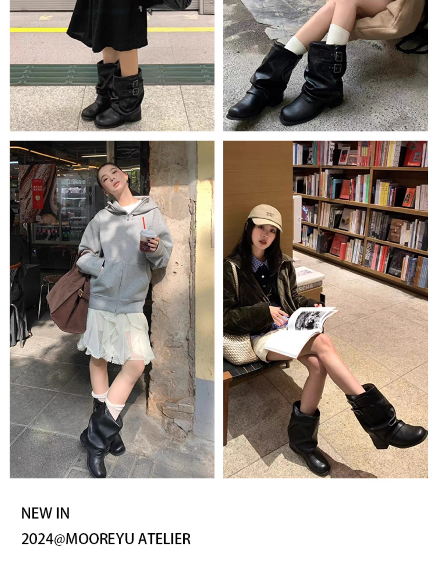 플리츠 핀 버클 블랙 스택 부츠 미드 튜브 두꺼운 힐 오토바이 마틴 부츠 2025 가을 겨울 여성용 새로운 웨스턴 카우보이 부츠스토어 가기
