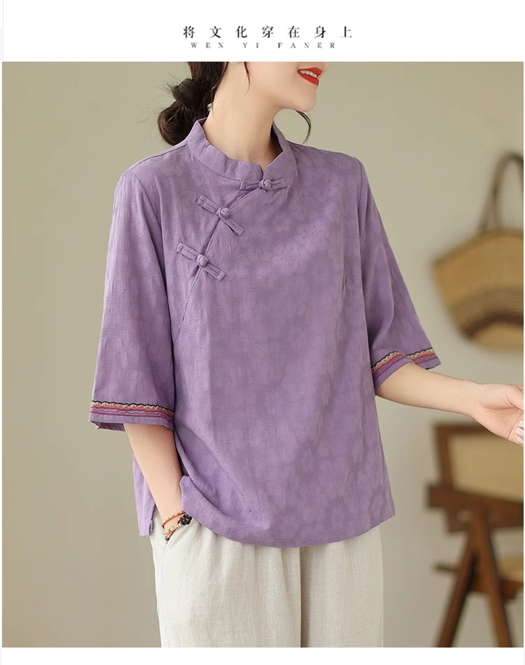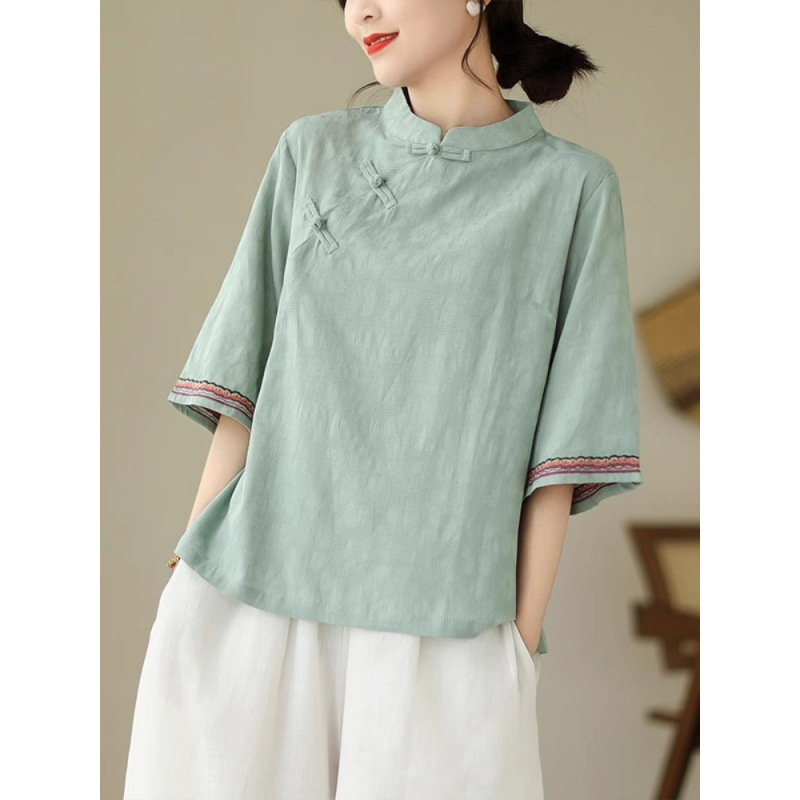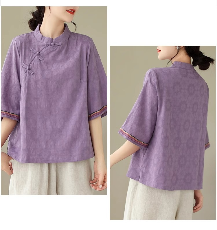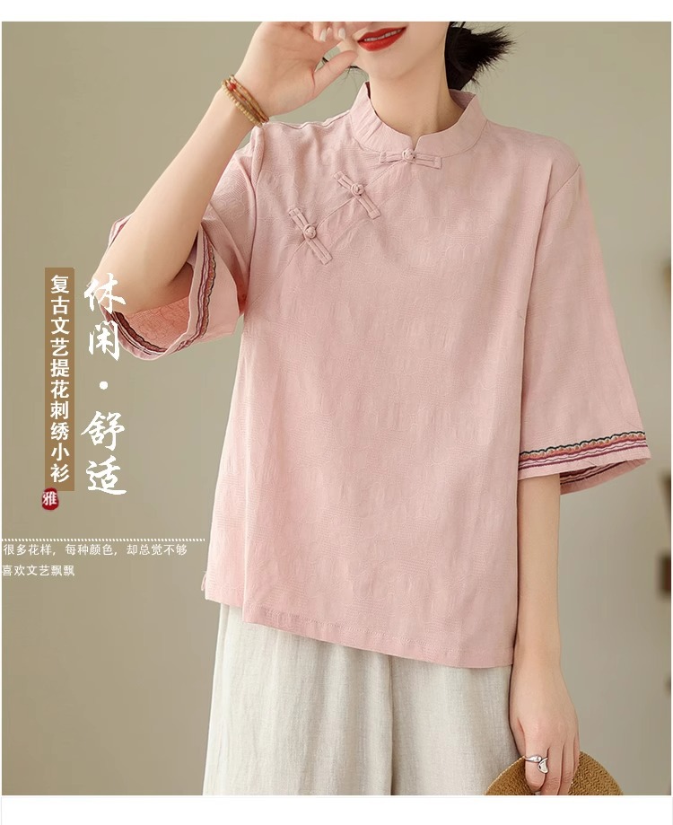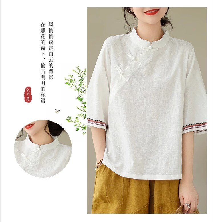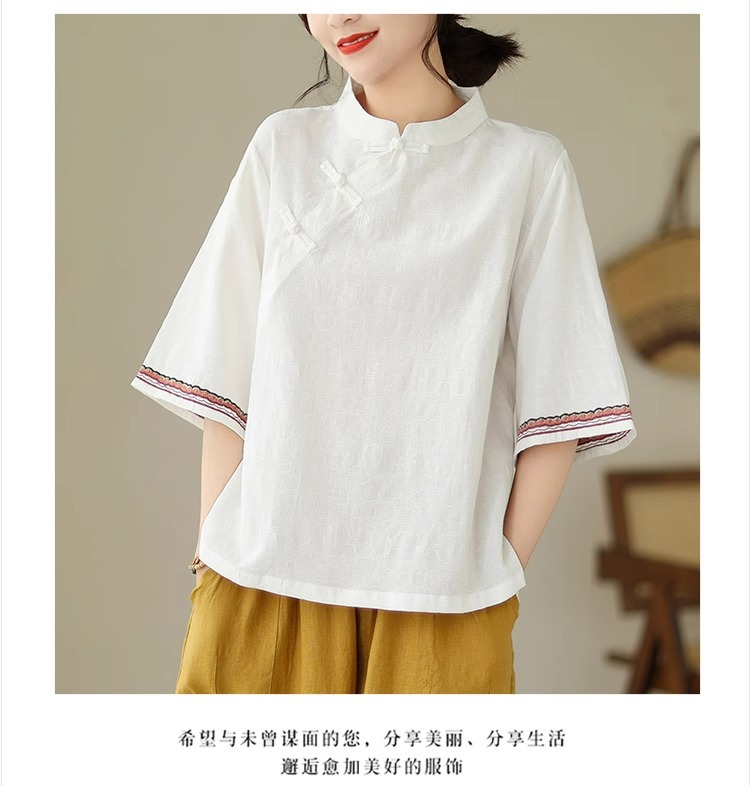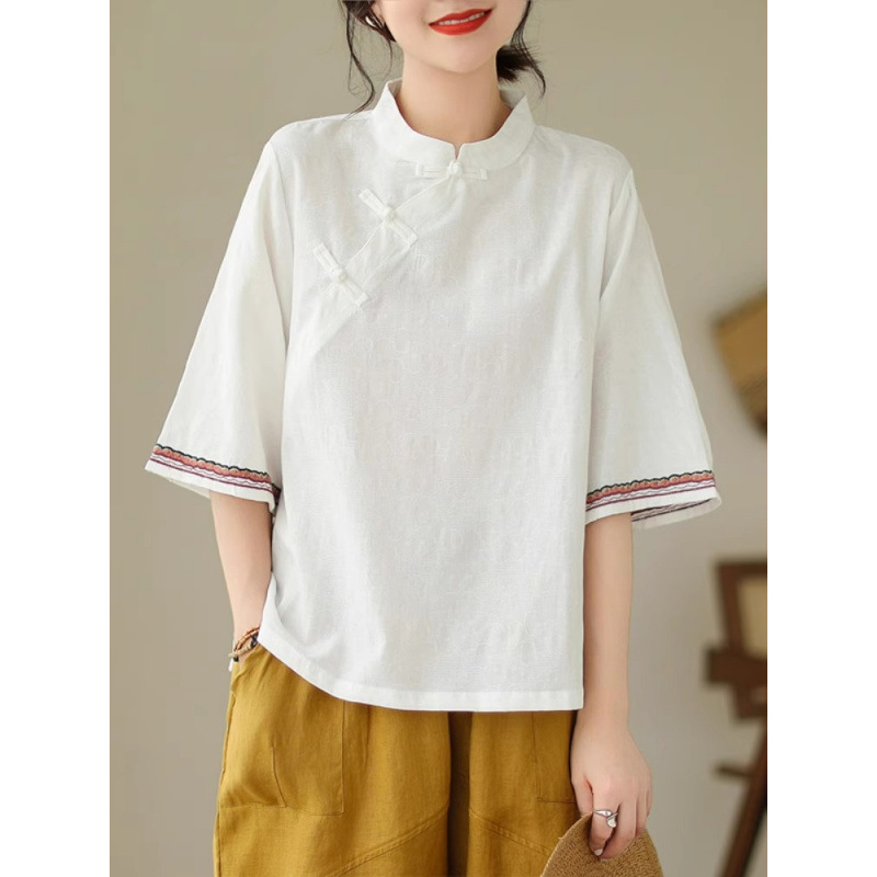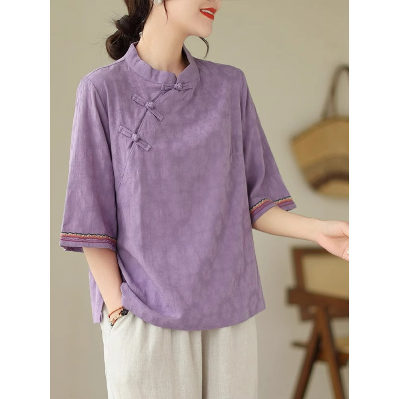 2025 여름 새로운 복고풍 민족 스타일 문학 자카드 느슨한 캐주얼 대각선 가슴 버튼 여성을위한 반팔 셔츠 탑