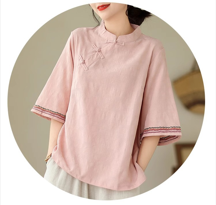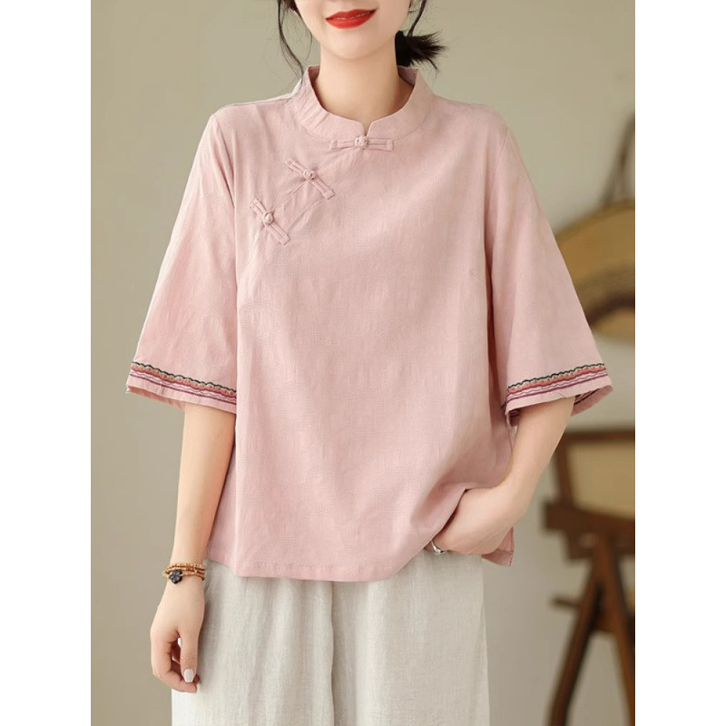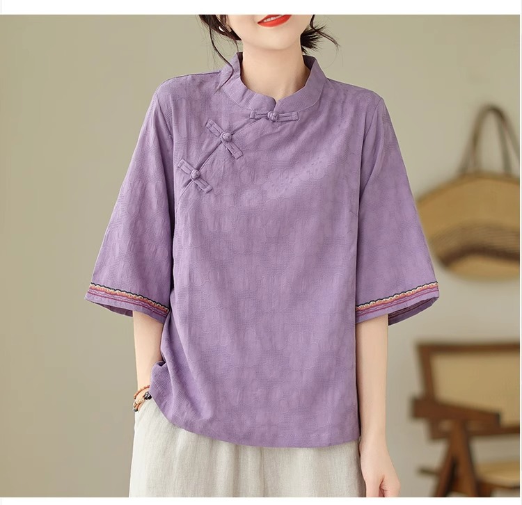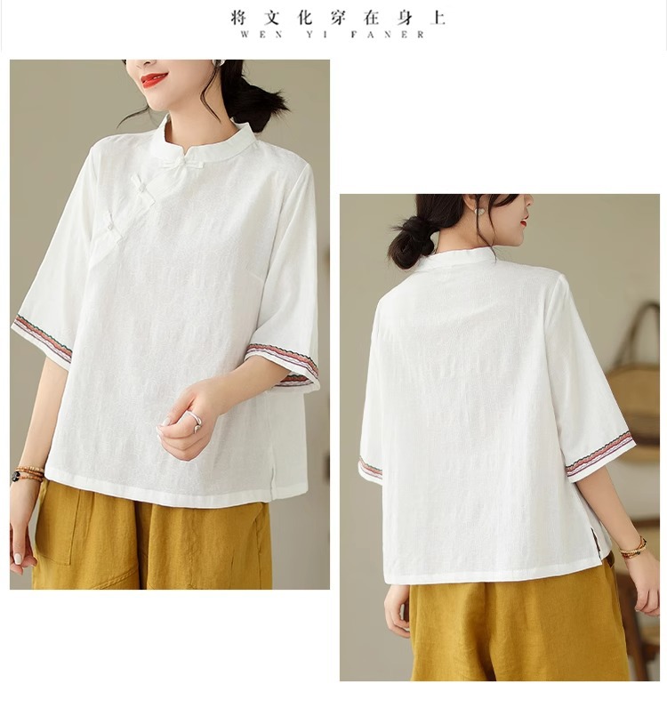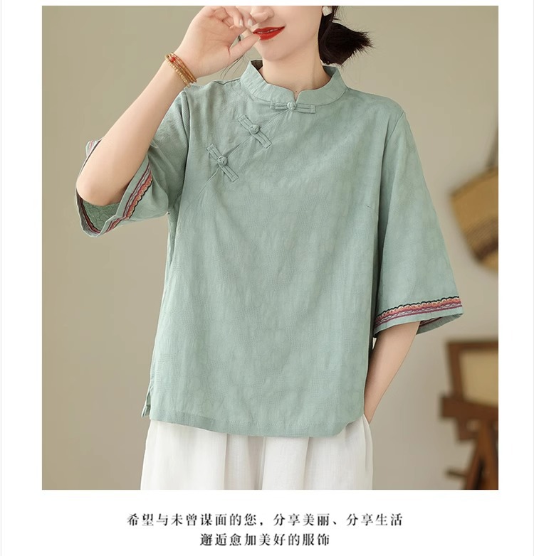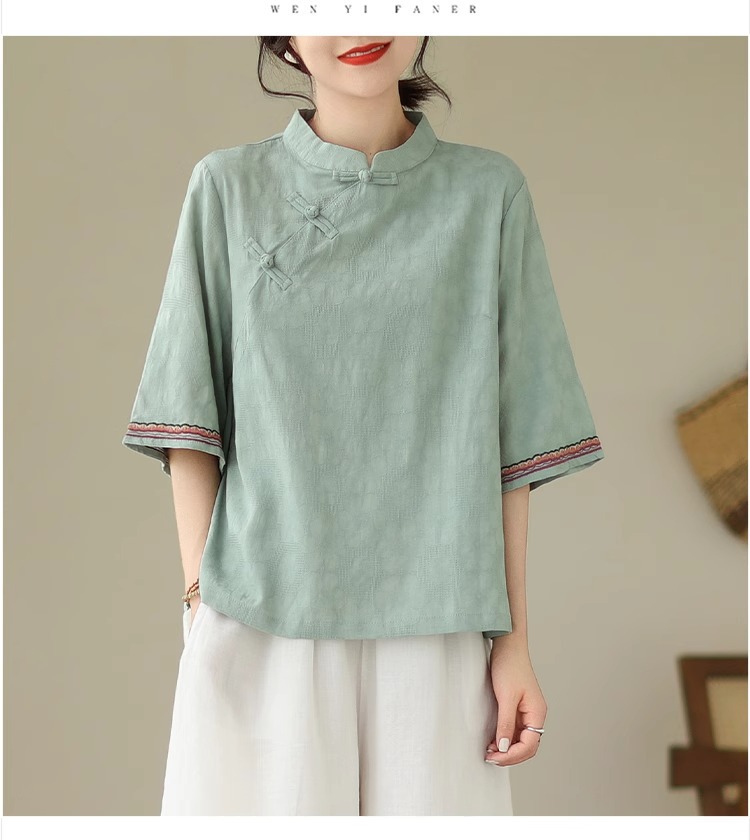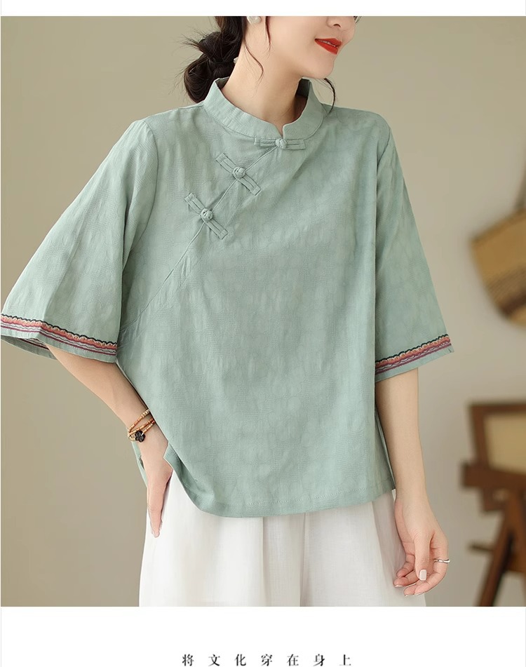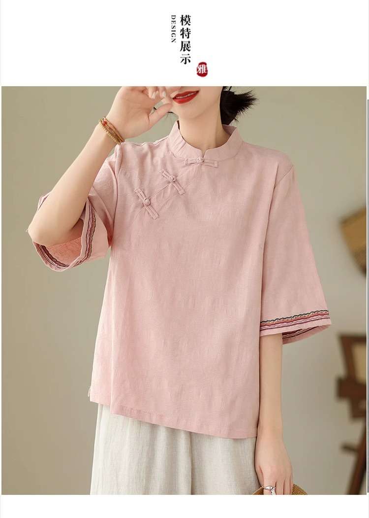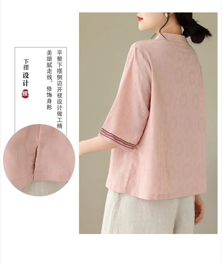2025 여름 새로운 복고풍 민족 스타일 문학 자카드 느슨한 캐주얼 대각선 가슴 버튼 여성을위한 반팔 셔츠 탑