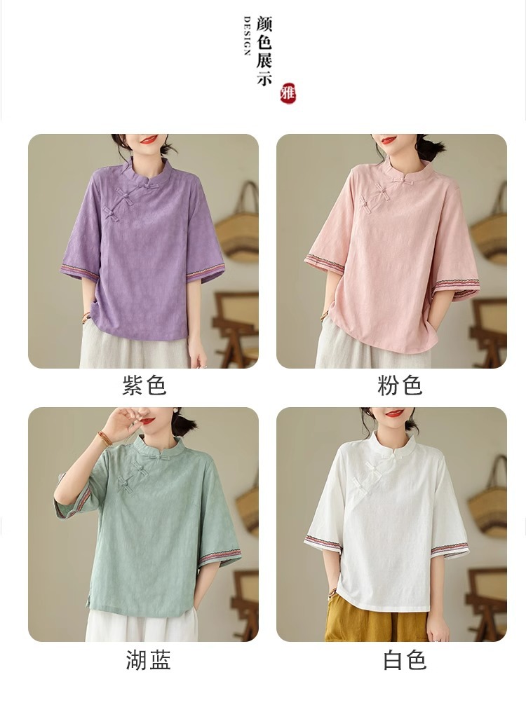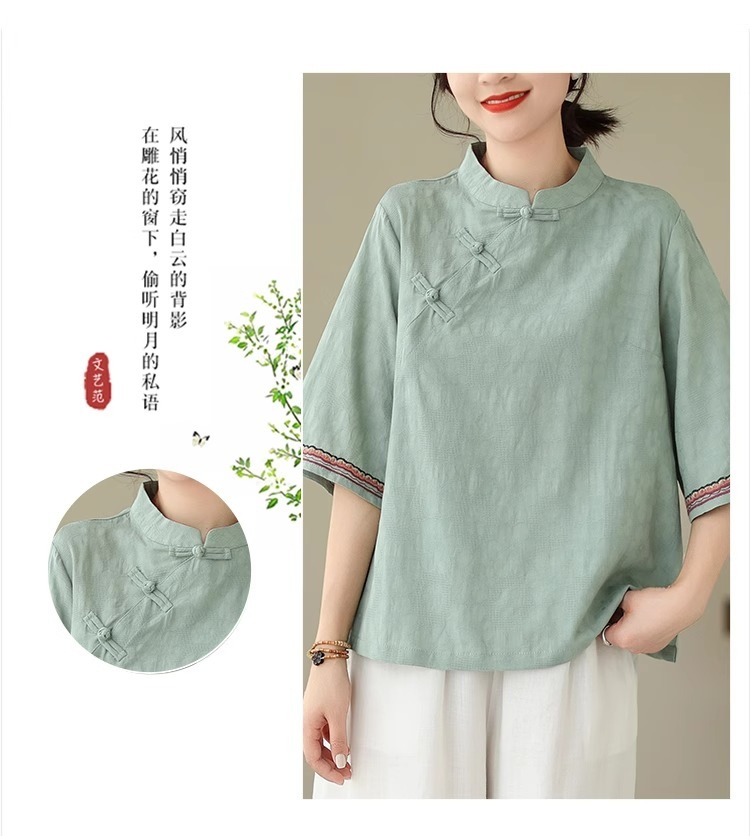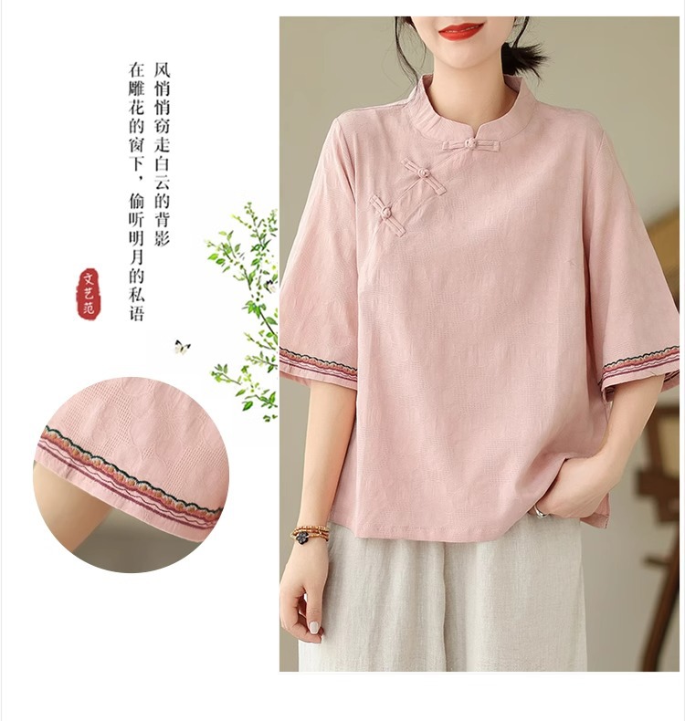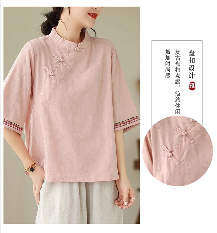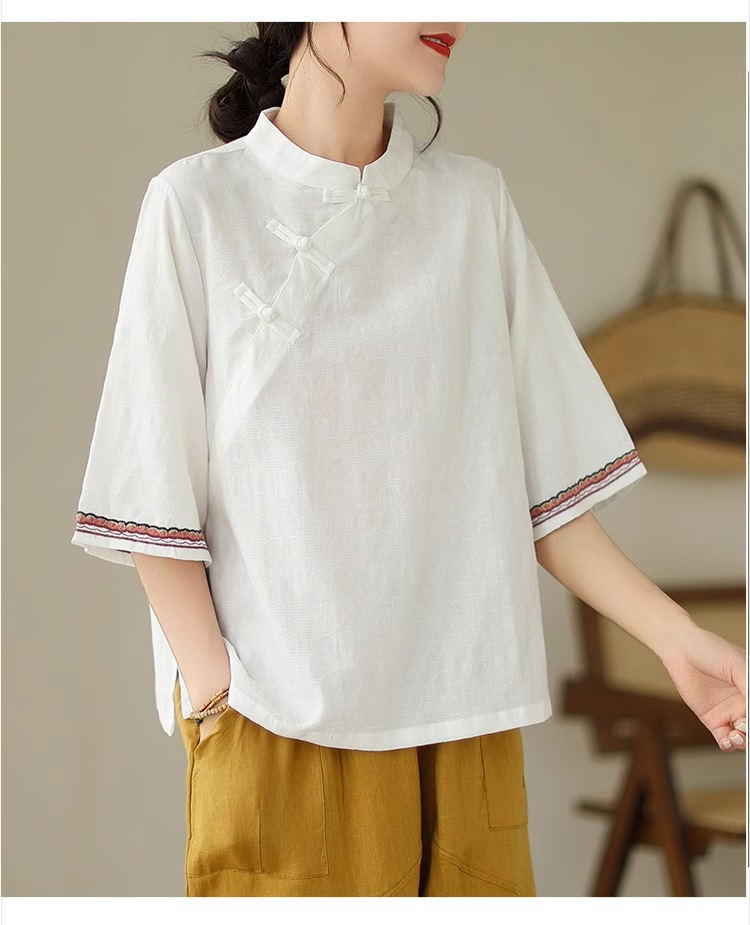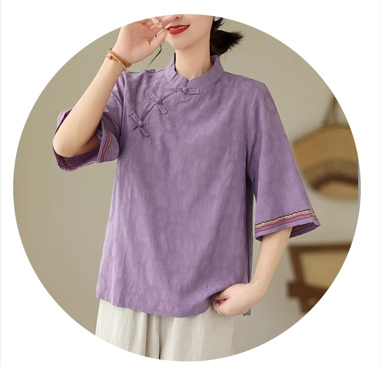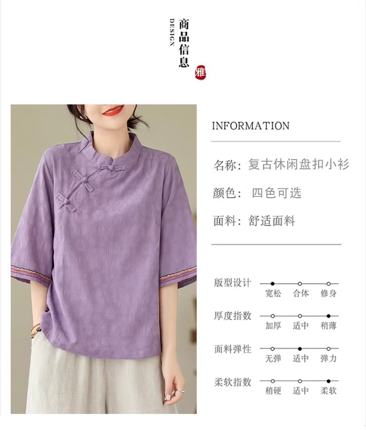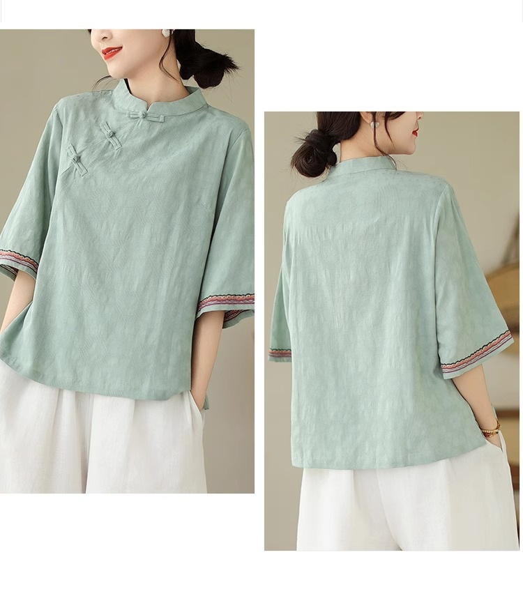 2025 여름 새로운 복고풍 민족 스타일 문학 자카드 느슨한 캐주얼 대각선 가슴 버튼 여성을위한 반팔 셔츠 탑