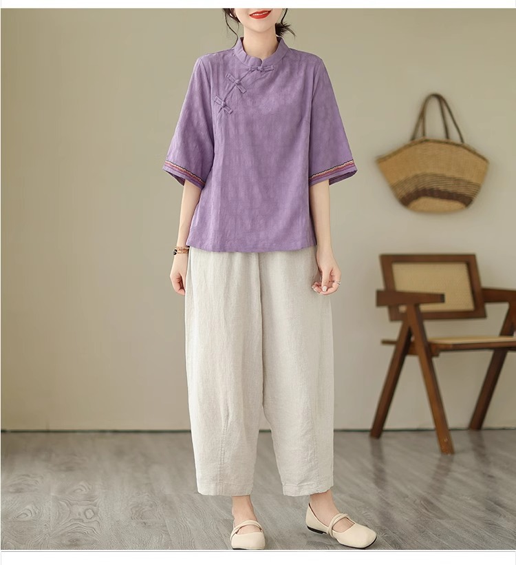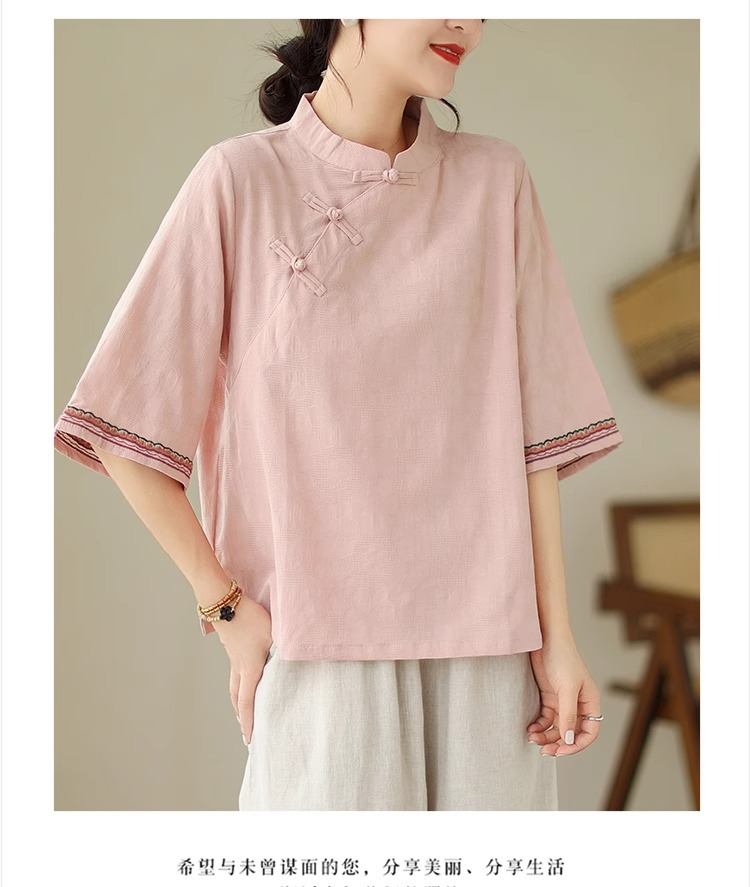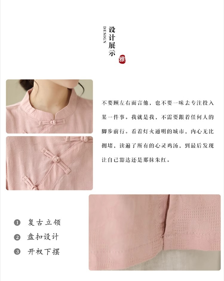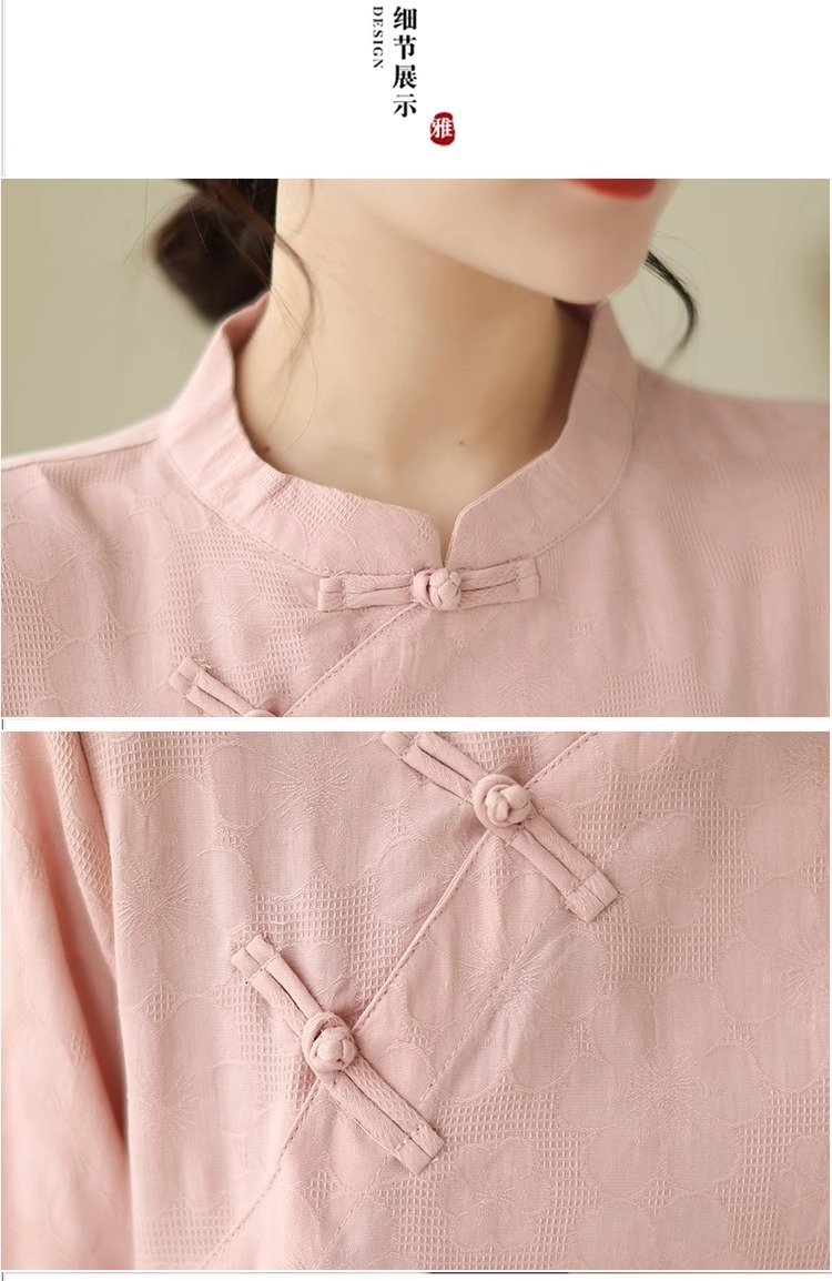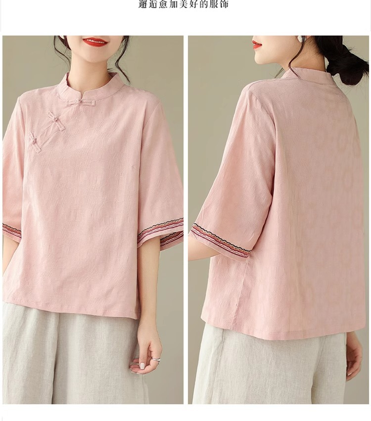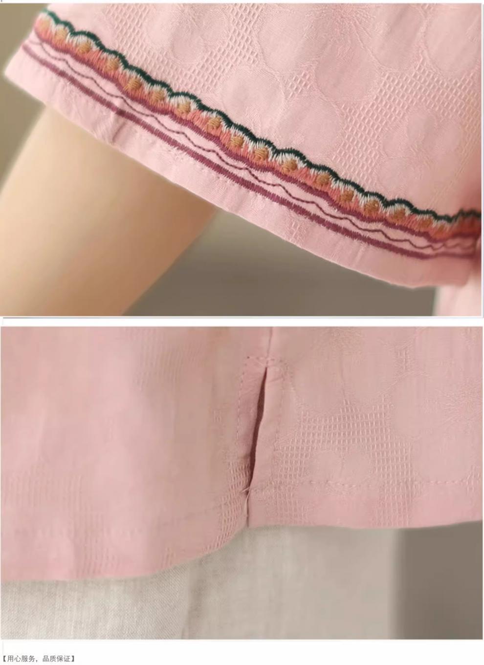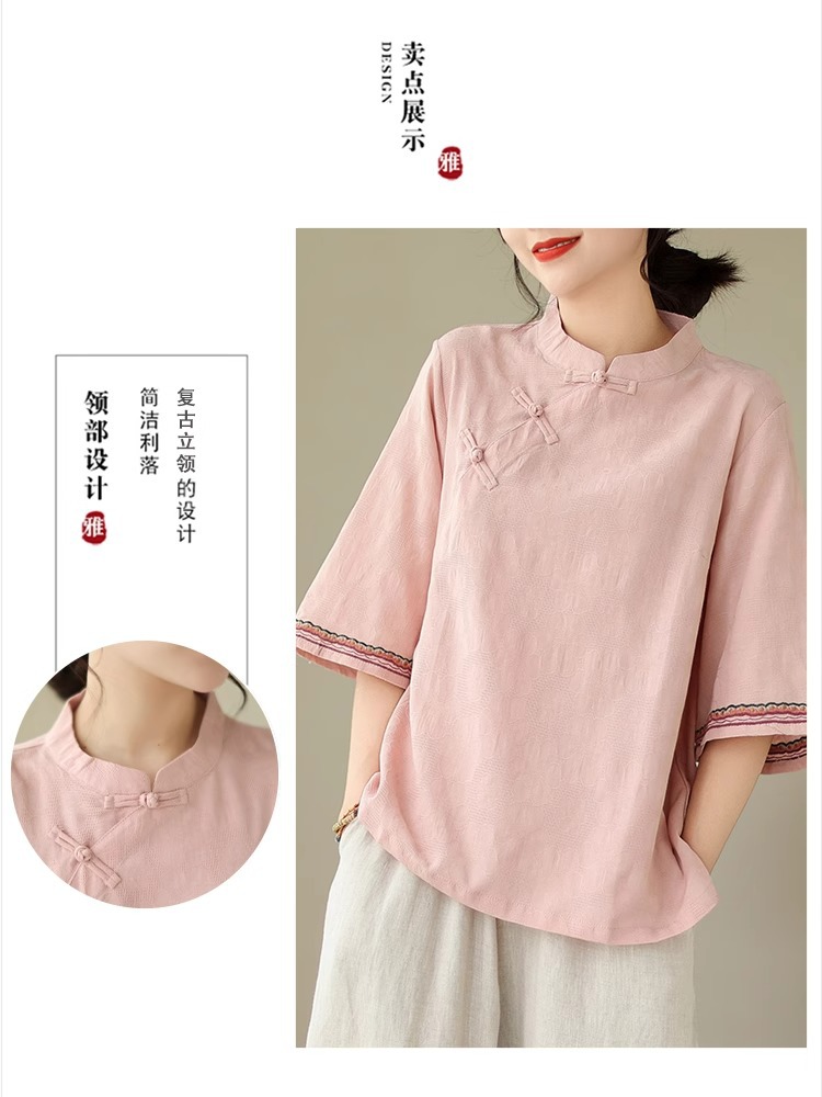 2025 여름 새로운 복고풍 민족 스타일 문학 자카드 느슨한 캐주얼 대각선 가슴 버튼 여성을위한 반팔 셔츠 탑