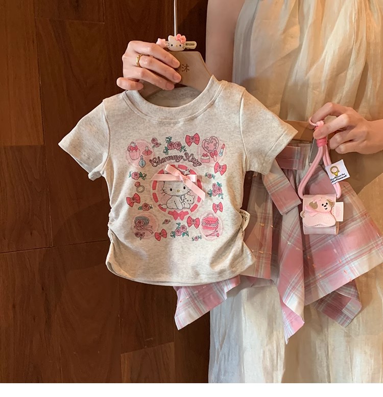 귀여운 소녀 여름 정장 2025 새로운 한국 스타일 아기 반팔 티셔츠 불규칙한 격자 무늬 치마 바지 투피스 세트