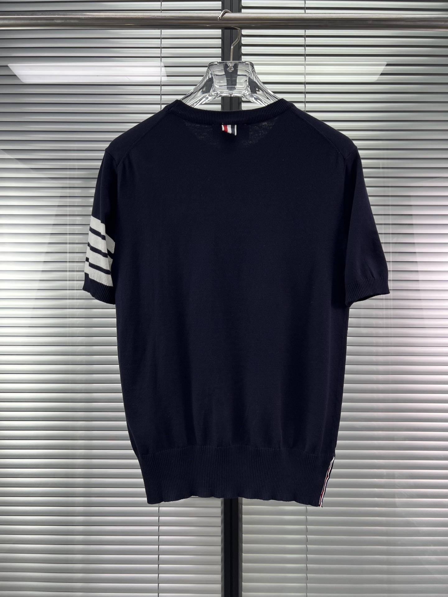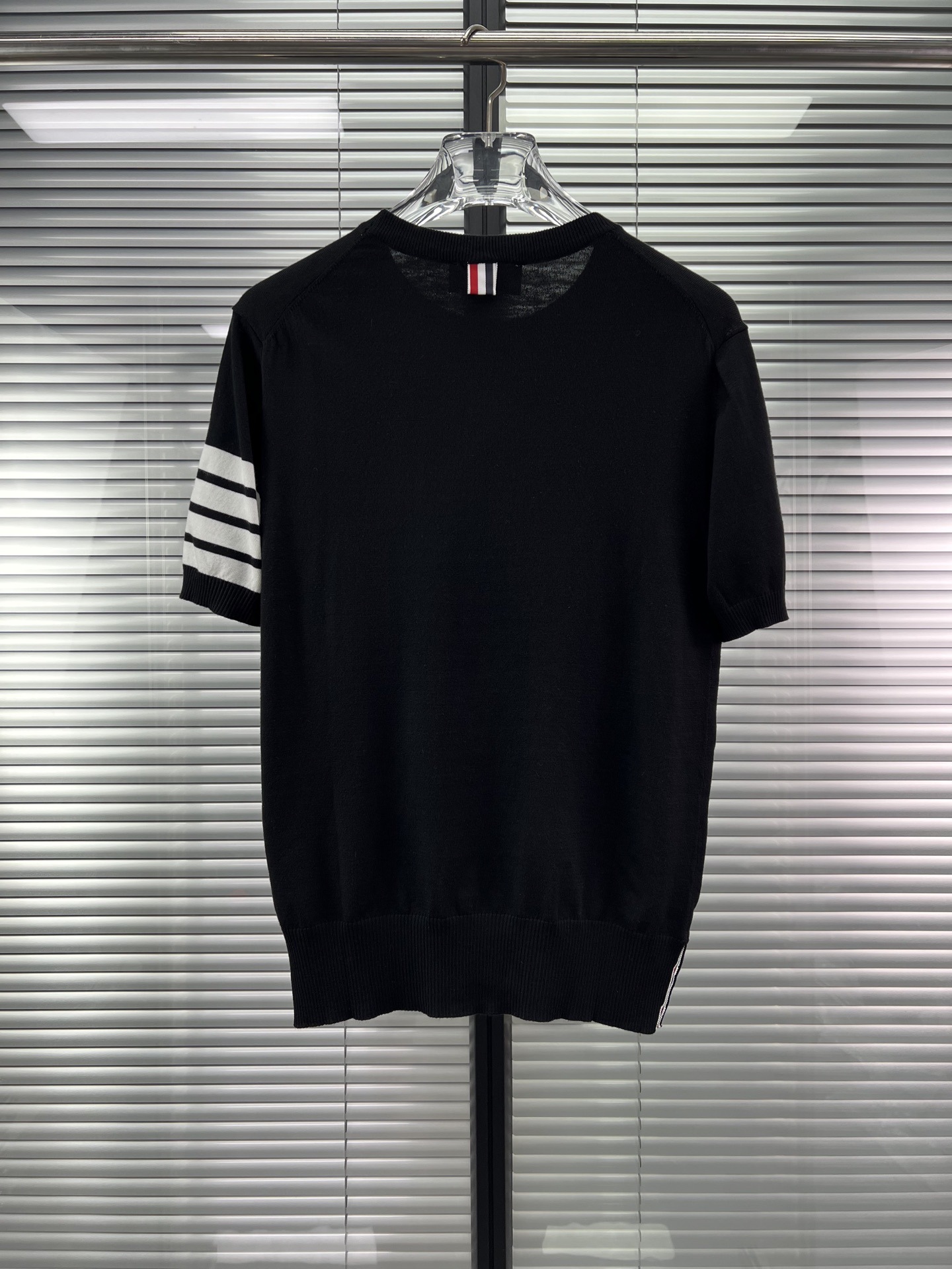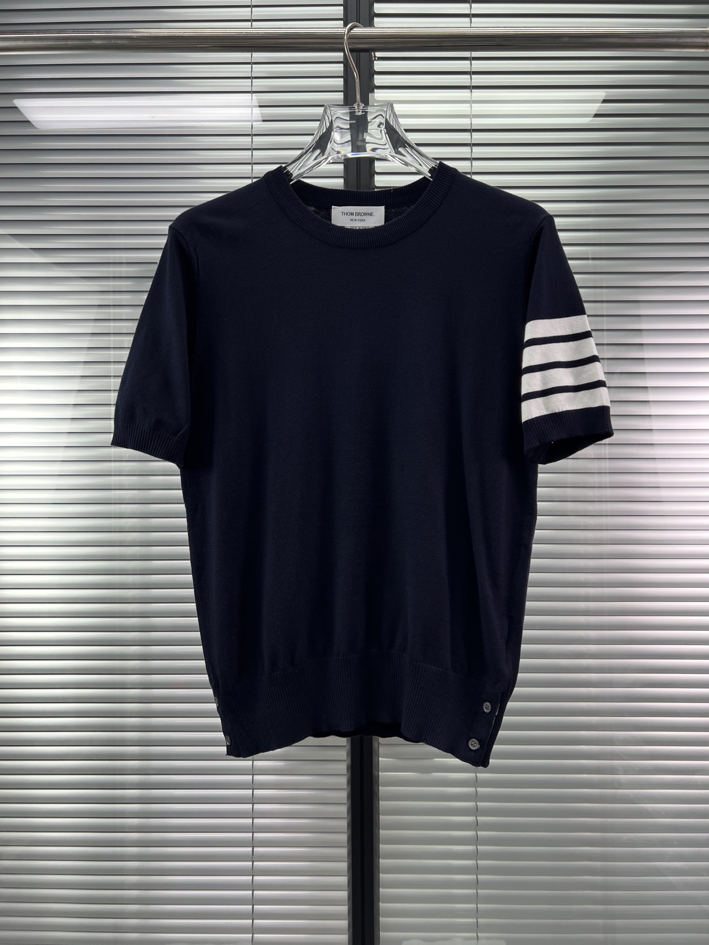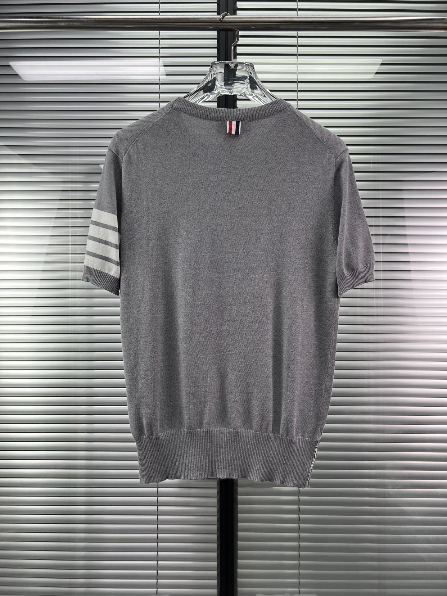 공장 직접 판매 TB 클래식 스트라이프 4바 남성용 니트 캐주얼 다용도 라운드 넥 남성용 및 여성용 반팔 탑스토어 가기