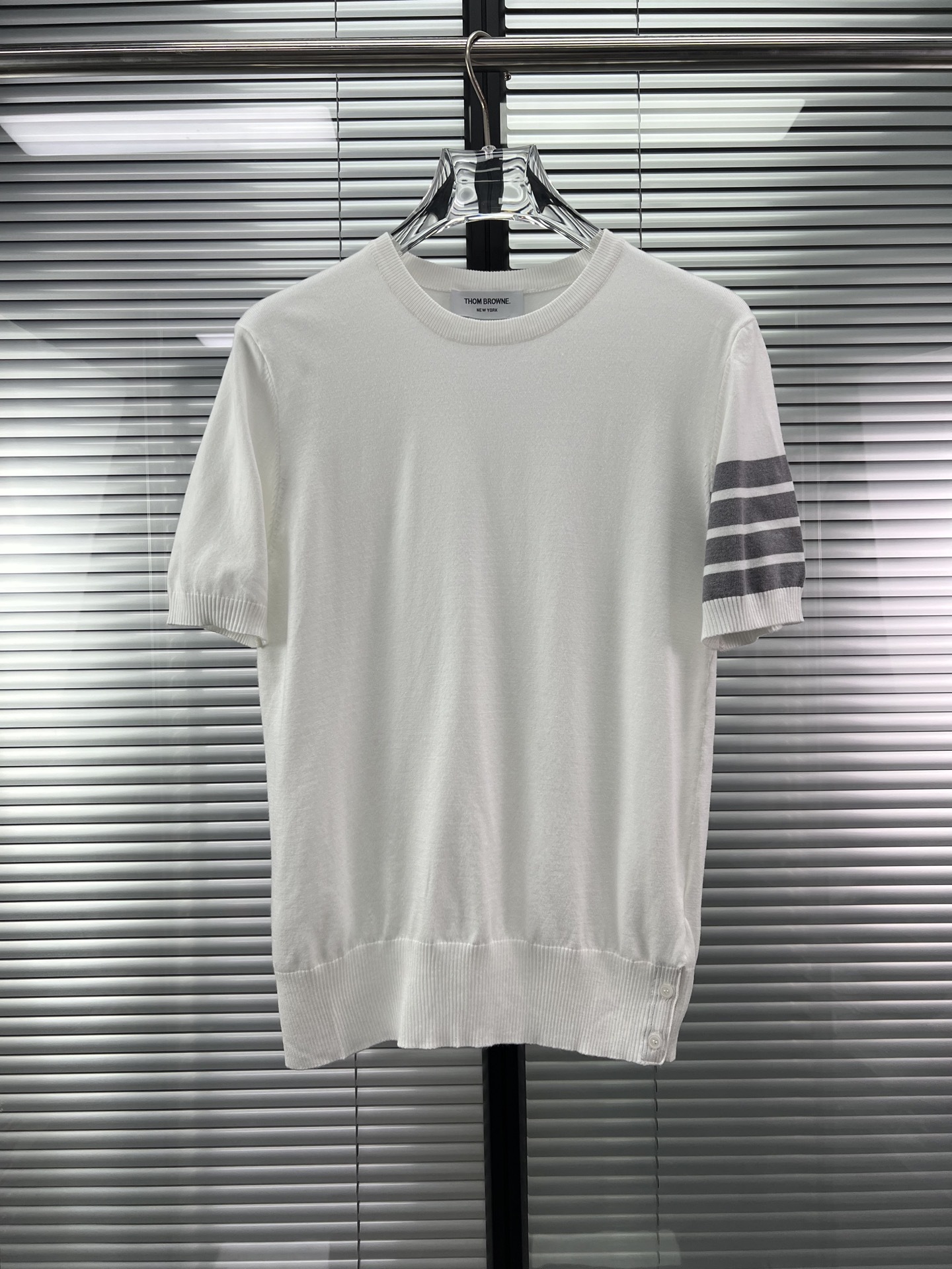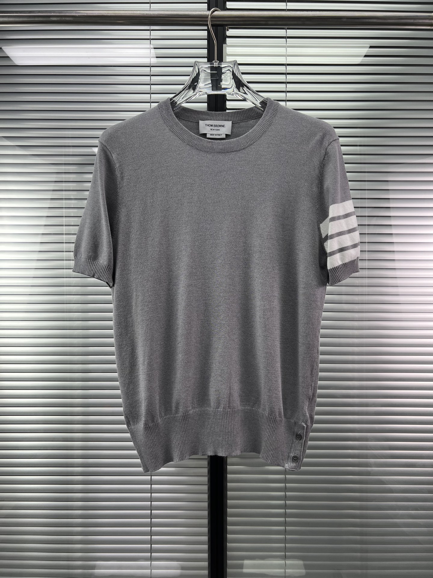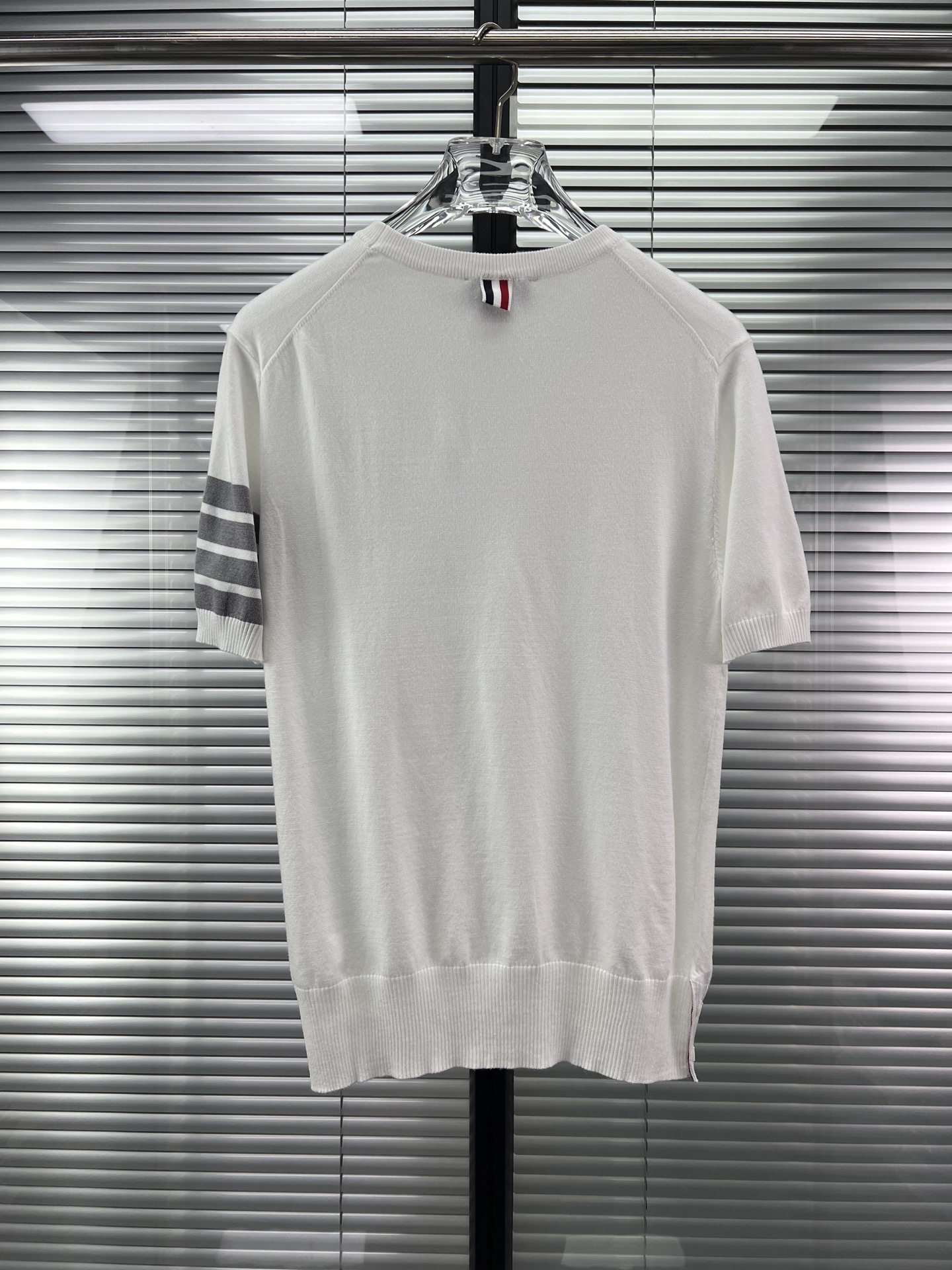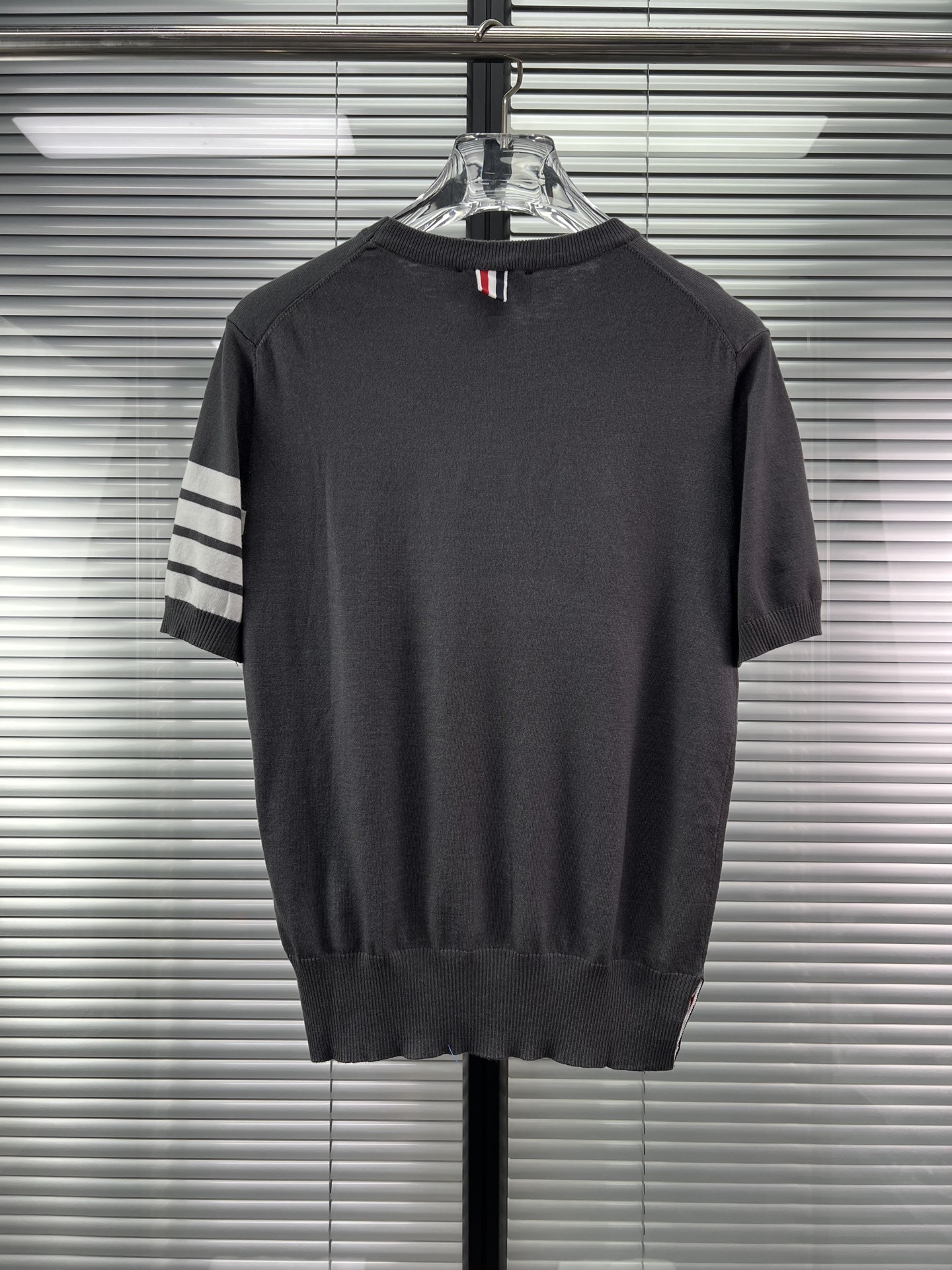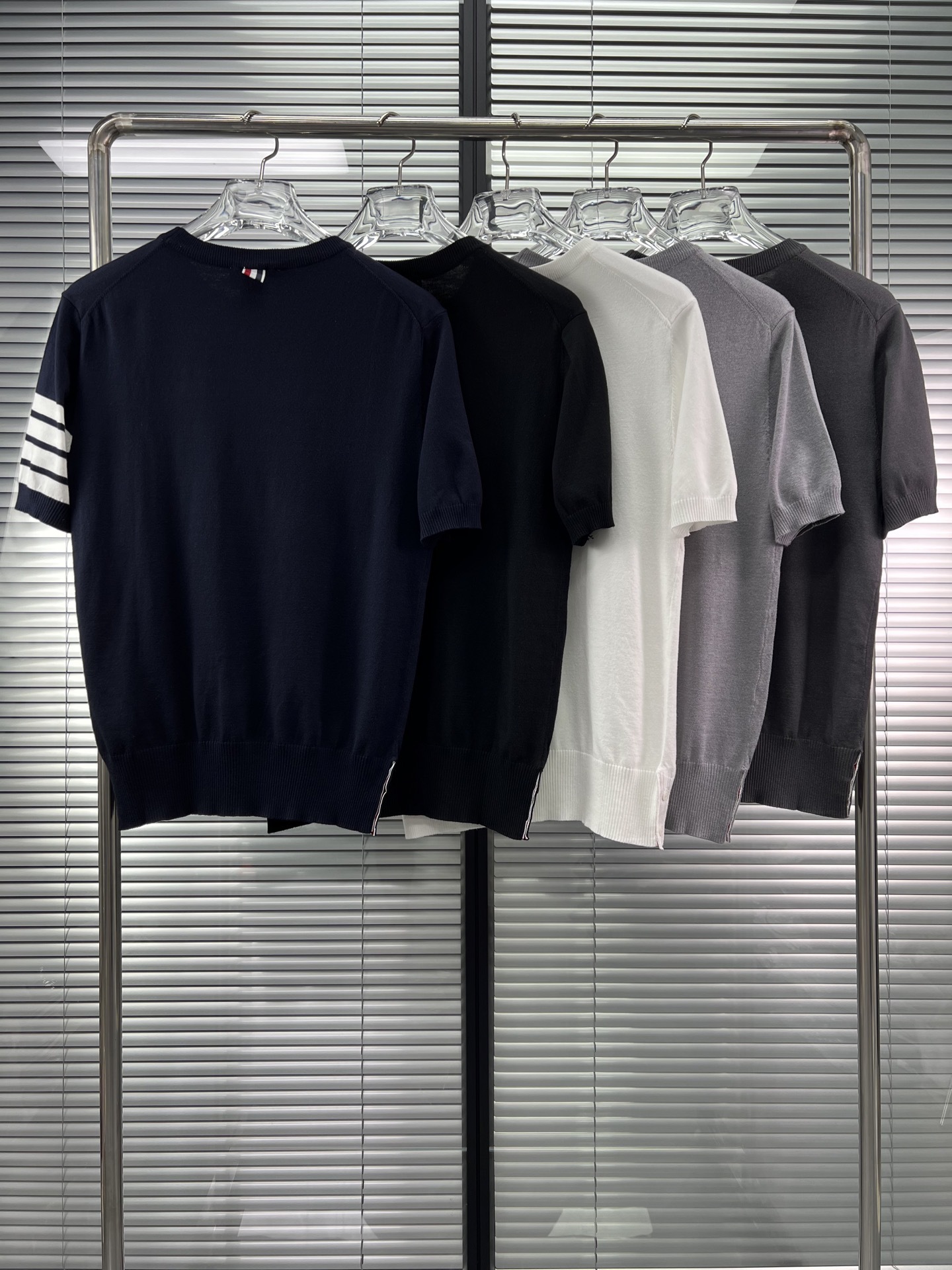 공장 직접 판매 TB 클래식 스트라이프 4바 남성용 니트 캐주얼 다용도 라운드 넥 남성용 및 여성용 반팔 탑스토어 가기