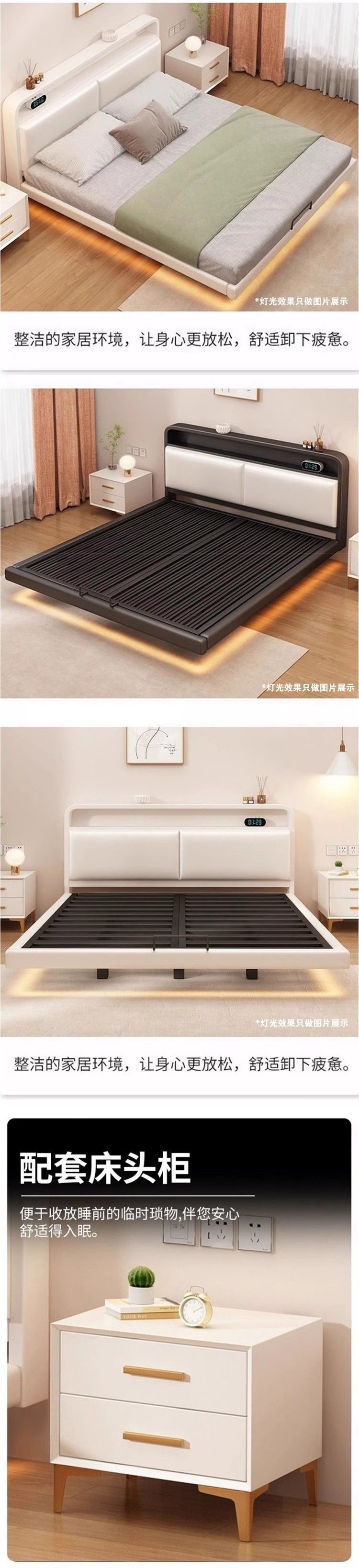 • ++업그레이드된 크림색 흰색 행 프레임(라이트 스트립 및 미끄럼 방지 지지대 포함)(침대 옆에 물건 보관 가능) +-+