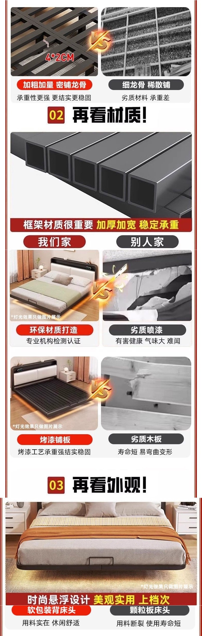 • ++업그레이드된 클래식 블랙 밀도 스타일(라이트 스트립 및 미끄럼 방지 지지대 포함)(침대 옆에 물건 보관 가능) +-+