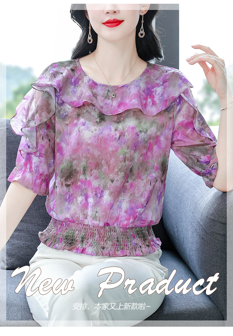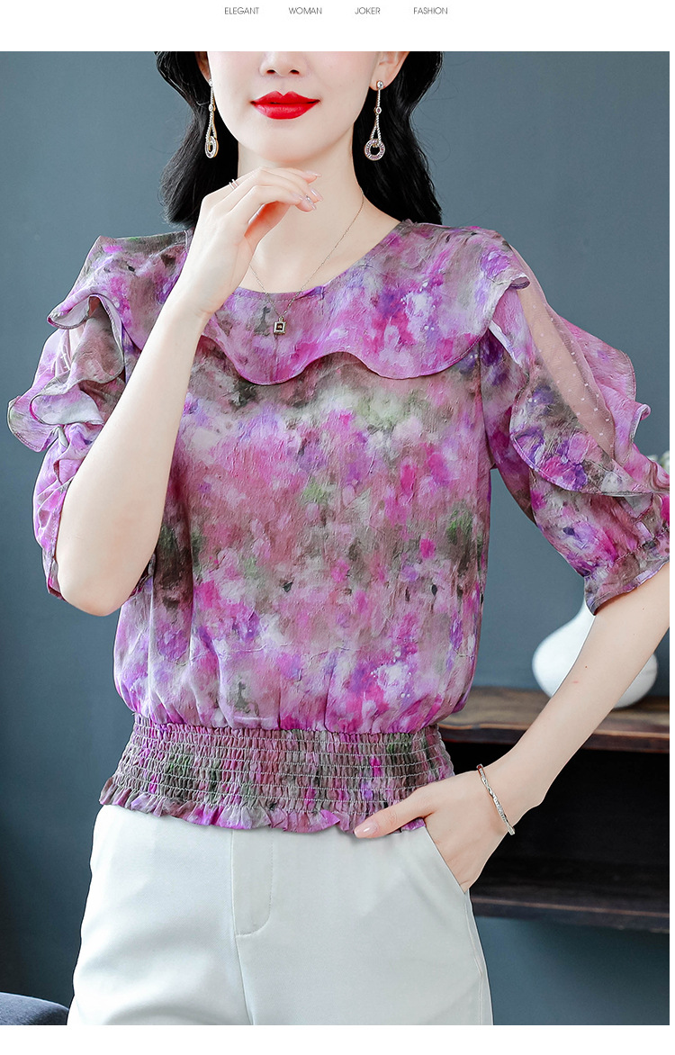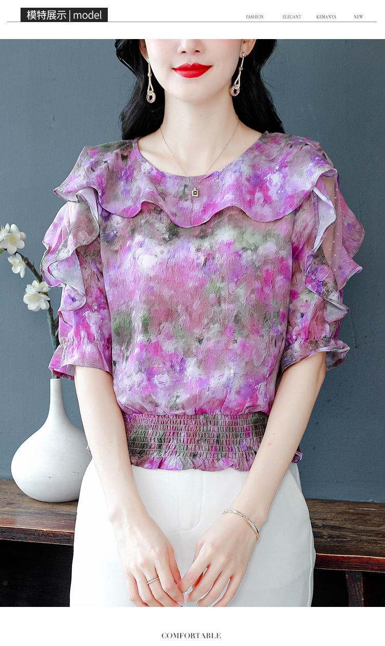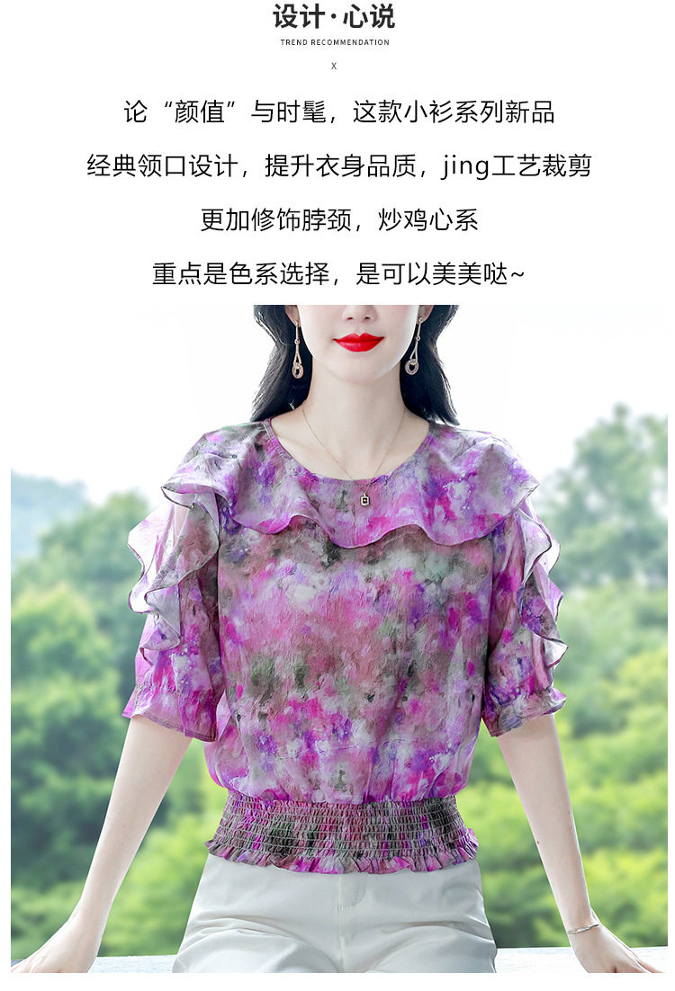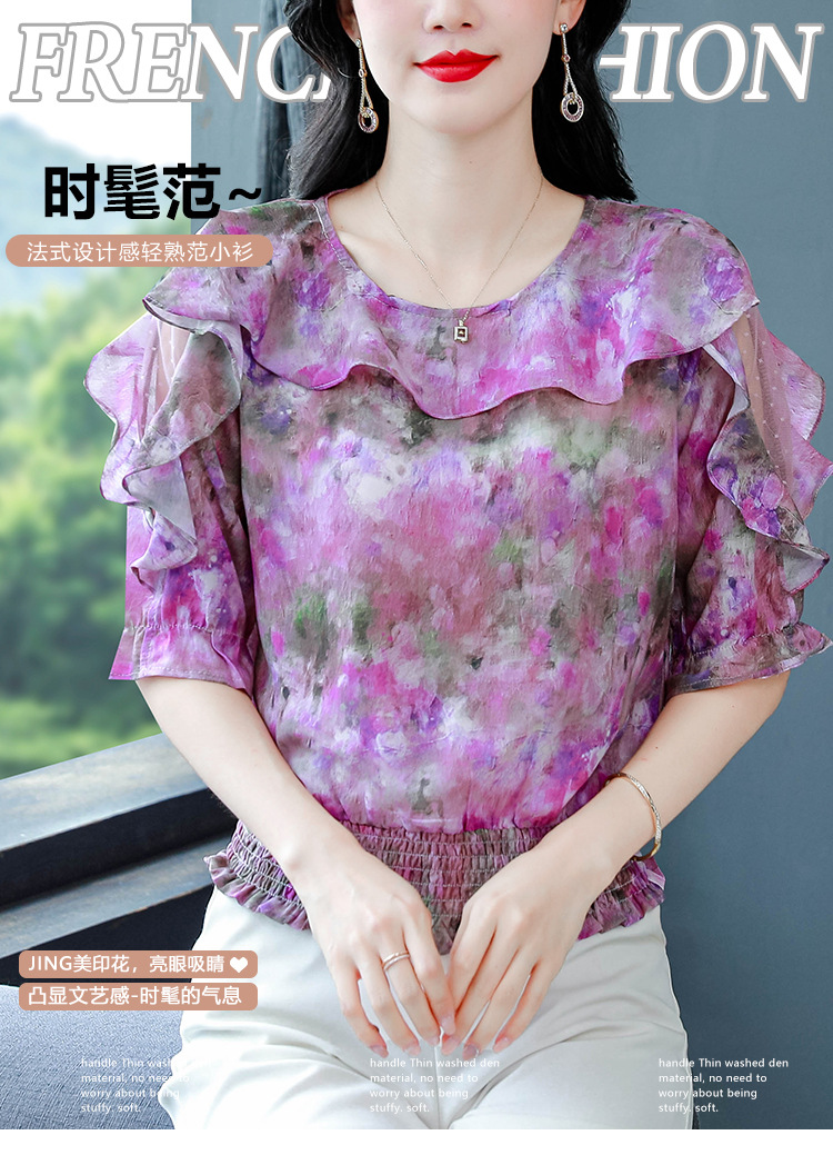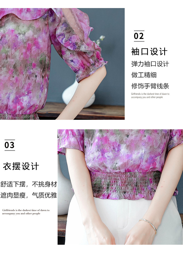 dydd3155 여성을위한 세련된 달콤한 프린트 쉬폰 셔츠 2025 여름 새로운 다목적 5부 소매 짧은 탑