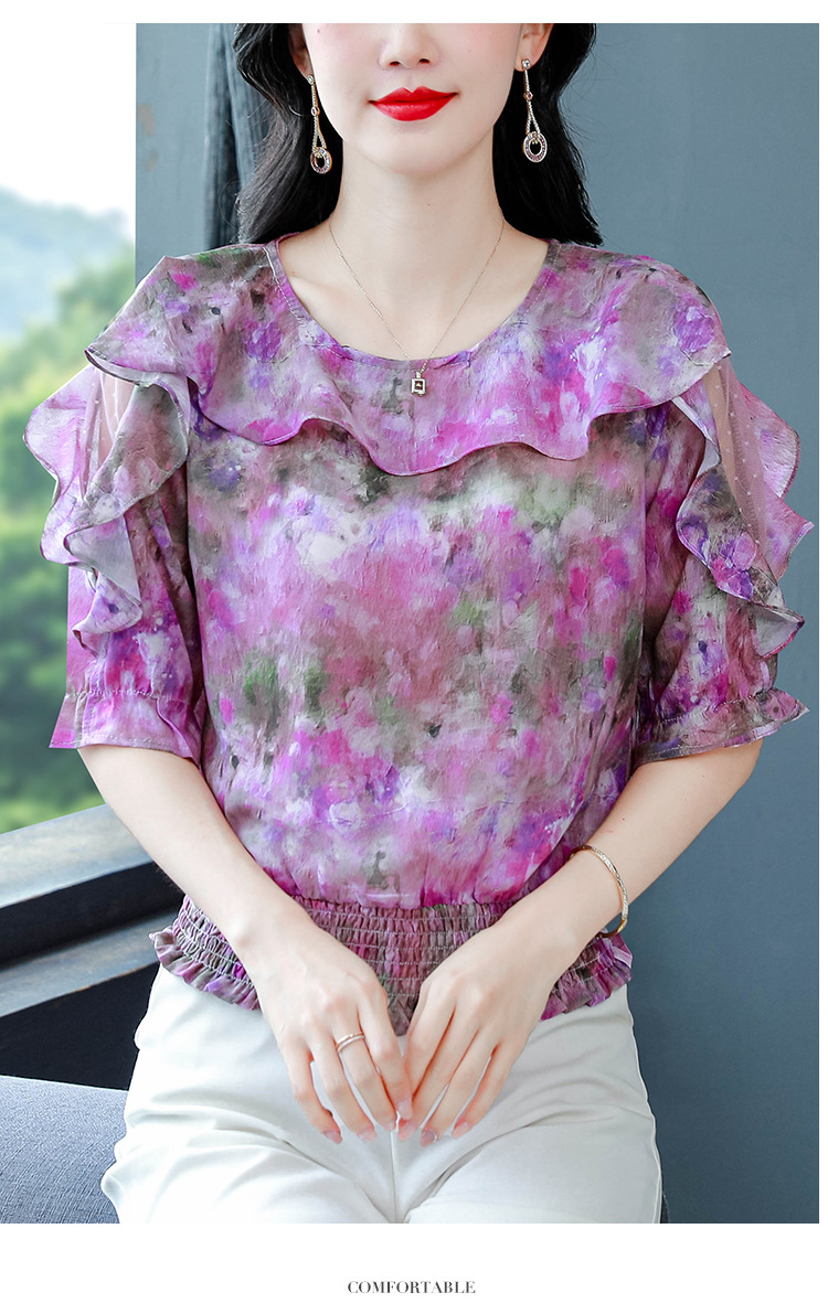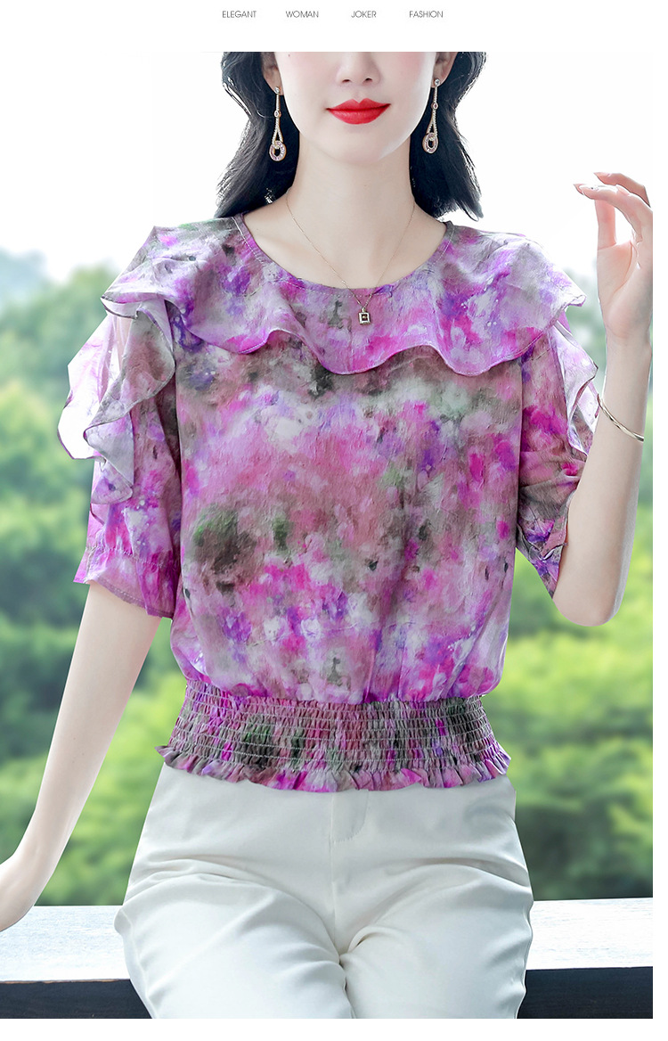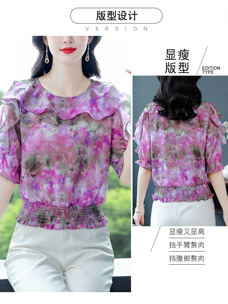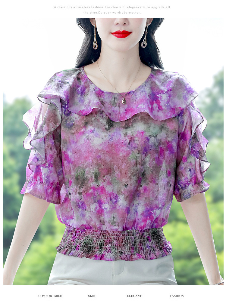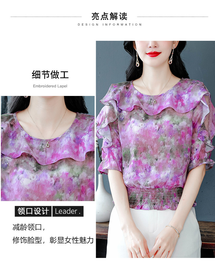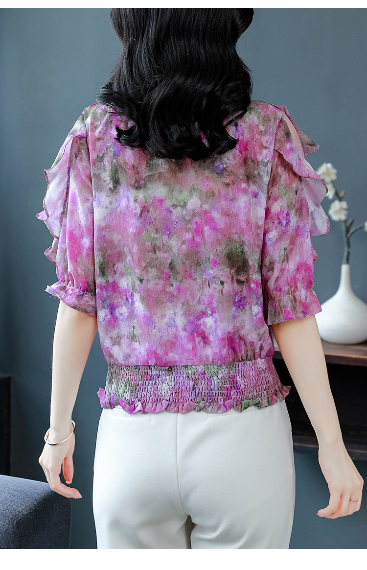 dydd3155 여성을위한 세련된 달콤한 프린트 쉬폰 셔츠 2025 여름 새로운 다목적 5부 소매 짧은 탑