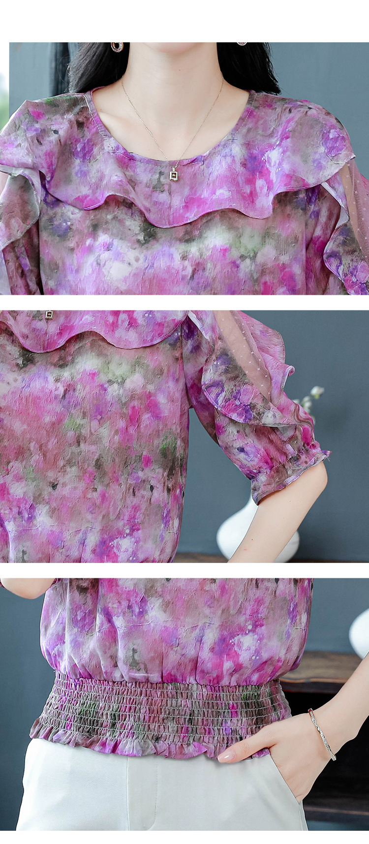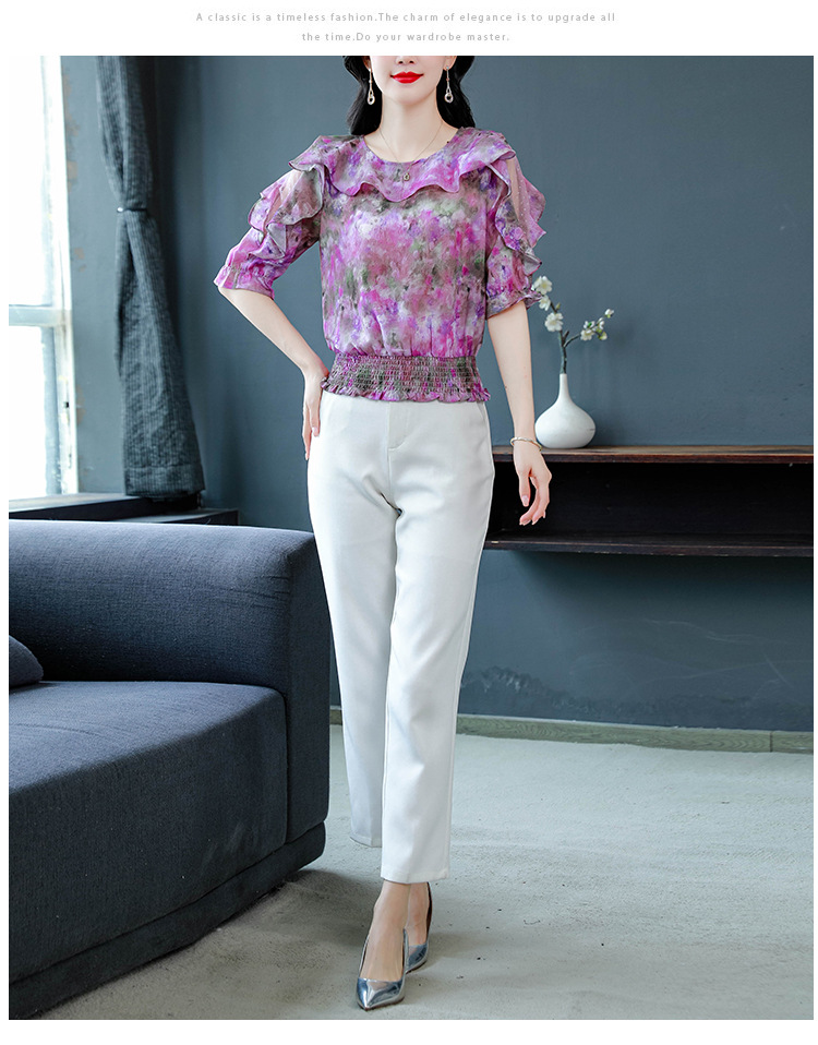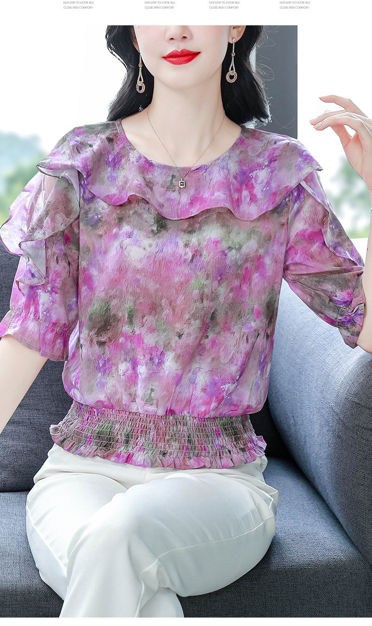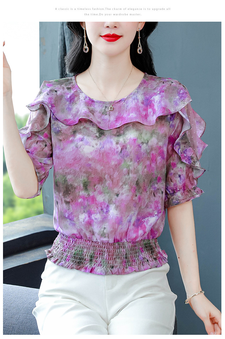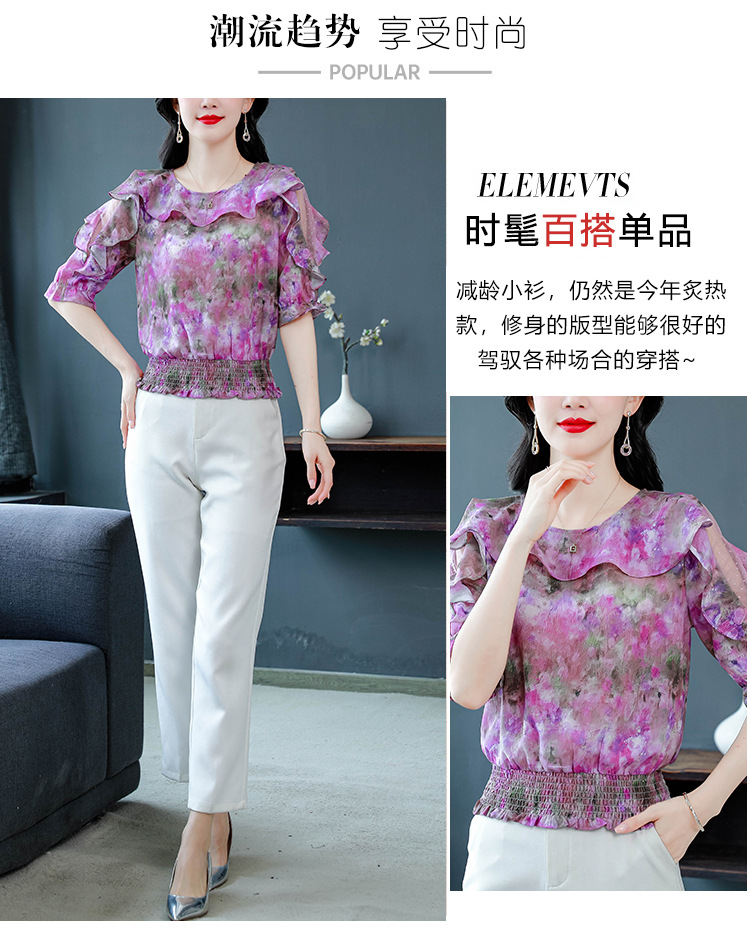 dydd3155 여성을위한 세련된 달콤한 프린트 쉬폰 셔츠 2025 여름 새로운 다목적 5부 소매 짧은 탑