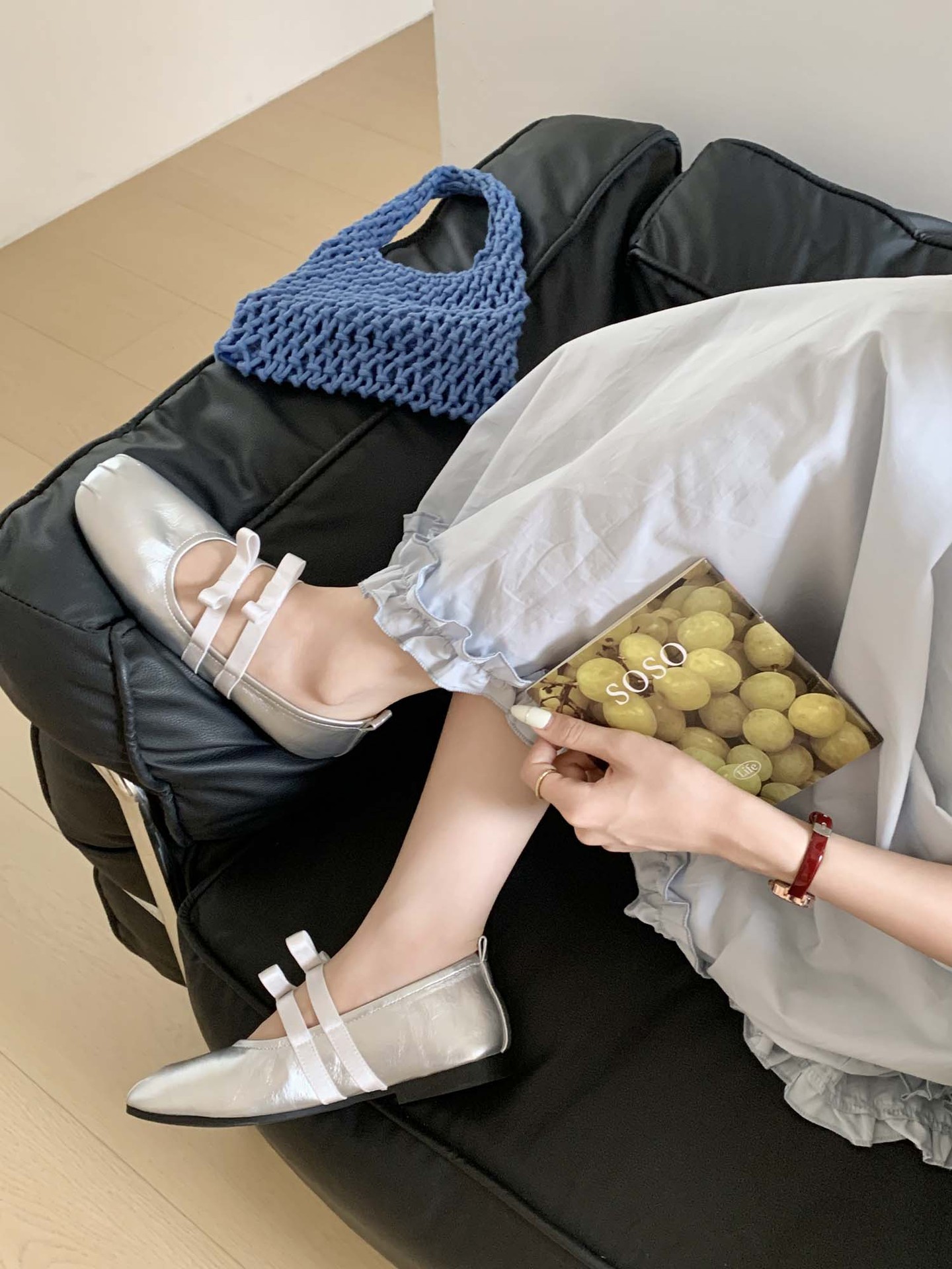 2025년 여름 신상 프렌치 메리제인 슈즈, 더블 보우, 스퀘어 토, 얕은 입술, 스커트와 어울리는 플랫 슈즈