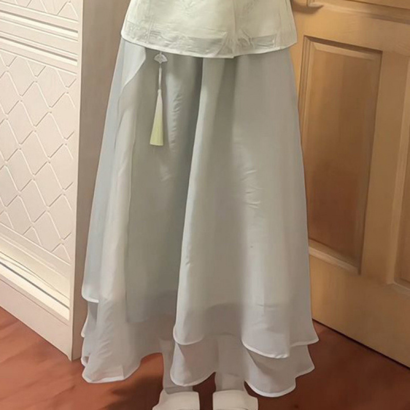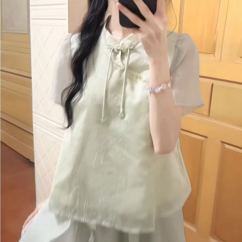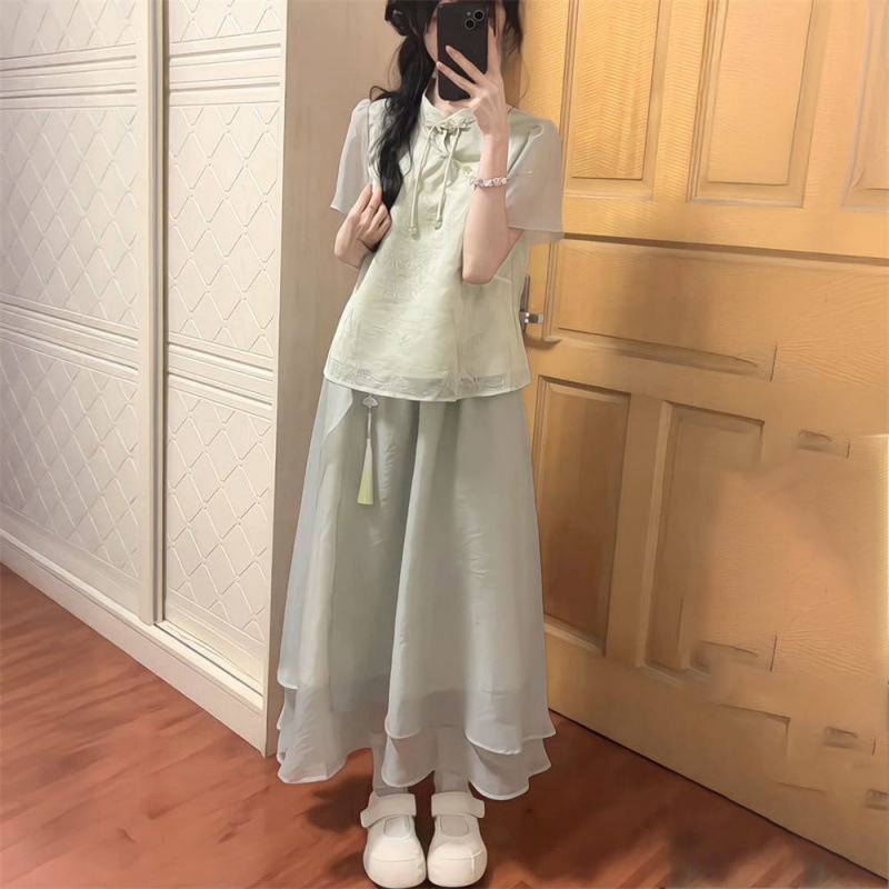 초여름 투피스 슈트, 새로운 중국 스타일의 자수 스플라이싱 한복 버튼 탑, 여학생용 하이웨이스트 스커트스토어 가기