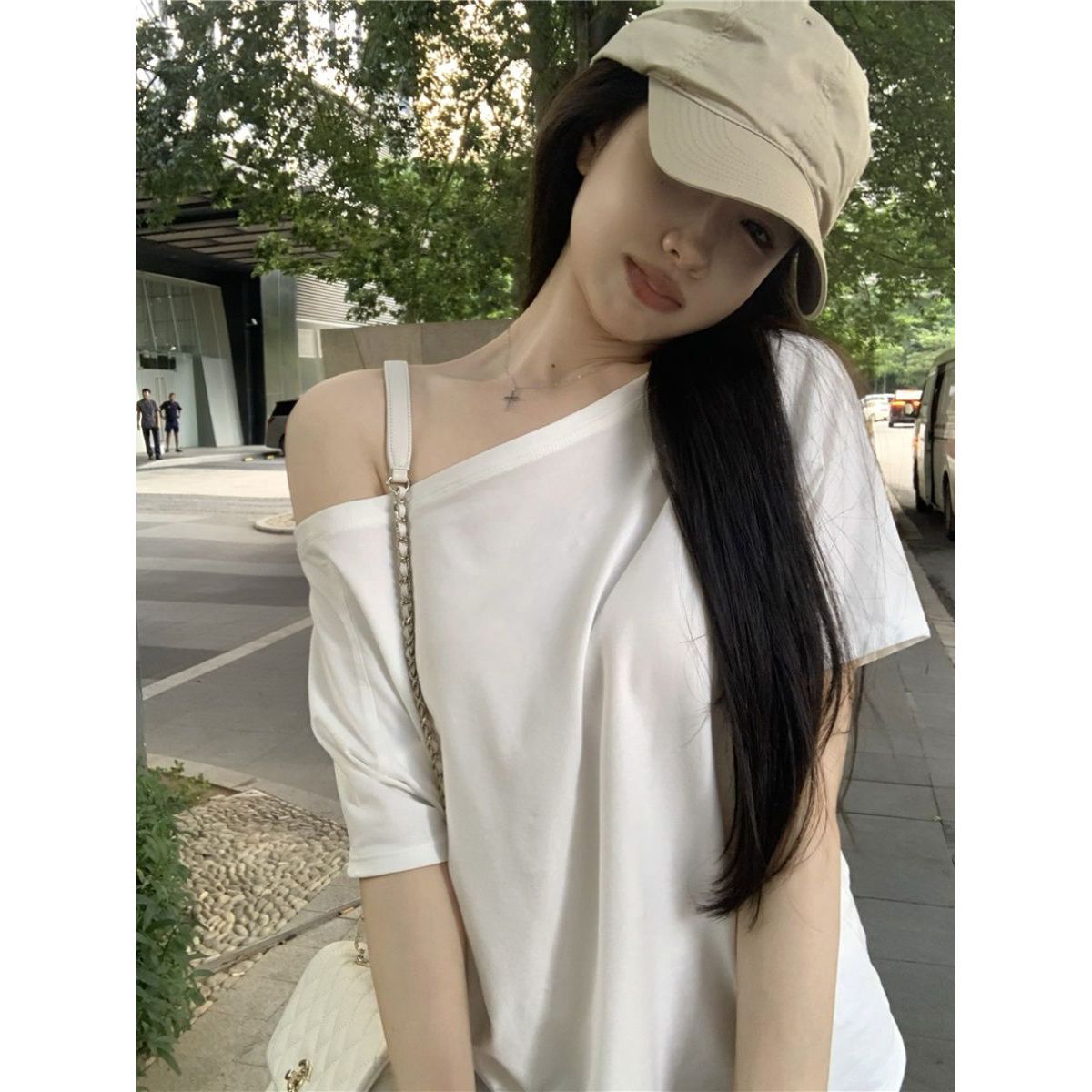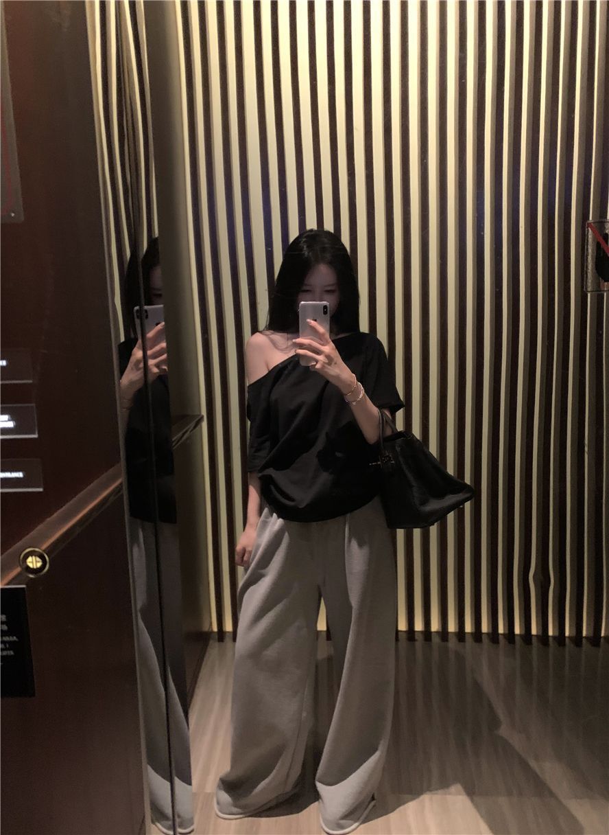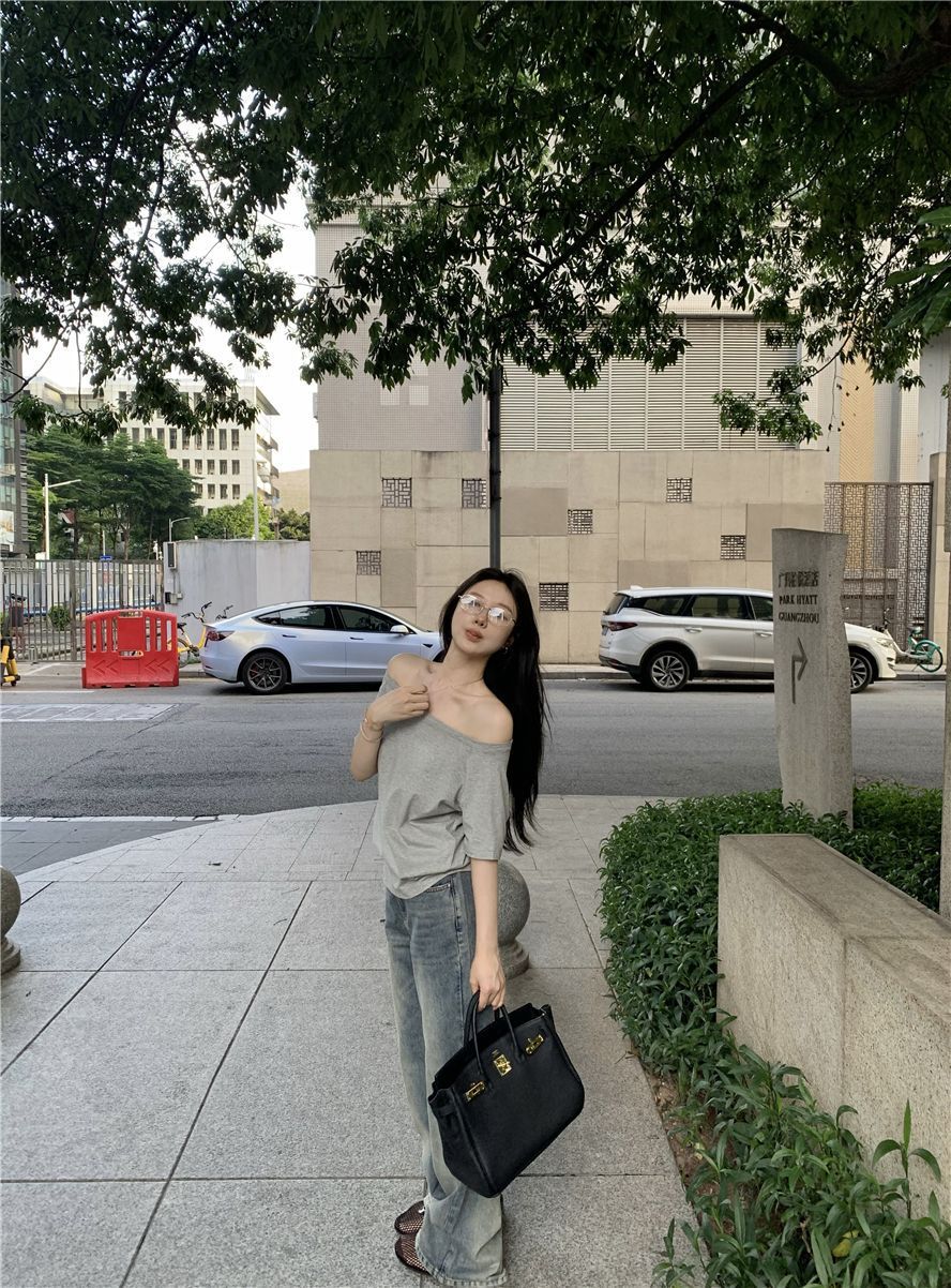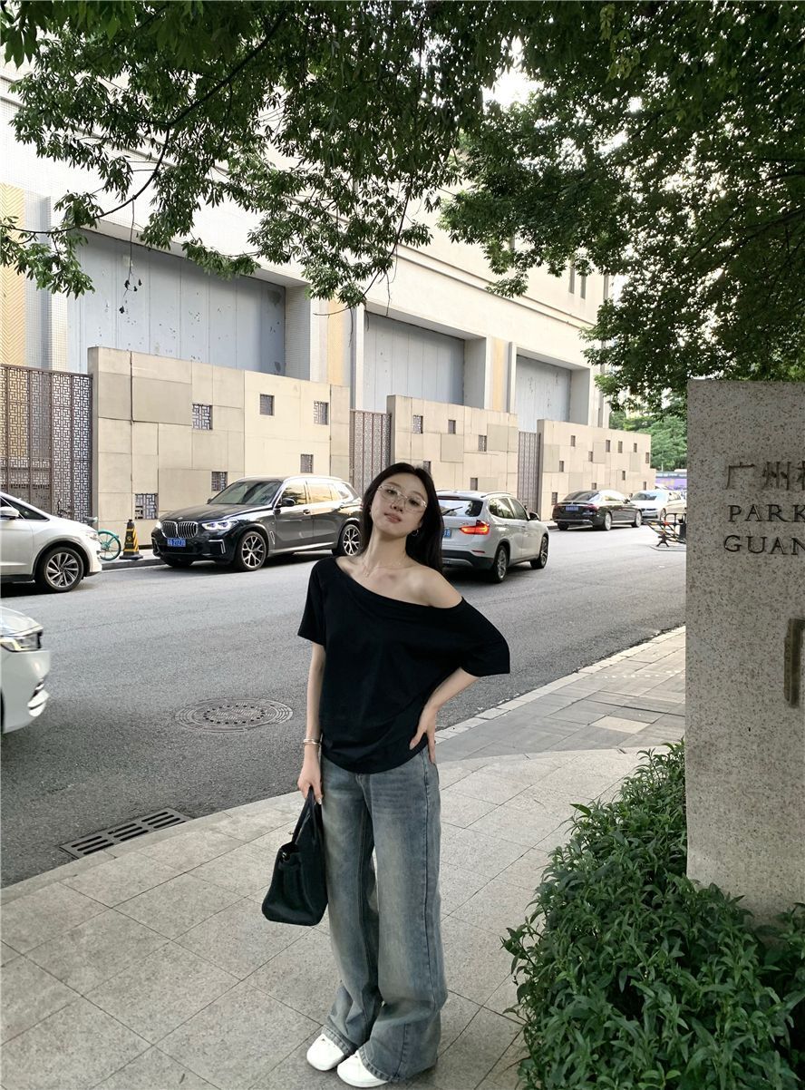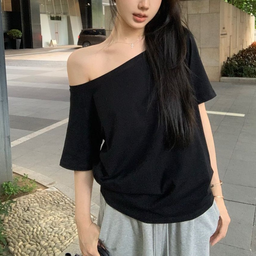 원라인 오프숄더 반팔 여성 티셔츠 2025 신상 여름 캐주얼 게으르고 편안한 불규칙 핫걸 탑스토어 가기