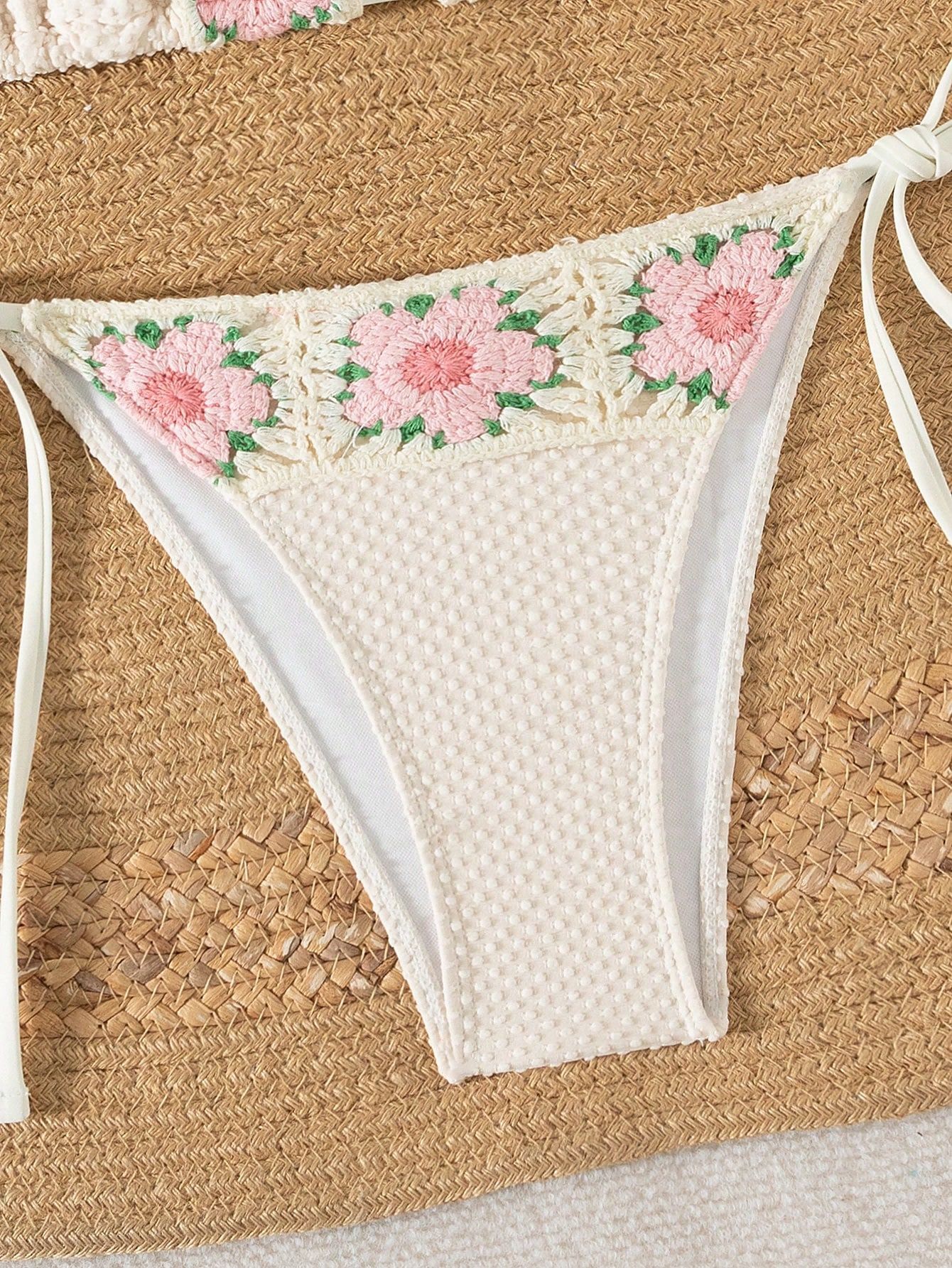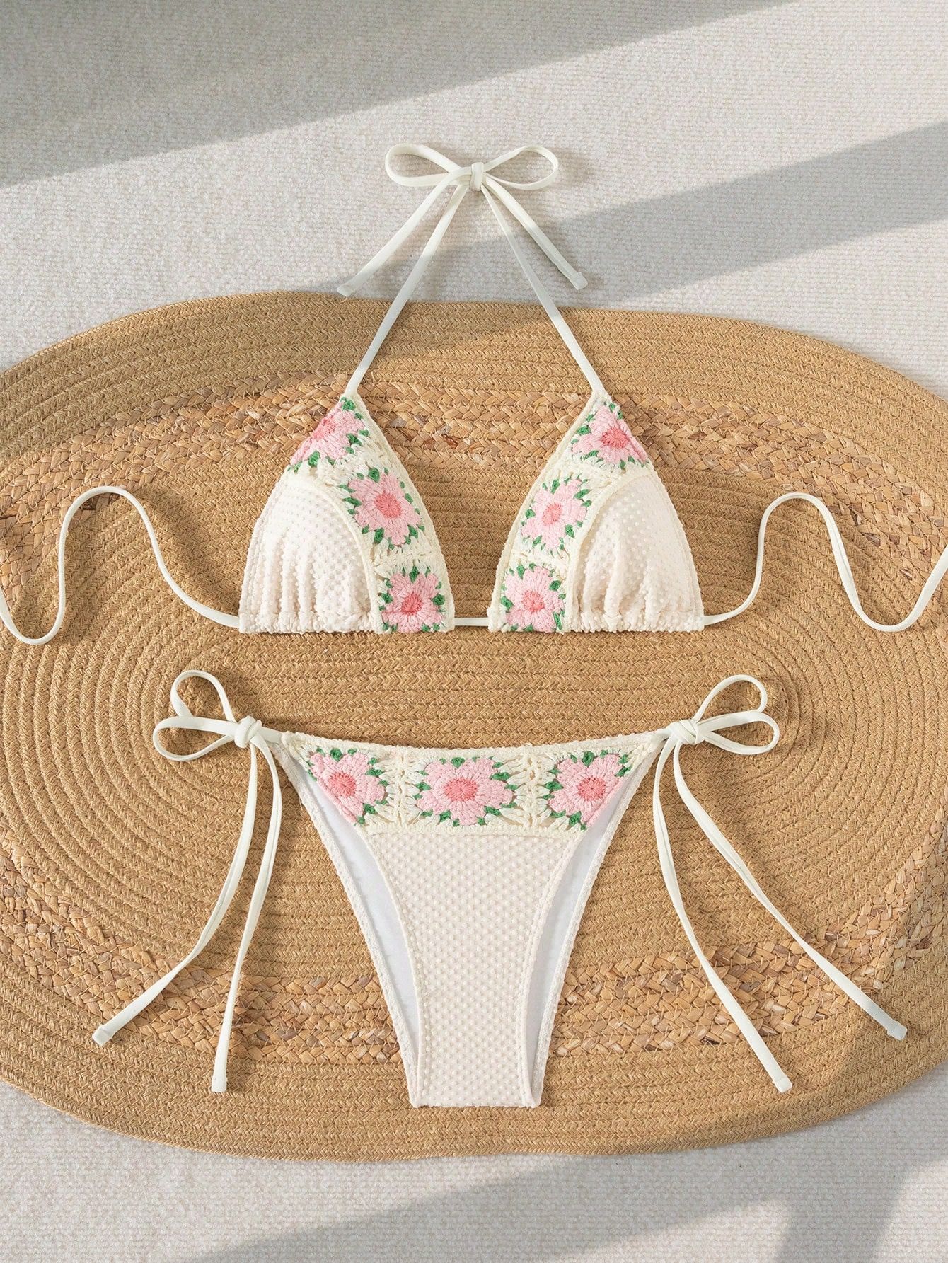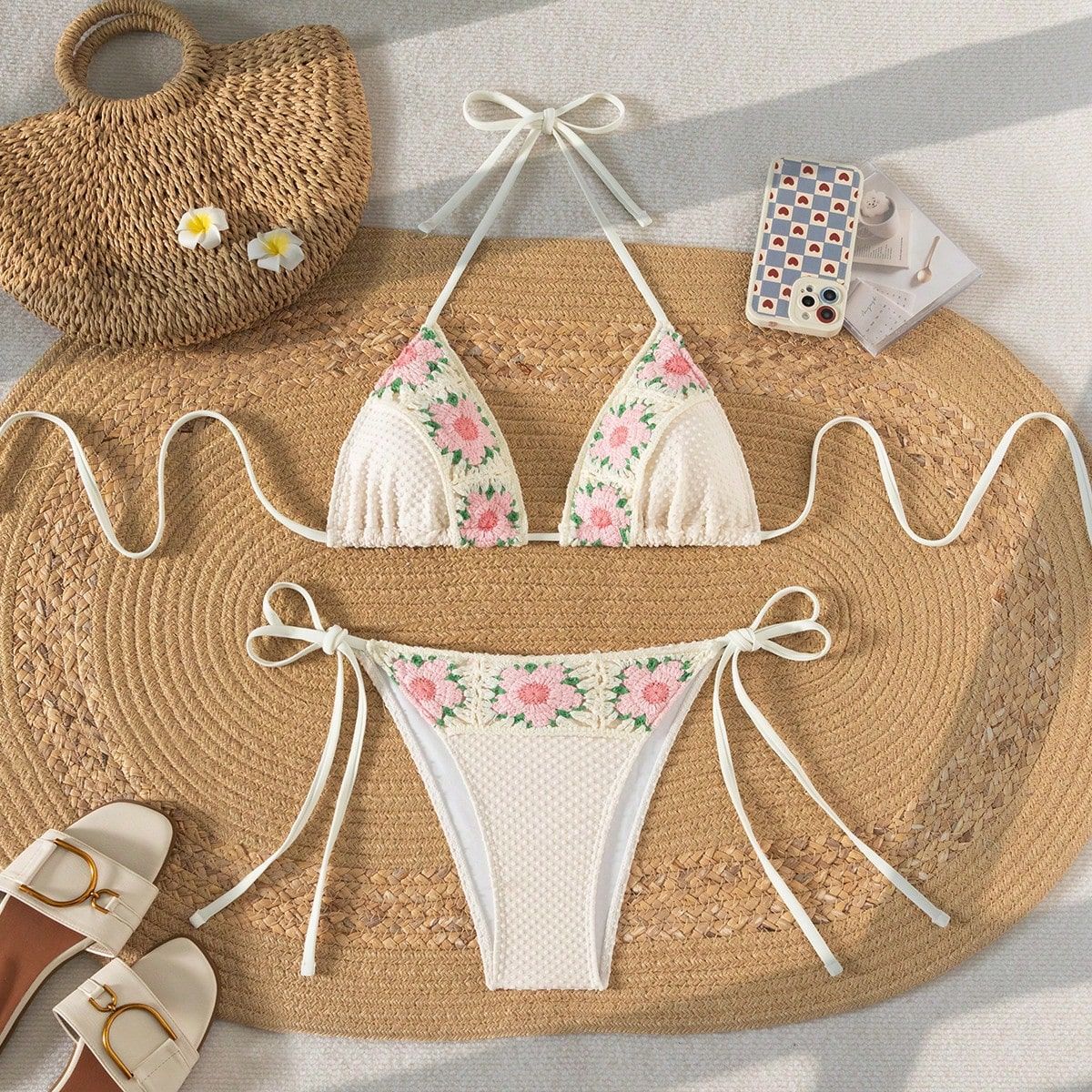 2025 스팟 유럽과 미국의 새로운 솔리드 컬러 핸드메이드 플라워 하이웨이스트 스플릿 수영복 여성 비키니 아마존 크로스보더 수영복