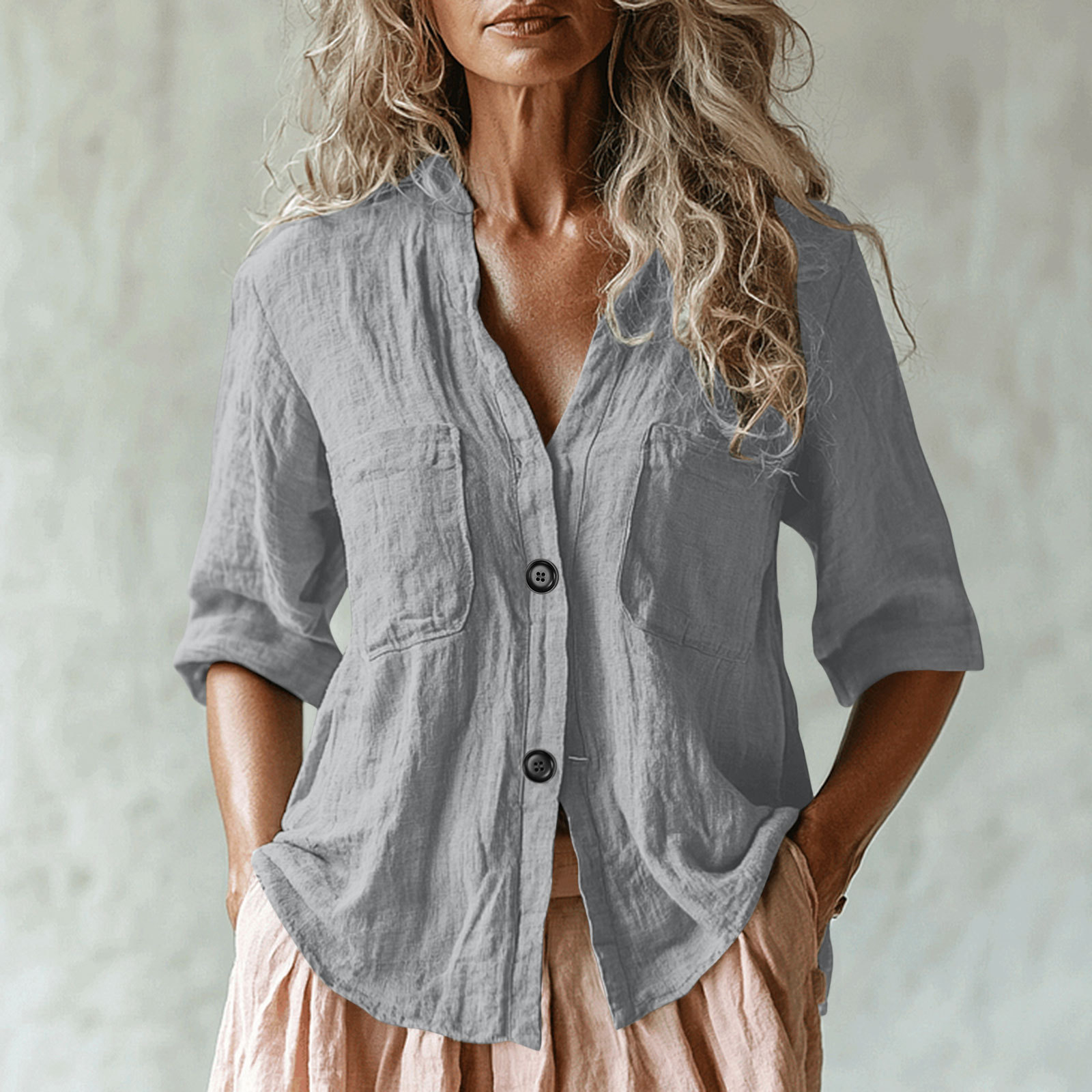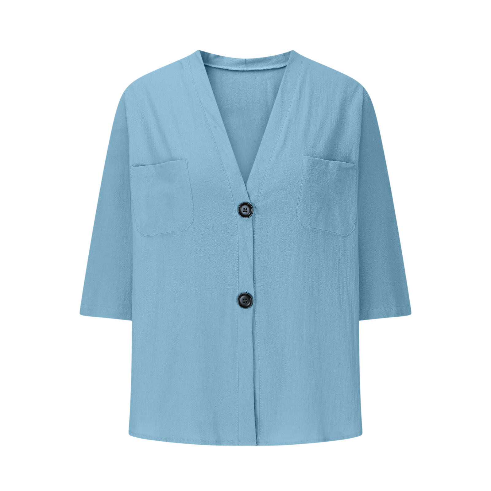 여름 새로운 유럽과 미국의 국경 간 여성 솔리드 컬러 멀티 포켓 린넨 셔츠 7부 소매 캐주얼 루즈 셔츠