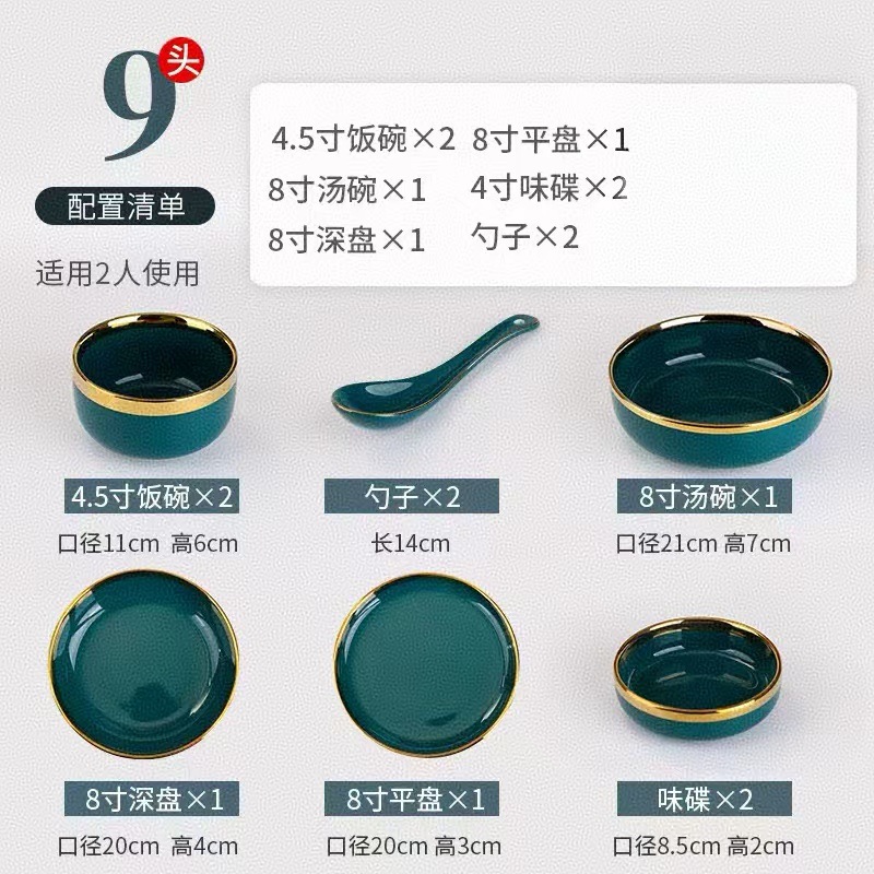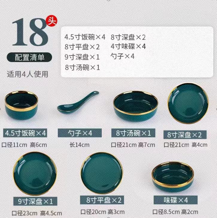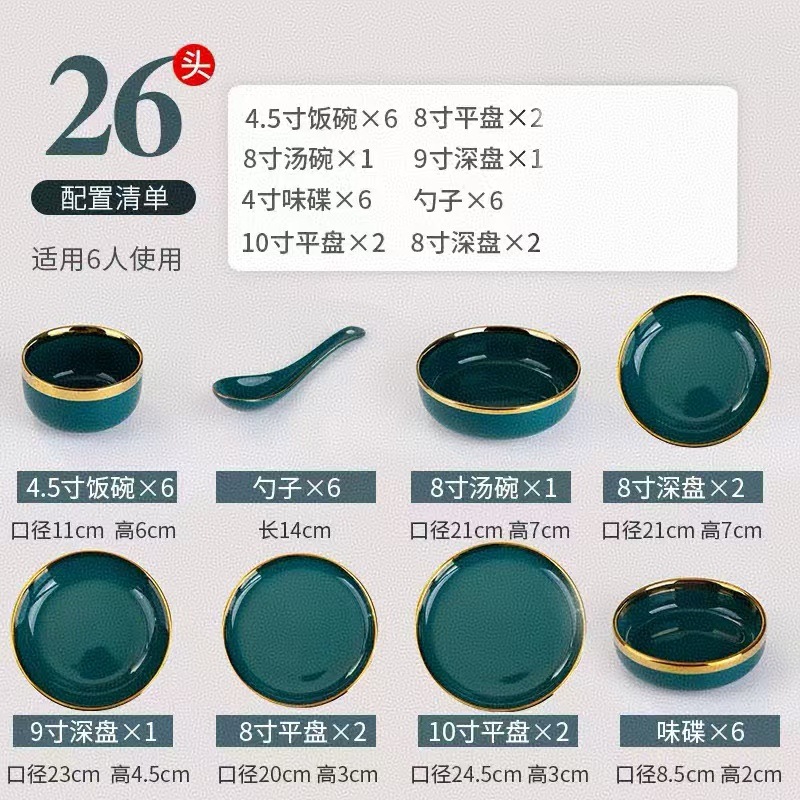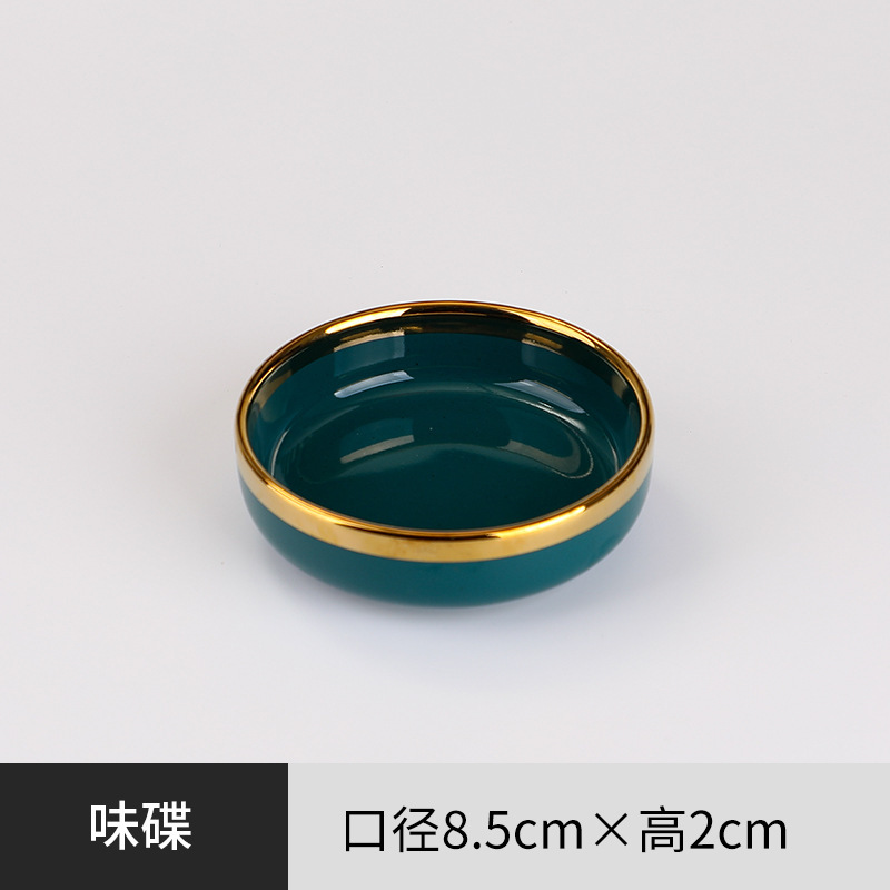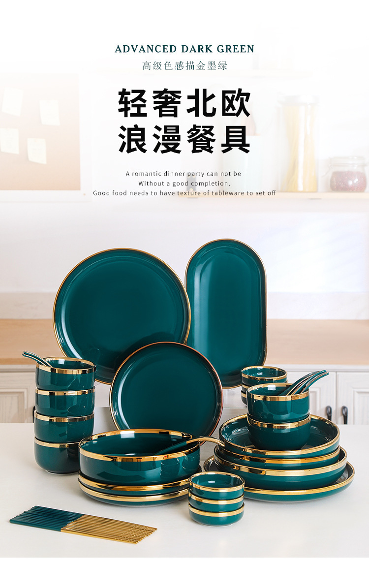피콕 그린 골드 에지 세라믹 식기 크로스 보더 요리 세트 가정용 그릇과 접시 디너 접시 수프 그릇 스푼 도매