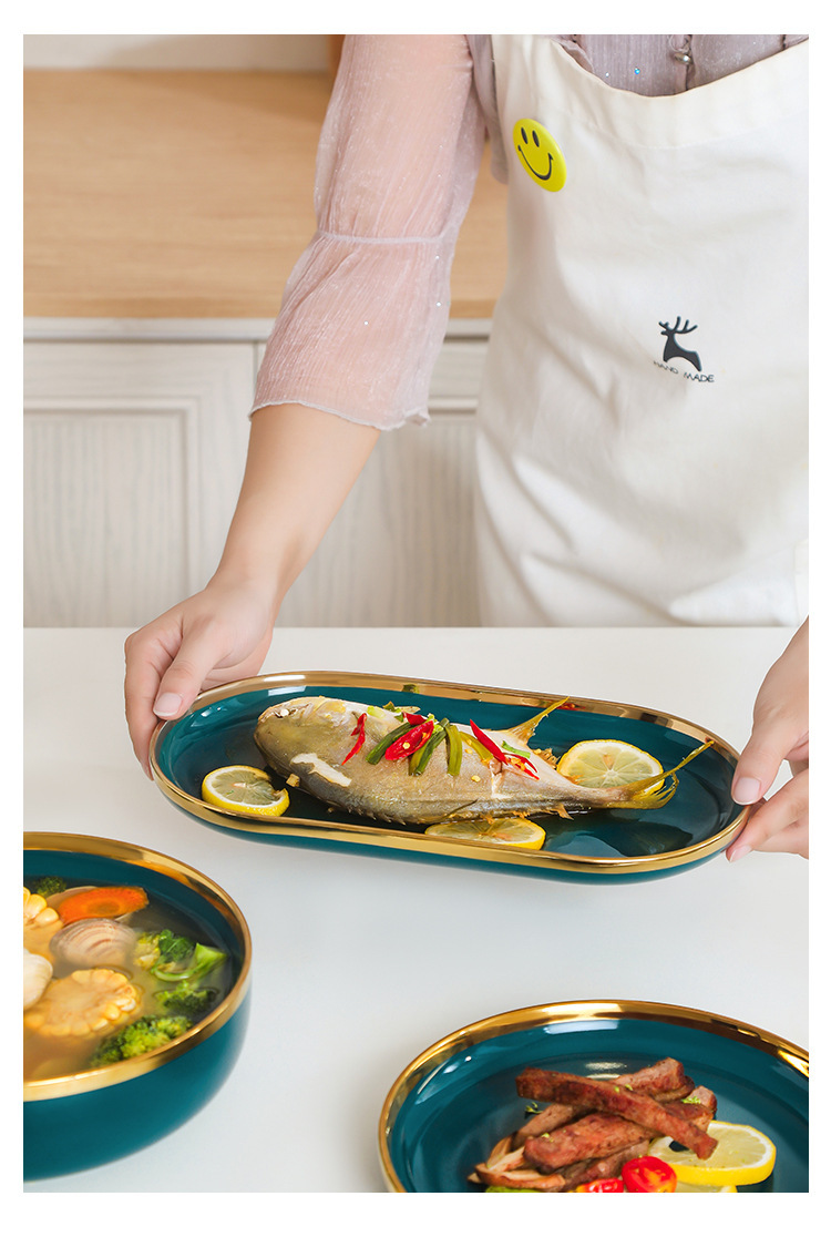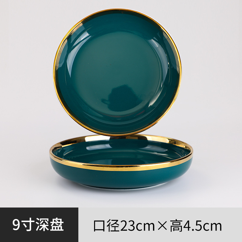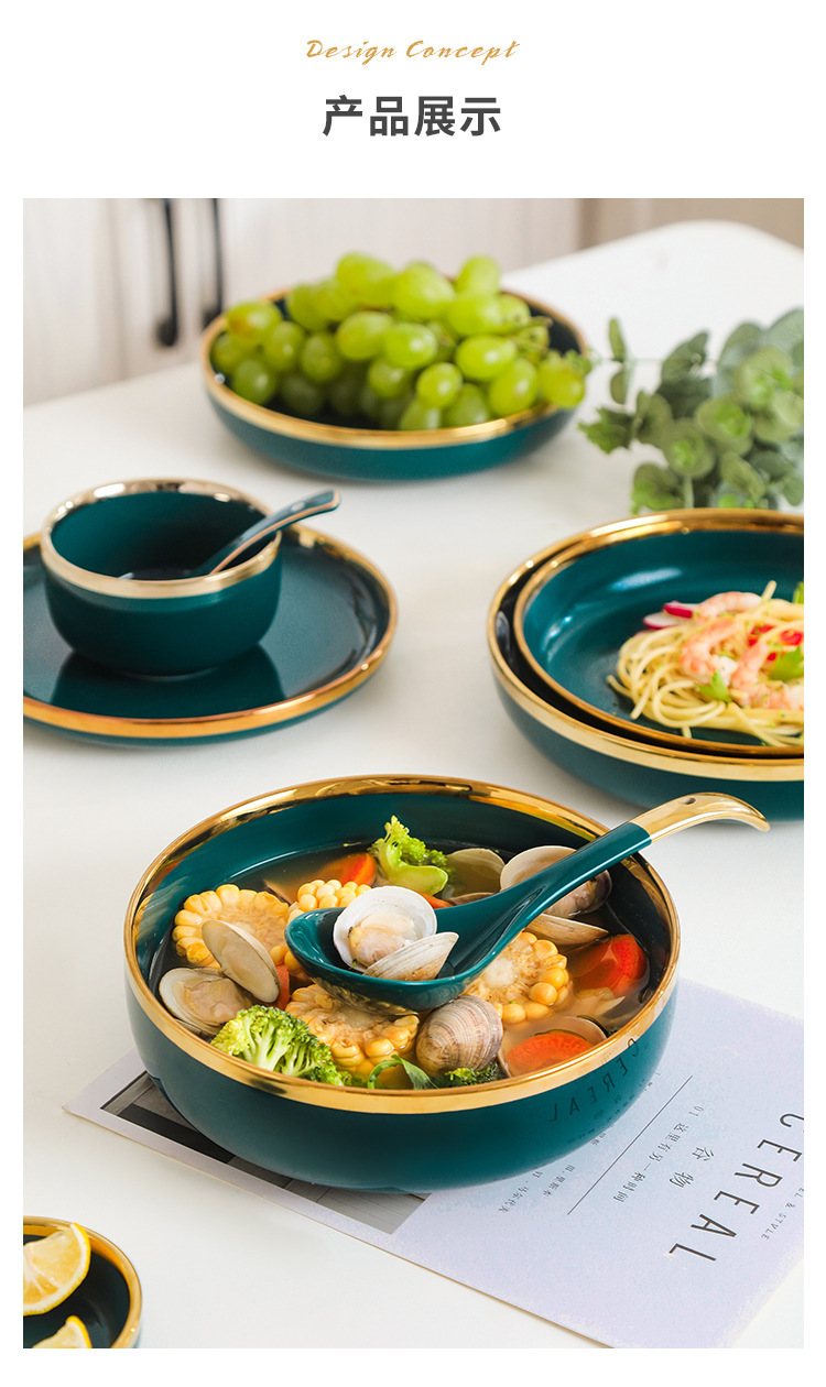 피콕 그린 골드 에지 세라믹 식기 크로스 보더 요리 세트 가정용 그릇과 접시 디너 접시 수프 그릇 스푼 도매스토어 가기